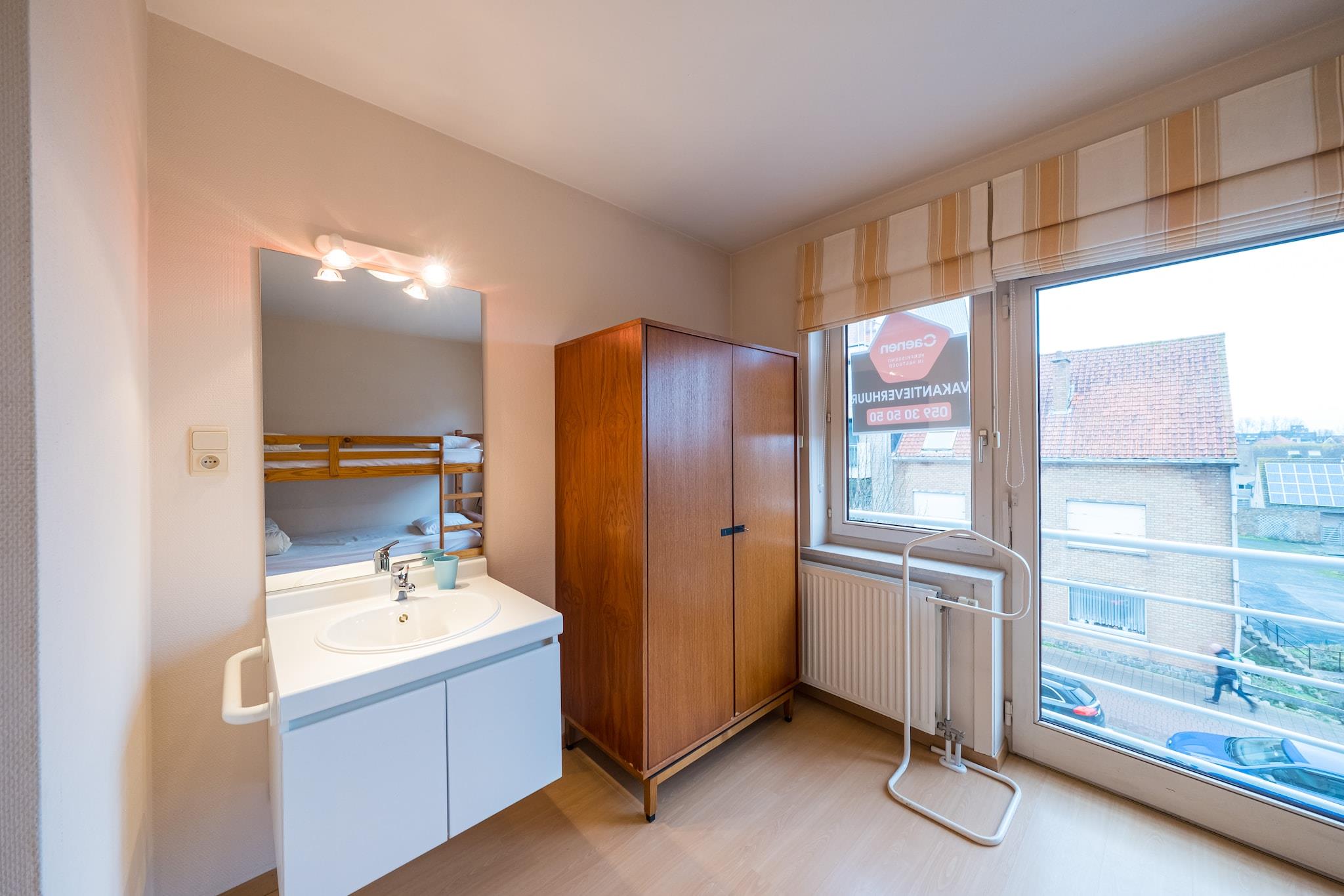 Ljus & blåsig familjekomfort Kliv in i denna inbjudande hörnlägenhet med 2 sovrum i Middelkerke, designad för en avkopplande familjesemester eller en mysig tillflyktsort för par. Vardagsrummet med öppen planlösning badar i naturligt ljus och har en glimt av havet mellan byggnaderna - perfekt för att varva ner efter en dag på stranden. Den rymliga planlösningen inkluderar ett modernt kök, ett ljust badrum med badkar och dusch samt en separat toalett. Den kompakta terrassen erbjuder en charmig plats utomhus där du kan smutta på ditt morgonkaffe eller njuta av en kvällsbris. Idealiskt kustnära läge Undangömd på en lugn gata, bara några steg från den livliga shoppinggatan och den fridfulla strandpromenaden i Middelkerke. Med en fridfull miljö och enkel tillgång till stranden får du det bästa av två världar – lugn och bekvämlighet. Lägenheten har ett privat garage och tillgång till hiss, vilket ger komfort och enkelhet till din vistelse. Oavsett om du promenerar längs strandpromenaden eller njuter av en solnedgång vid havet, inbjuder läget dig att sakta ner och njuta av kusten. Matställen i närheten och dagsutflykter Ät middag på brasserier vid stranden, upptäck det lokala belgiska köket eller utforska närliggande pärlor som Brygge (40 km), Plopsaland (30 km) eller Westgolfbanan (5 km). Sugen på ett plask? Inomhuspoolen Vita Krokodiel ligger bara 3 km bort. Även om husdjur inte är tillåtna, garanterar bekvämligheterna och attraktionerna i närheten en minnesvärd och avkopplande vistelse för alla gäster.