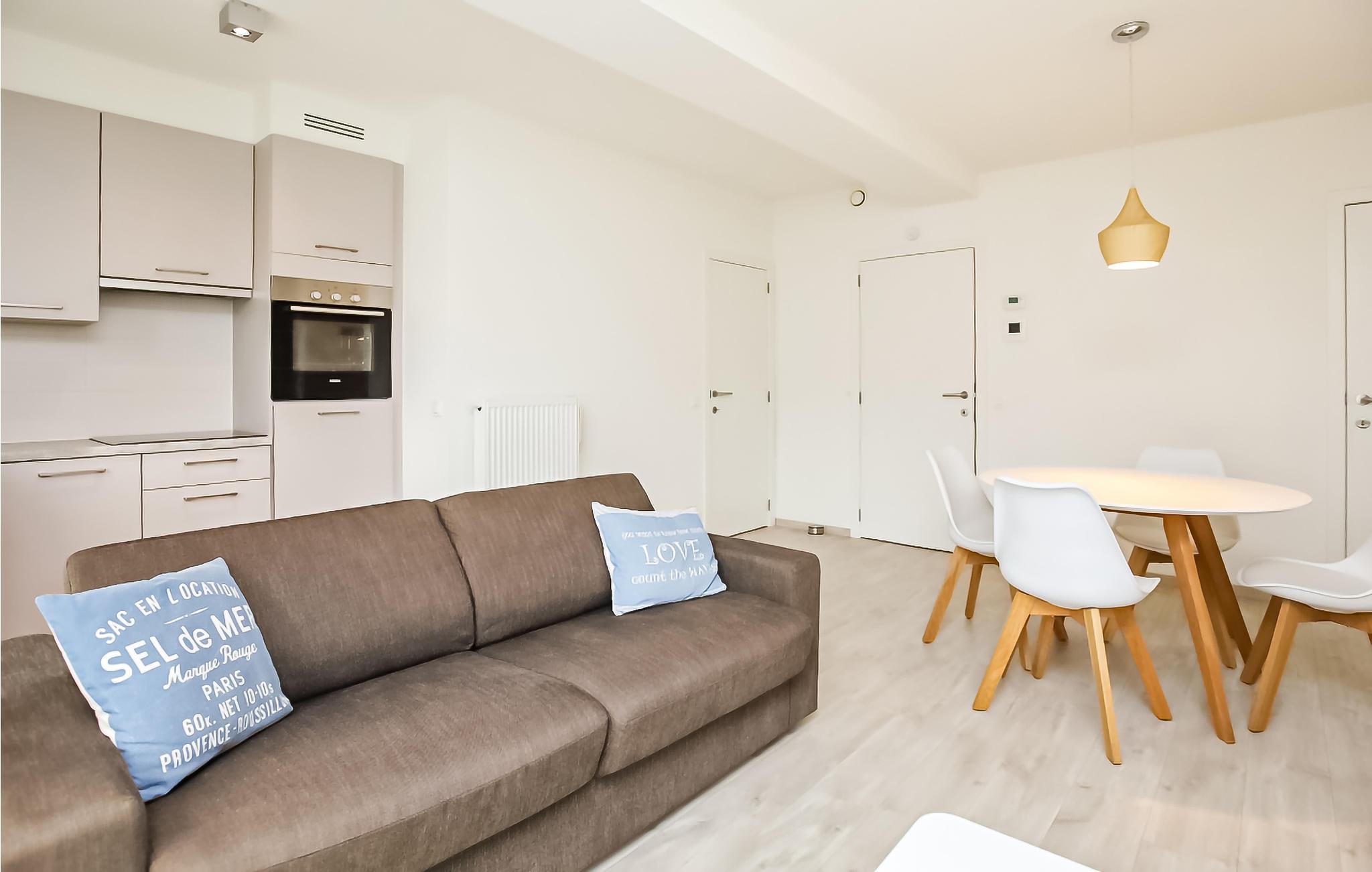 Lägenheten är smakfullt inredd i en modern och ljus stil och lämpar sig väl för en semester för ett par eller en liten familj. Fönstren från golv till tak släpper in mycket ljus i det mysiga vardagsrummet med öppet pentry och matplats. Här kan du koppla av efter en lång dag med aktiviteter. Två av de fyra sovplatserna ligger också här. De andra två sovplatserna finns i det vackra sovrummet. Det finns också ett modernt badrum till ditt förfogande. På sommaren (från början av juli till slutet av augusti) lockar den vackra gemensamma poolen till svalka.