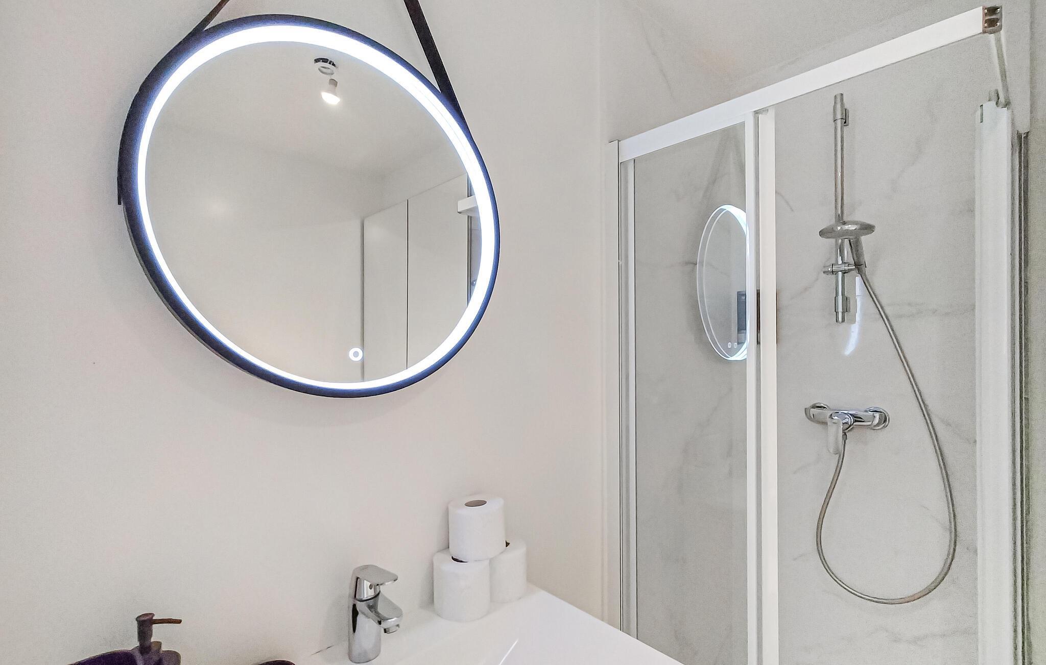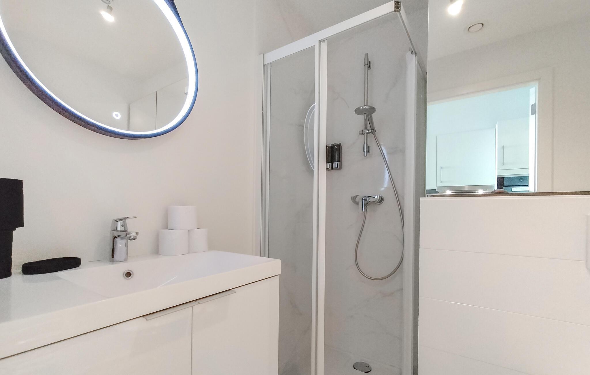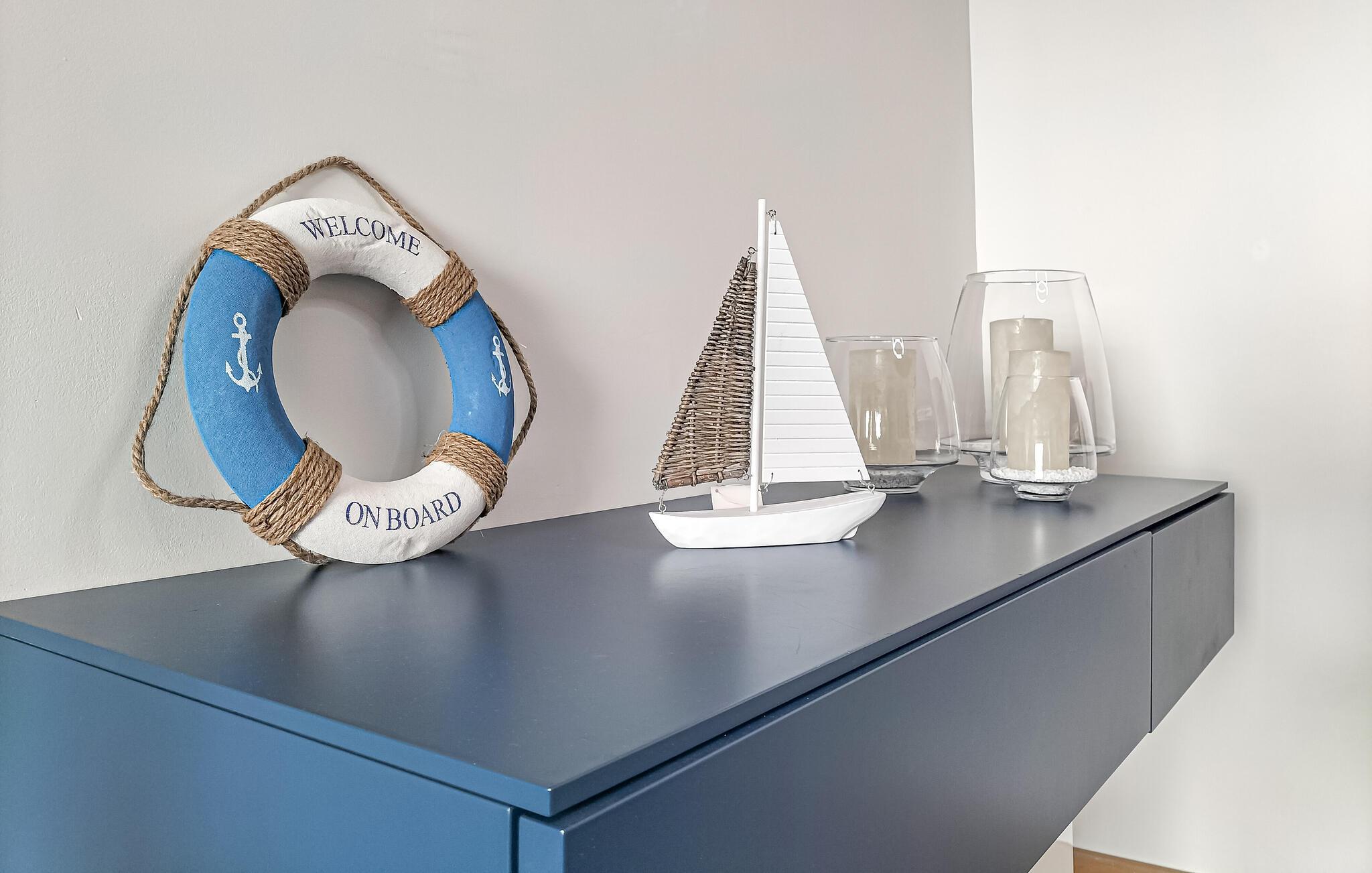 Denna lägenhet imponerar med sin eleganta design och klara, harmoniska möbler. Det ljusa köket med eleganta fronter och ett varmt trägolv erbjuder allt du behöver för att laga mat tillsammans på kvällen, medan det mysiga vardagsrummet med soffa inbjuder dig att koppla av. Efter en dag vid havet kan du koppla av här med ett glas vin, läsa en god bok eller avnjuta en kvällsmåltid tillsammans i en mysig atmosfär.