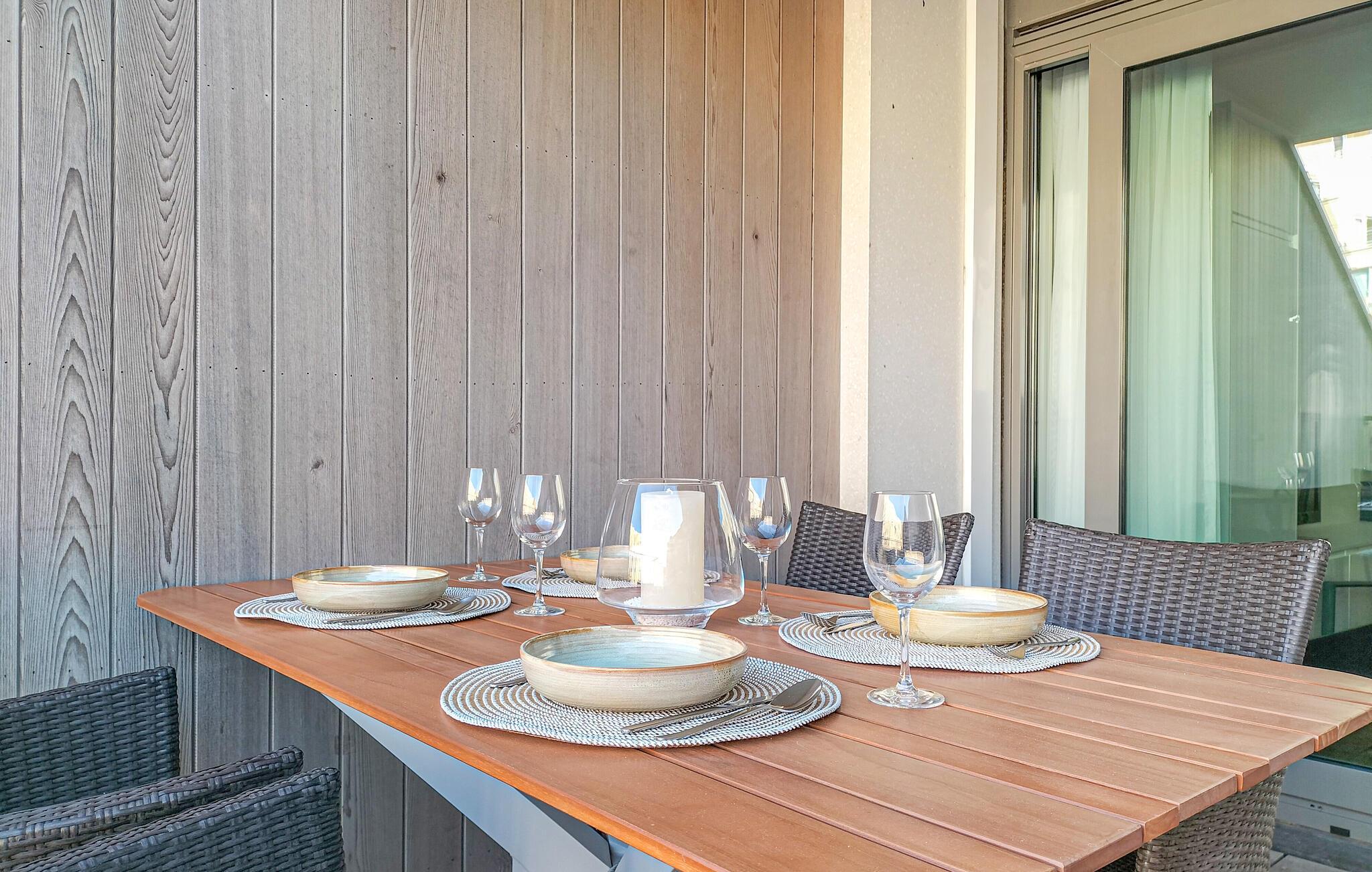 På den eleganta terrassen kan du njuta av mysiga timmar i den friska havsluften. Börja dagen med frukost utomhus eller koppla av på solstolen med en god bok och en kopp kaffe. På kvällen är terrassen den perfekta platsen för att avnjuta en måltid med ett glas vin och se solen gå ner över hustaken.