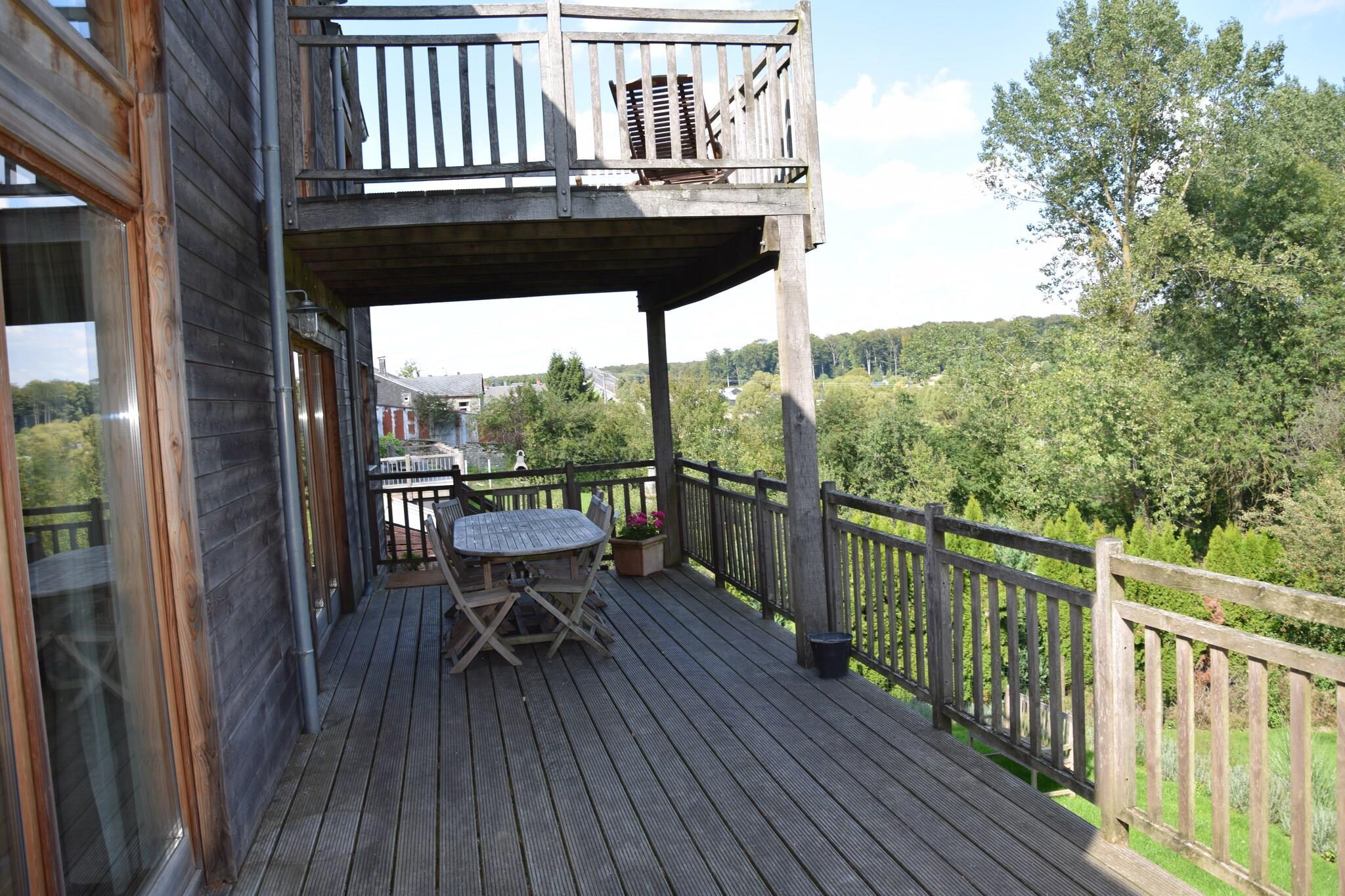 Detta fritidshus ligger på en fastighet på 76 hektar i det gröna hjärtat av skifferregionen. Det är en kombination av två separata hus, vilket gör den idealisk för grupper och familjer. Under konstruktionen har man använt högkvalitativa naturmaterial. På bottenvåningen finns två välutrustade ekkök, som är så ordnade att du enkelt kan laga stora middagar. Den eleganta och rymliga vardagsrummet består av ett vardagsrum och en matsal med vedspis i mitten. På första våningen finns fyra stora sovrum och två badrum och på andra våningen finns ett mysigt loungemöte där du kan dra in själv. Det finns två mezzaniner, som uppgår till ytterligare 2 sovrum. På trädgårdsplan finns ett lekrum och rekreationsrum med TV, där både unga och gamla kan njuta av sig, till exempel att spela bordfotboll. Vill du koppla av och varva ner, kan du göra det i jacuzzin eller bastun. I huset finns två terrasser och en täckt terrass med grill, teakmöbler, alla med fantastisk utsikt över Les Vateauxs landsbygd. Bakom huset strömmar en liten flod.