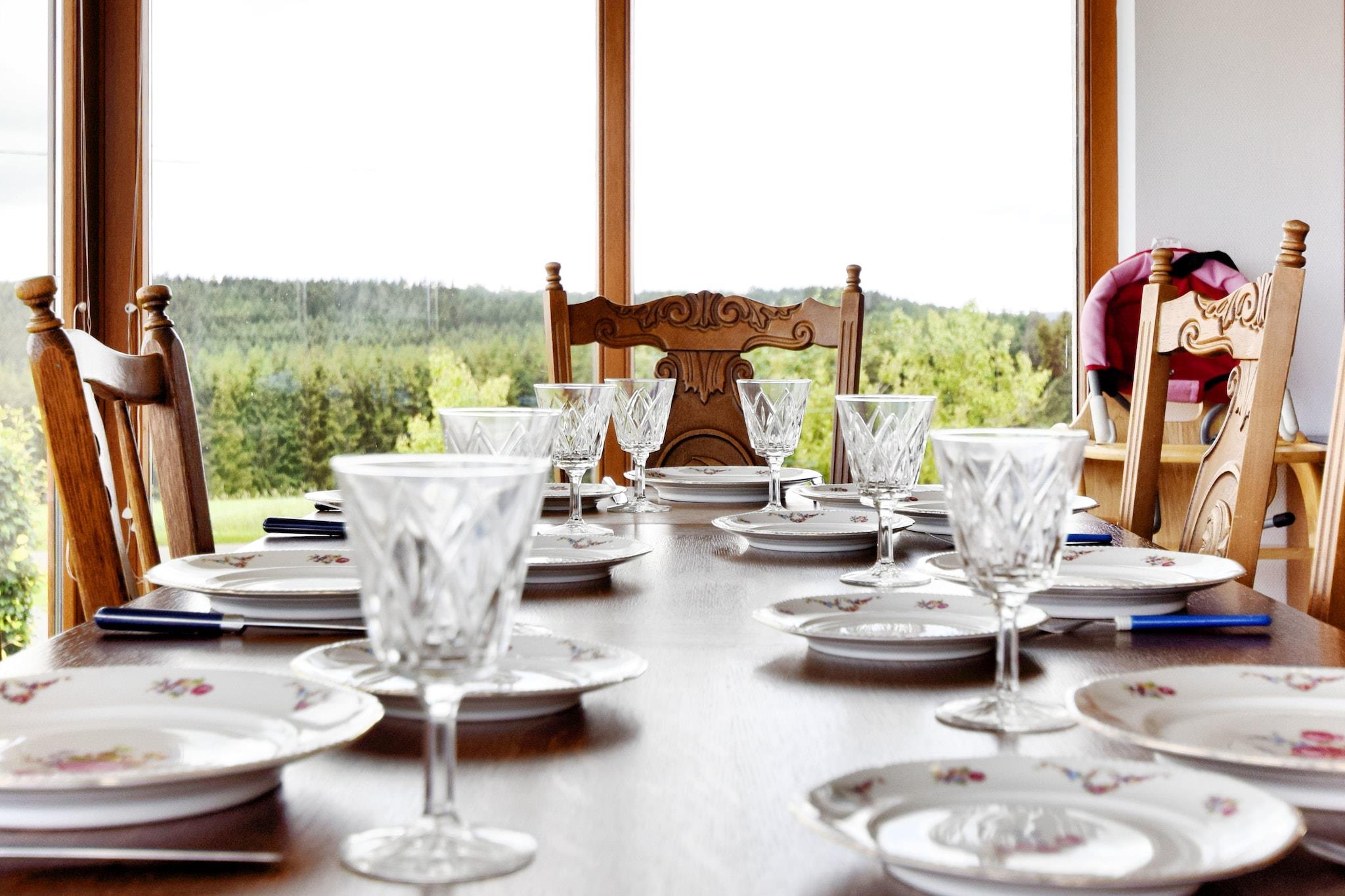 Bottenvåningen: (Hall, Kök(spis(Spis med 5 kokplattor, gas), kaffebryggare, ugn, mikrovågsugn, kyl och frys), ardags- och matrum(TV, Braskamin), badrum(badkar, dusch, handfat), WC, inglasat uterum) På våning 1: (sovrum(dubbelsäng), sovrum(dubbelsäng), sovrum(2x enkelsäng), sovrum(3x enkelsäng), WC(handfat)) diskmaskin, värme(central), terrass, trädgård(delad med den ägaren och andra gäster), grill, parkering, studsmatta, lekplats, rutschkana