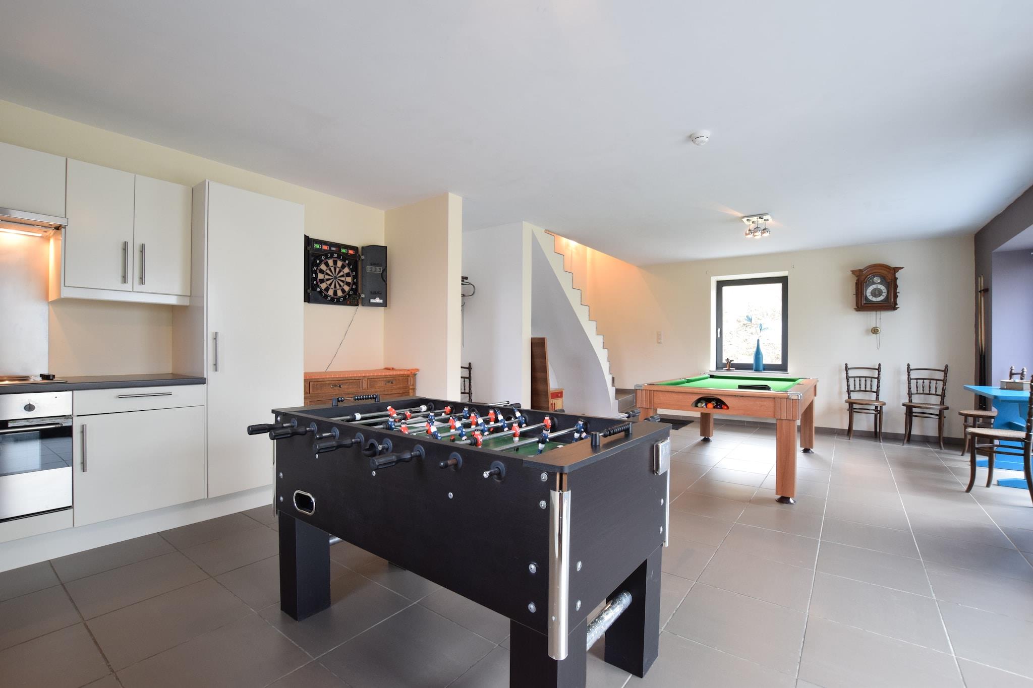 Fly till denna idylliska stuga med 8 sovrum i Vaux-sur-Sûre, en rymlig fristad för upp till 18 gäster i hjärtat av de belgiska Ardennerna. Med en privat bastu och bubbelbad utomhus är det den perfekta miljön för avkoppling efter en dag av sightseeing. Den mysiga interiören och generösa layouten gör den idealisk för stora familjer eller grupper som söker komfort och anslutning. Stugan är omgiven av lummig natur och erbjuder enkel tillgång till skogsstigar (5 km), längdåkningsleder (6 km) och en naturskön sjö (25 km). De närliggande städerna Durbuy, La Roche och Bastogne erbjuder charmiga dagsutflykter, medan stadens centrum, bara 9 km bort, erbjuder butiker, restauranger och lokala pubar. Oavsett om du vandrar, är på sightseeing eller bara kopplar av är platsen en naturälskares dröm. Tillbaka i stugan, njut av måltider på den möblerade terrassen, elda upp grillen eller utmana vänner på bordsfotboll, biljard eller dart. Barnen kommer att älska lekredskapen och boulebanan, och parkering finns på plats. Med utrymme, stil och lugn, utlovar denna reträtt en oförglömlig gruppresa.
