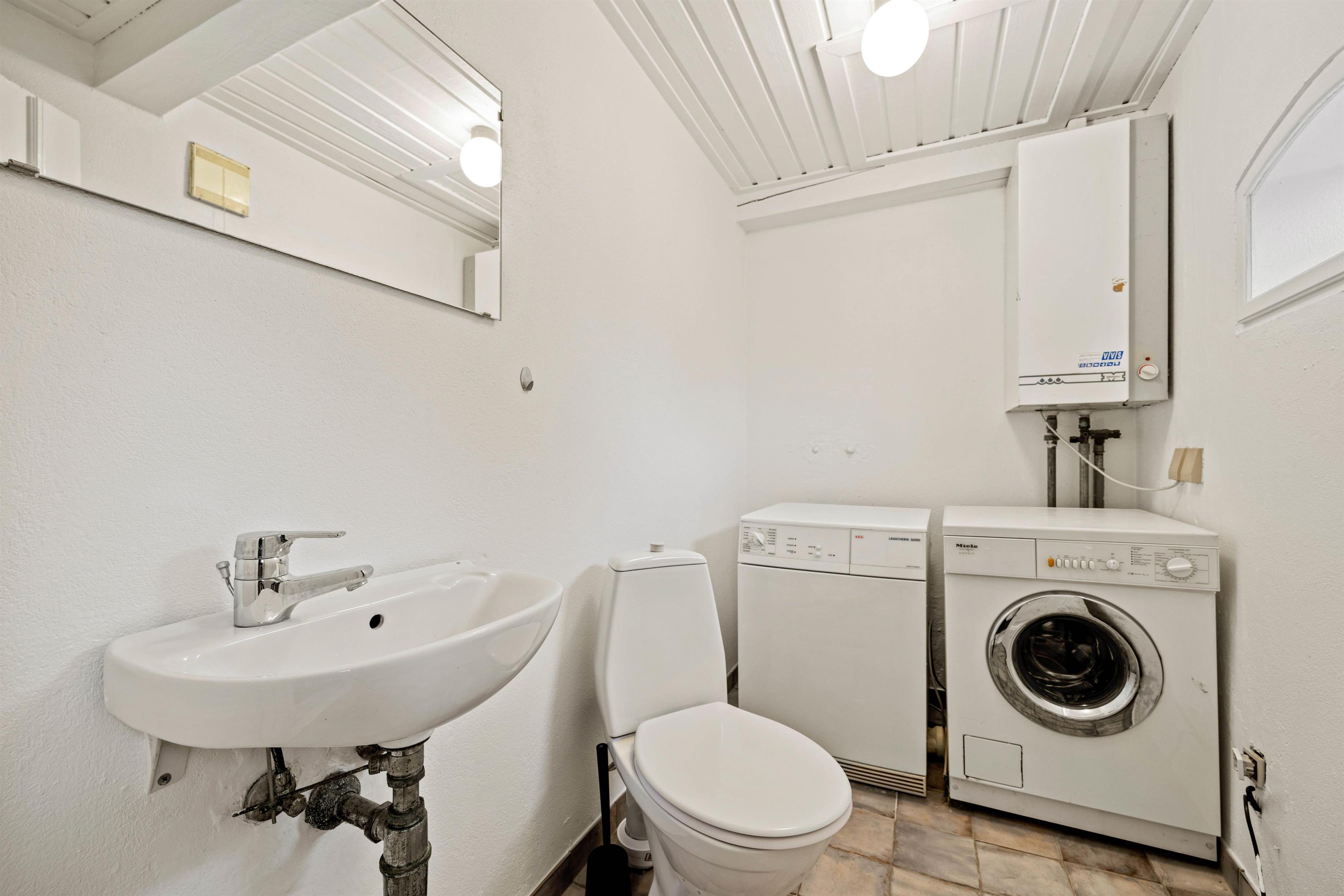 The holiday home has a spacious bathroom with a shower and, conveniently, a separate WC. There are three bedrooms in the house. Two bedrooms feature double beds, while the third room has twin beds.