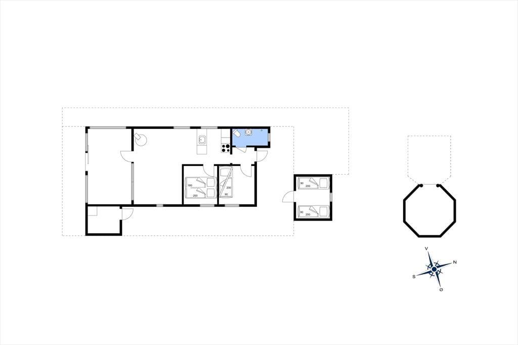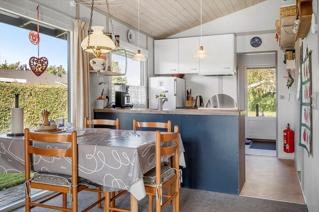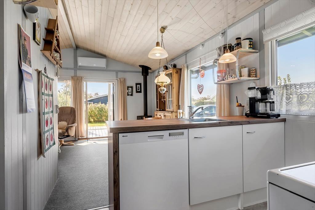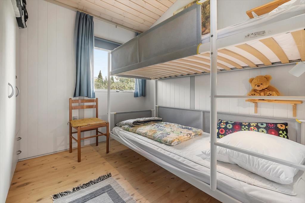 Die offene Küche ist ausgestattet mit Kühlschrank, Herd mit Backofen sowie Geschirrspüler. Außerdem befindet sich im angebauten Schuppen eine Gefriertruhe, und hier stehen Ihnen auch zwei Fahrräder zur Verfügung. Das Haus verfügt über zwei Schlafzimmer – eines mit Doppelbett (180x200), ein weiteres mit einem Etagenbett (90x200) – sowie ein Annex mit zwei Einzelbetten (90x200).