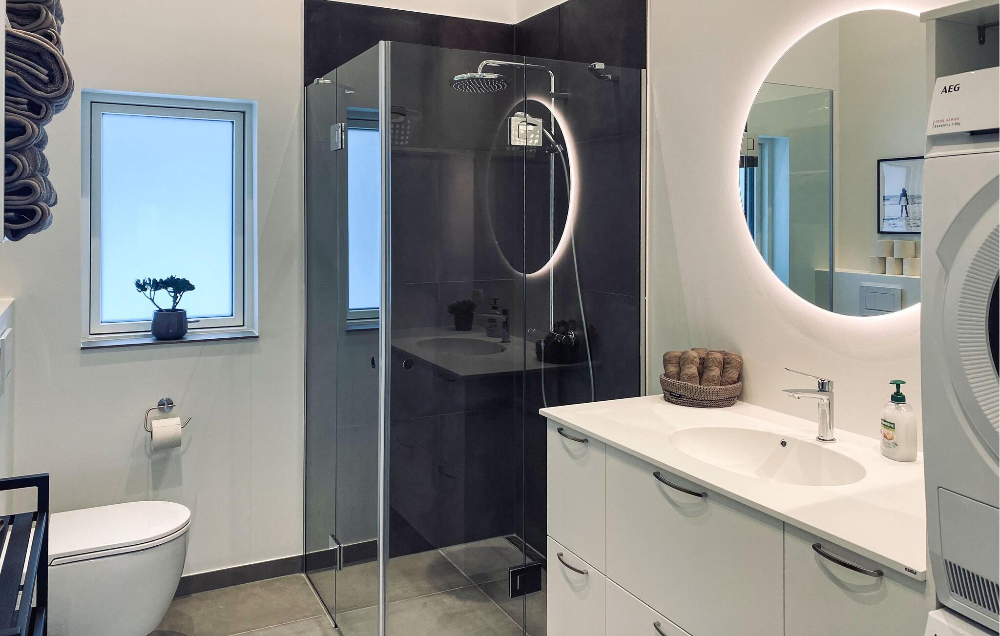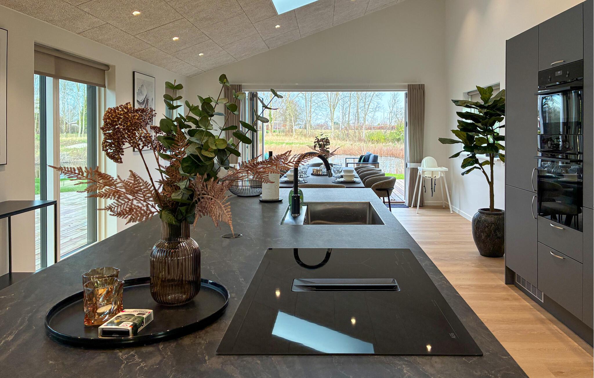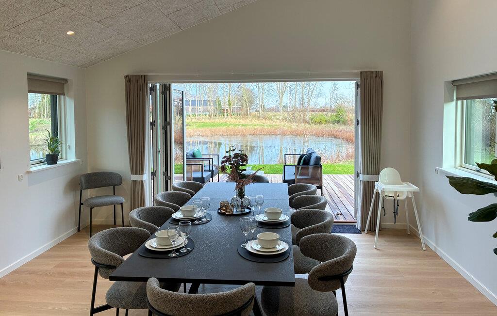 Njut av den trevliga atmosfären i den öppna planlösningen. Slå dig ner i de bekväma sofforna och njut av utsikten över grönskan. Högt i tak, dämpade färger och utvalda material skapar en lugn och elegant atmosfär. Använd det långa matbordet för gemensamma måltider eller långa kvällar med socialt umgänge. Förbered dina måltider i det högkvalitativa köket med matlagningsö och moderna apparater. Du kan också spela ett parti biljard i aktivitetsrummet med utsikt över vattnet.