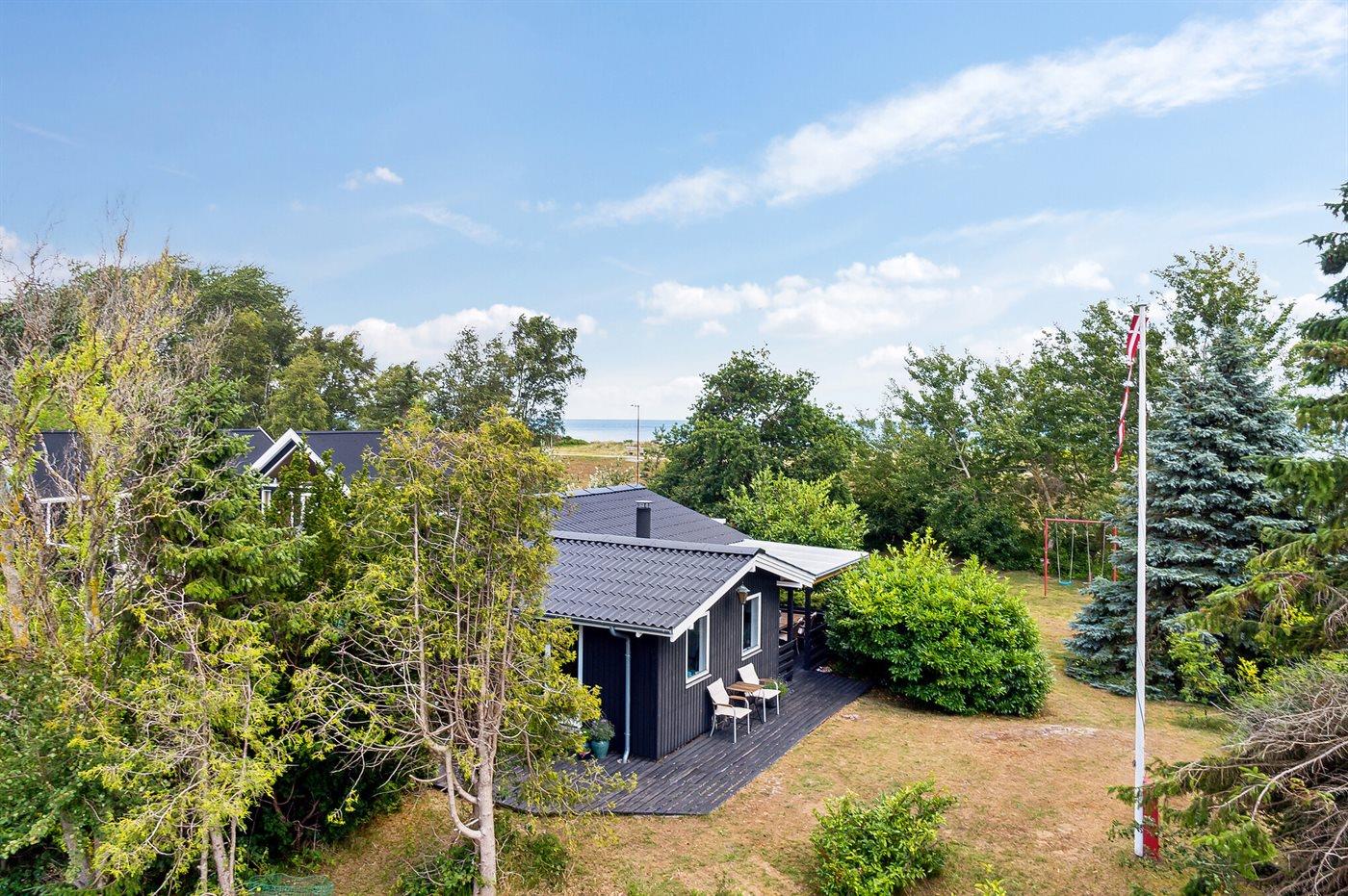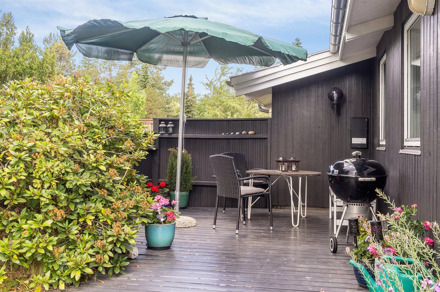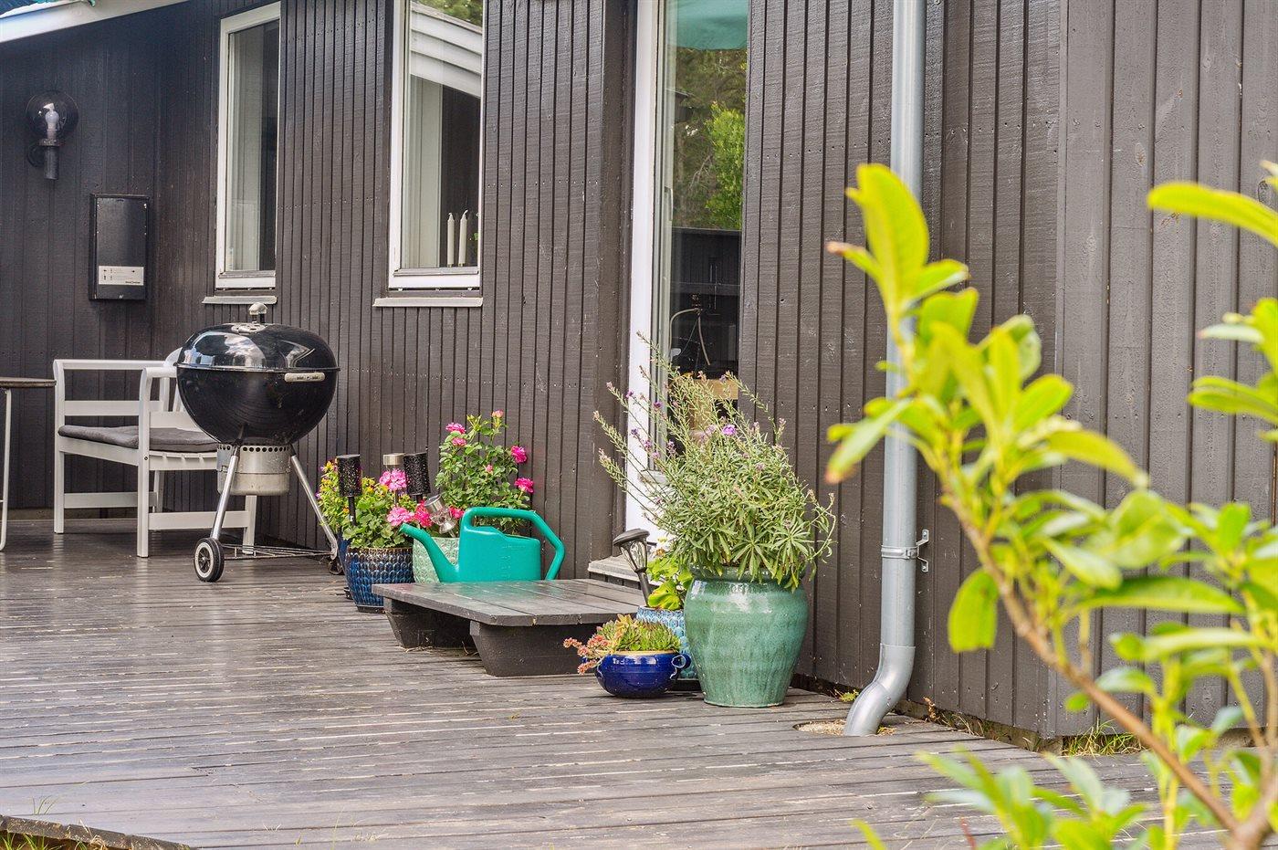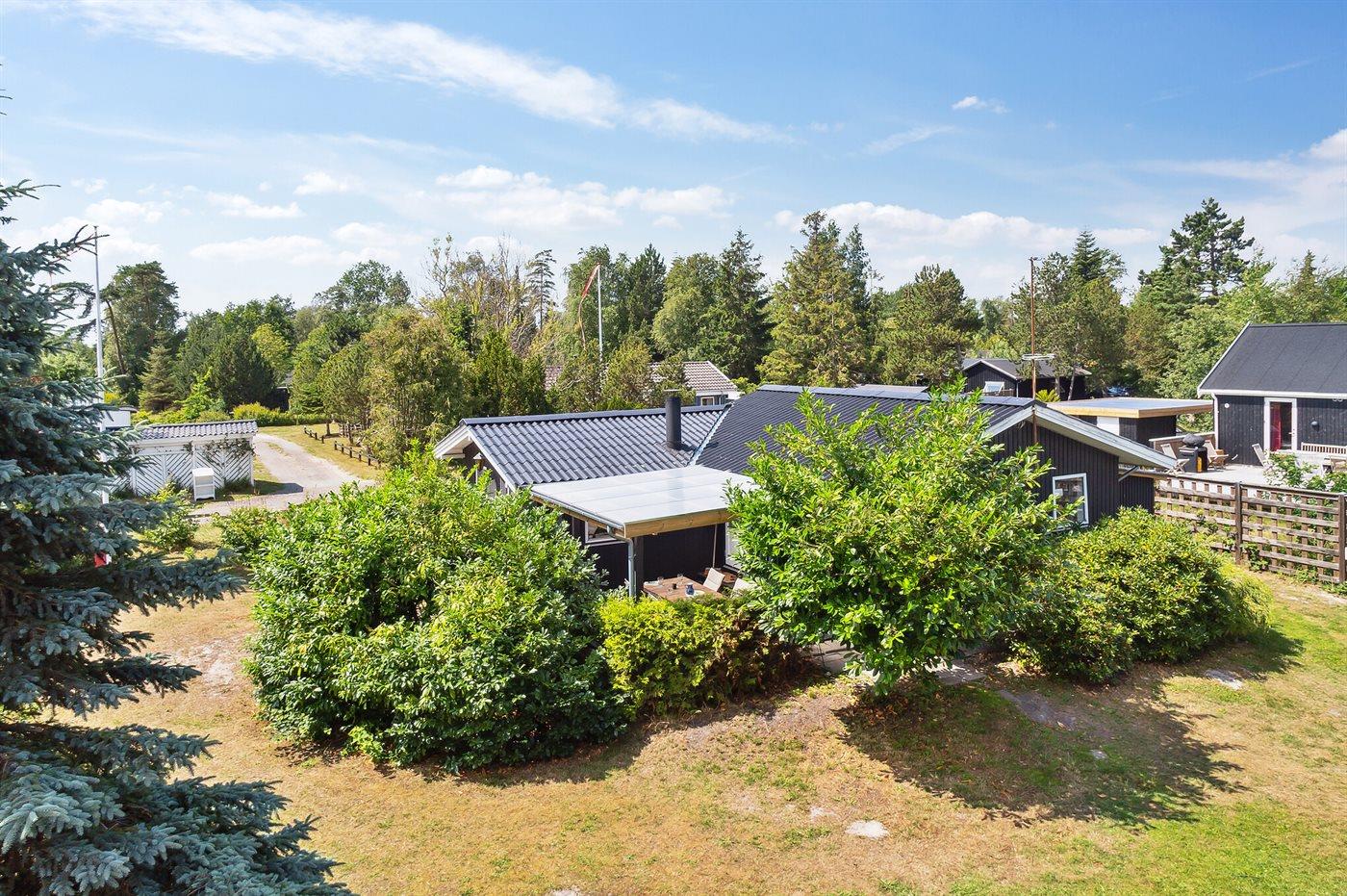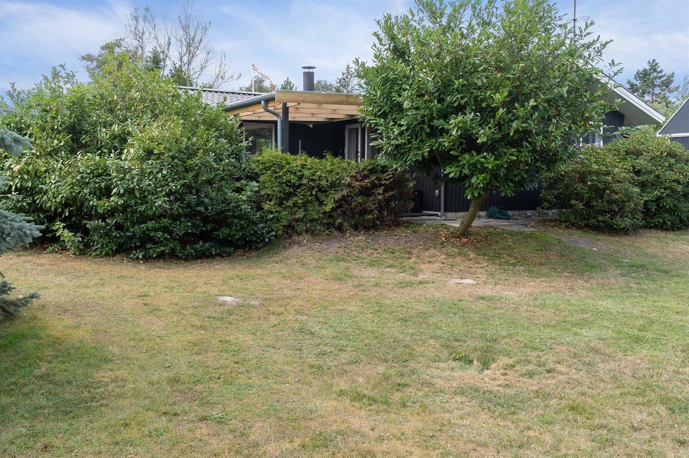 Fritidsbostaden ligger på en 1021 m² stor anlagd trädgård. Avstånd till hav är 10 m. Närmeste affär ligger på ett avstånd av 5000 m. Till fritidsbostaden hör 20 m² terrass. Dessutom finns det 14 m² övertäckt terrass. Gunga. Det finns grill til förfogande. P-plats på tomten.