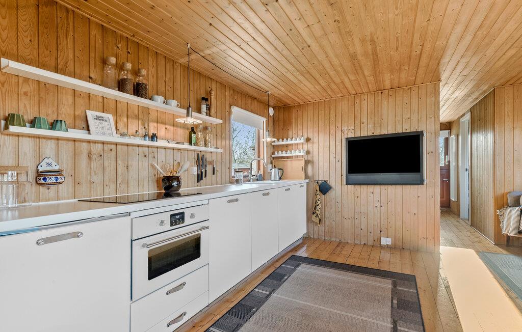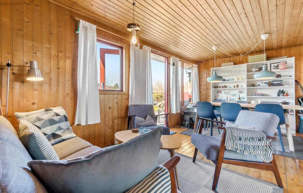 Välkommen till ert semesterhus, som bara ligger en kort promenad från närmaste strand. Tillbringa avkopplande timmar i det mysiga vardagsrummet med bekväma sittplatser och direkt tillgång till terrassen. Köket med öppen planlösning är praktiskt utformat och inbjuder till matlagning tillsammans. Det finns plats för hela familjen vid det vackra matbordet, perfekt för spelkvällar eller måltider tillsammans. Den varma trätonen i inredningen skapar en mysig atmosfär där du omedelbart kommer att känna dig som hemma.