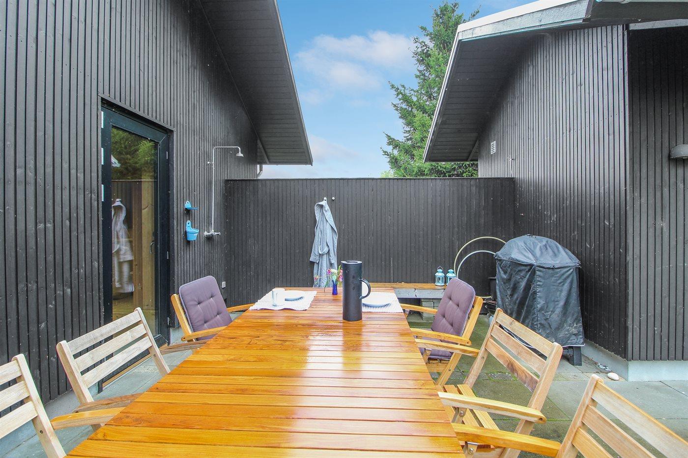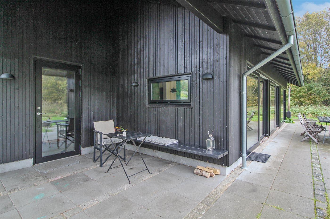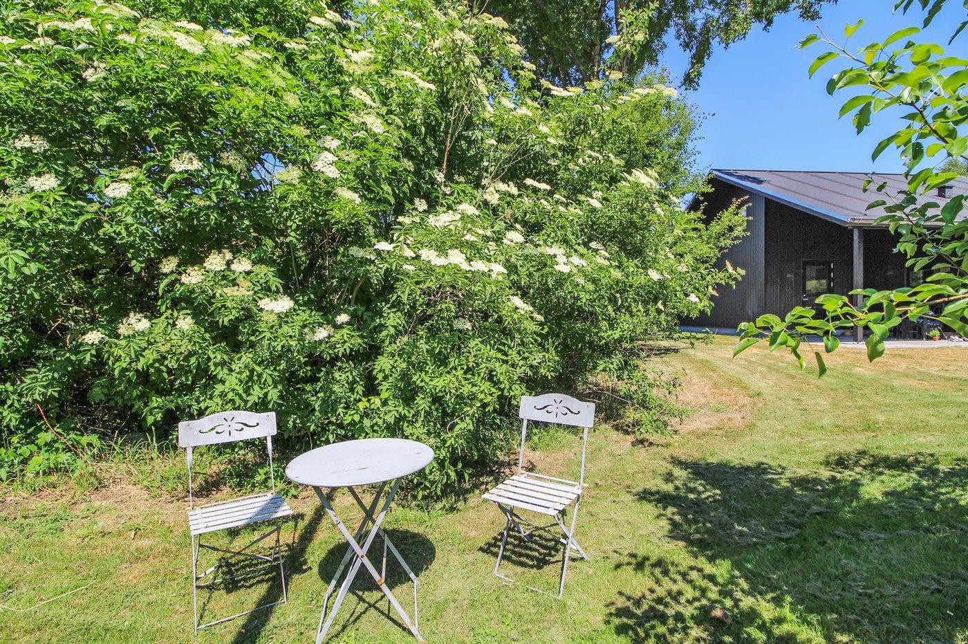 Fritidsbostaden ligger på en 1650 m² stor naturtomt. Avstånd till hav är 850 m. Närmeste affär ligger på ett avstånd av 500 m. Det finns en golfbana på ett avstånd av 15000 m. Till fritidsbostaden hör 100 m² terrass. Dessutom finns det 10 m² övertäckt terrass. Utomhus dusch. Det finns uttag för att ladda elbil vid huset. P-plats på tomten.