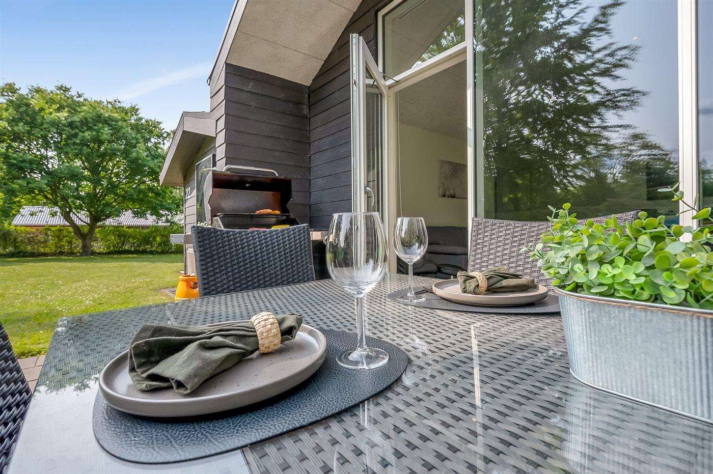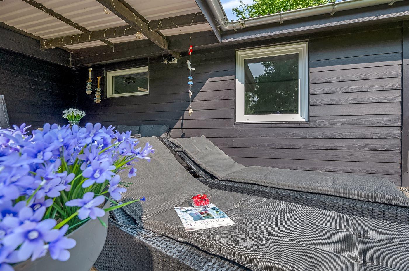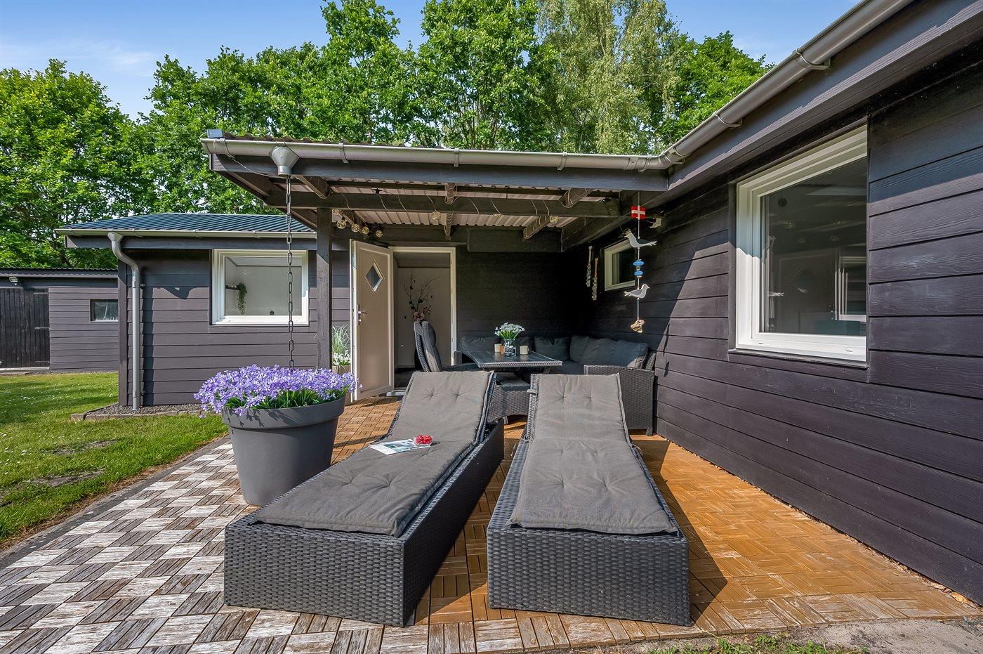 Fritidsbostaden ligger på en 1200 m² stor naturtomt. Tomten är inhägnad. Avstånd till hav är 450 m. Närmeste affär ligger på ett avstånd av 3500 m. Till fritidsbostaden hör 18 m² terrass. Dessutom finns det 15 m² övertäckt terrass. Det finns grill til förfogande. P-plats på tomten.