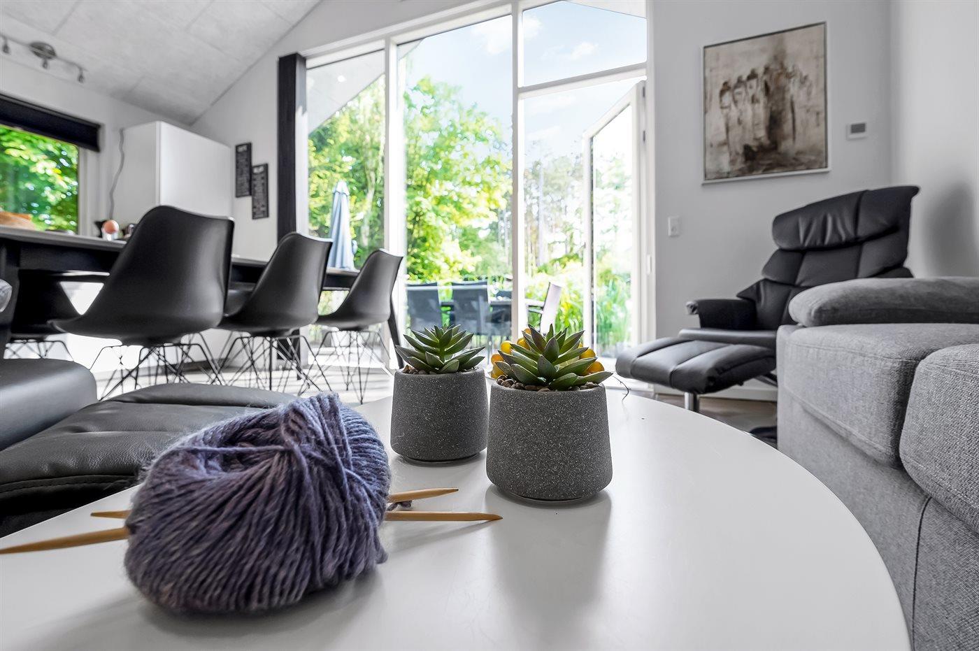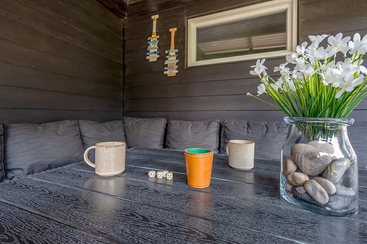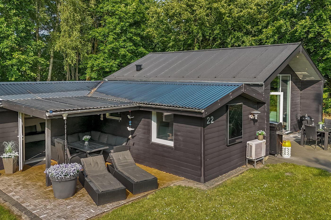 Fritidsbostaden ligger på en 1200 m² stor naturtomt. Tomten är inhägnad. Avstånd till hav är 450 m. Närmeste affär ligger på ett avstånd av 3500 m. Till fritidsbostaden hör 18 m² terrass. Dessutom finns det 15 m² övertäckt terrass. Det finns grill til förfogande. P-plats på tomten.