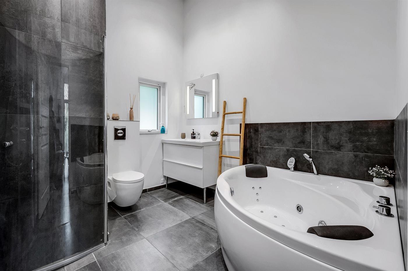 Det finns 1 badrum med duschkabin och 2 toaletter, härav 1 gästtoalett.