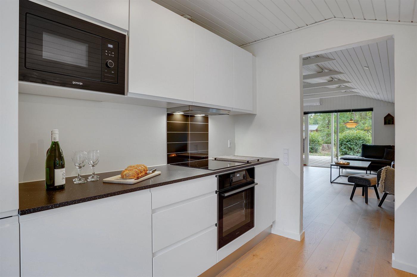 Köket är utrustad med 1 kylskåp Det finns 4 el. värmeplattor, varmluftsugn, mikrovågsugn samt diskmaskin.