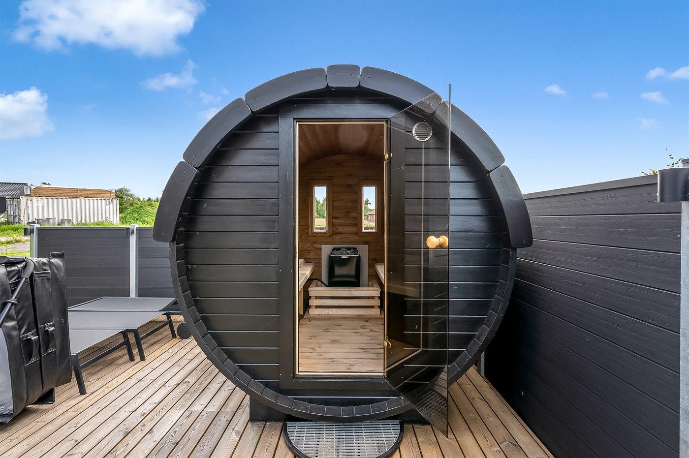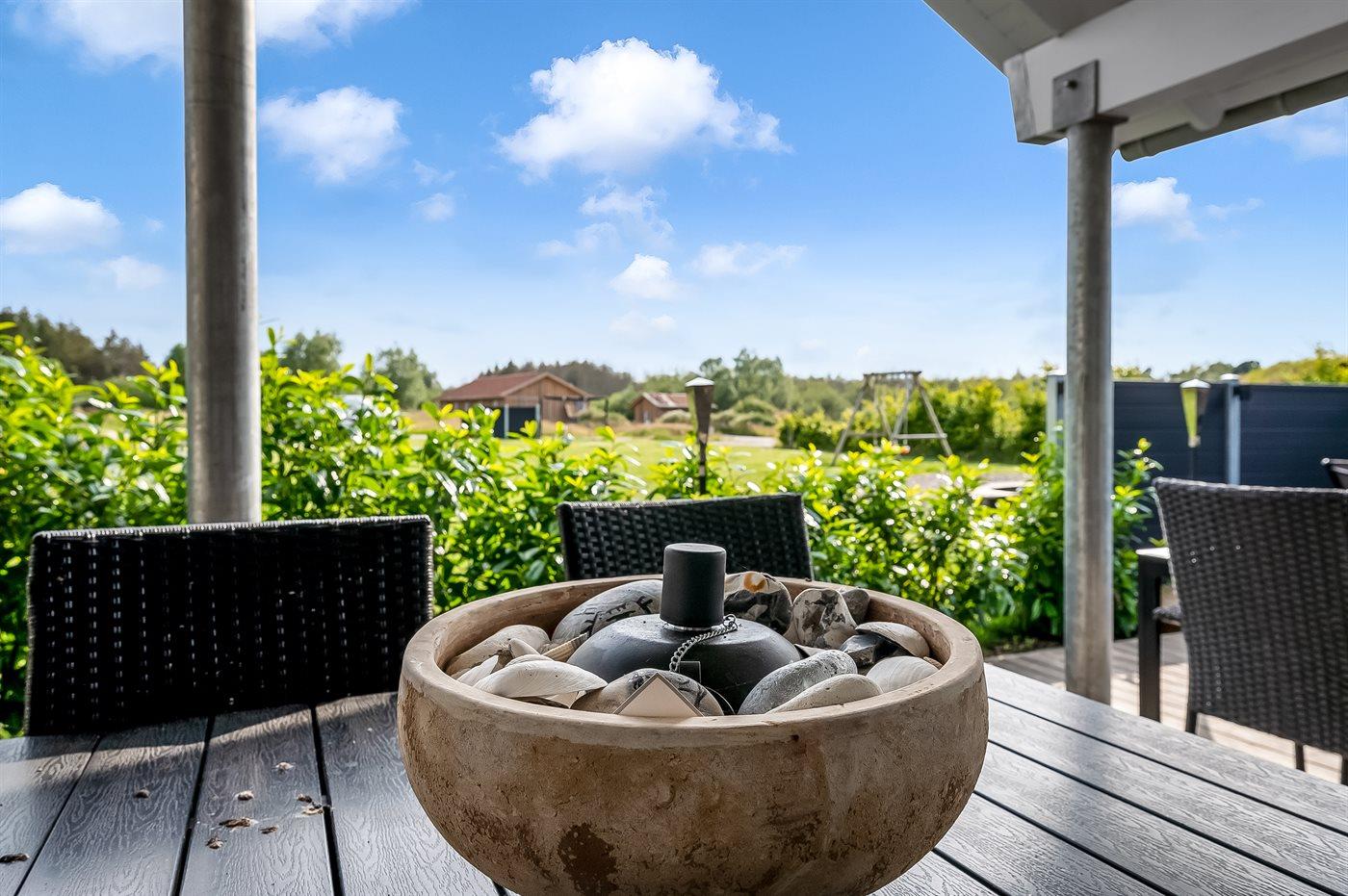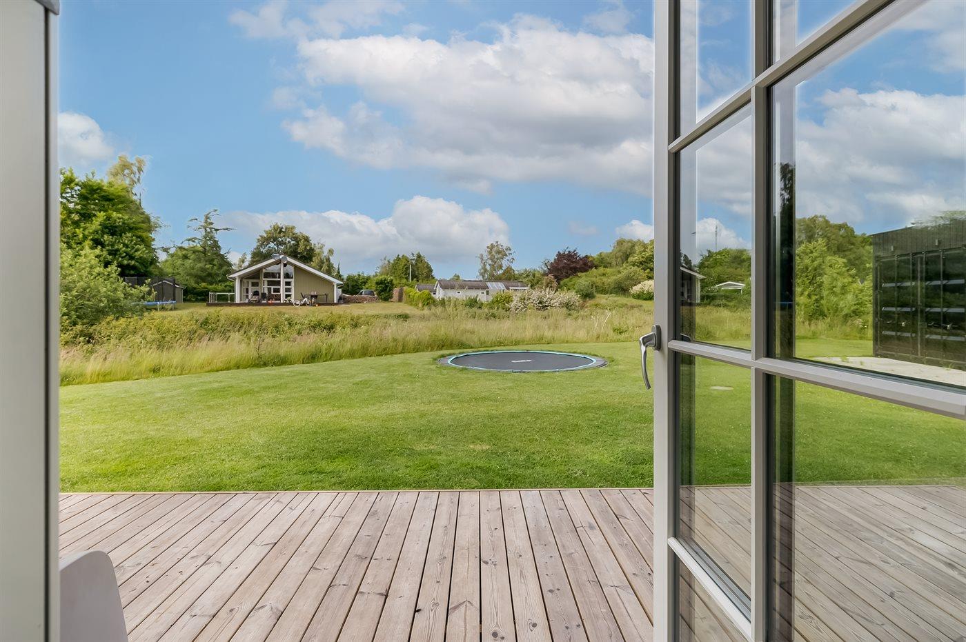 Fritidsbostaden ligger på en 1600 m² stor naturtomt. Avstånd till hav är 750 m. Avstånd till en sjö er 50 m. Närmeste affär ligger på ett avstånd av 3500 m. Till fritidsbostaden hör terrass. Dessutom finns det övertäckt terrass. Gunga. Trampolin. Fotbollsmål. Öppen spis. Utomhus sauna. Det finns grill til förfogande. Det finns uttag för att ladda elbil vid huset. P-plats på tomten.