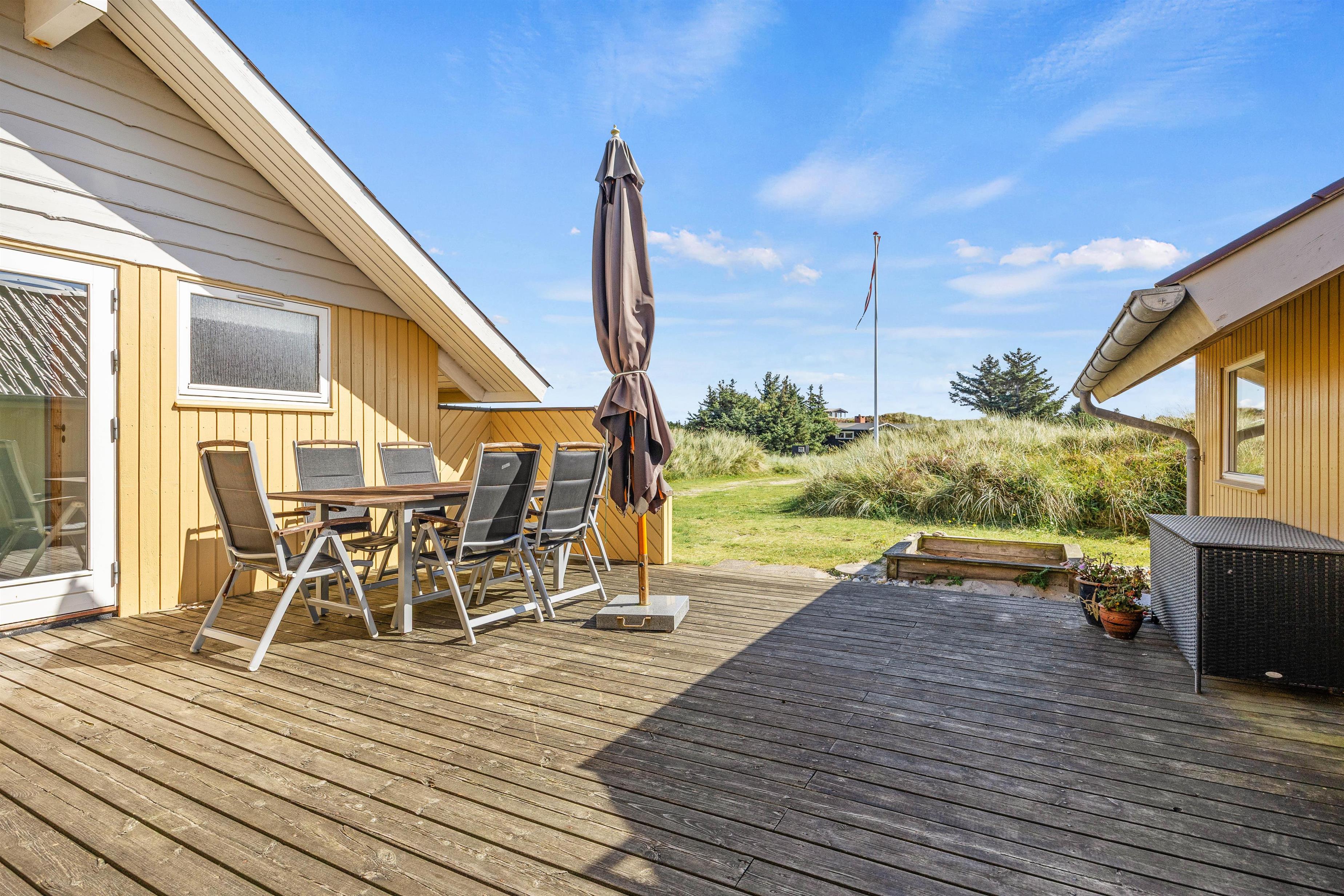 Das 3.300 m² große Dünengrundstück bietet reichlich Platz zum Entspannen und Entdecken. Eure Kinder werden die Schaukel und den Sandkasten lieben, während ihr den Grill auf der offenen Terrasse nutzen könnt, um köstliche Mahlzeiten in der frischen Luft zu genießen. Der nahegelegene Strand ist nur 200 Meter entfernt und lädt zu entspannten Spaziergängen oder aufregenden Stunden am Meer ein. Falls ihr mit eurem geliebten Vierbeiner anreisen möchtet, ist das Ferienhaus haustierfreundlich und erlaubt einen Hund.