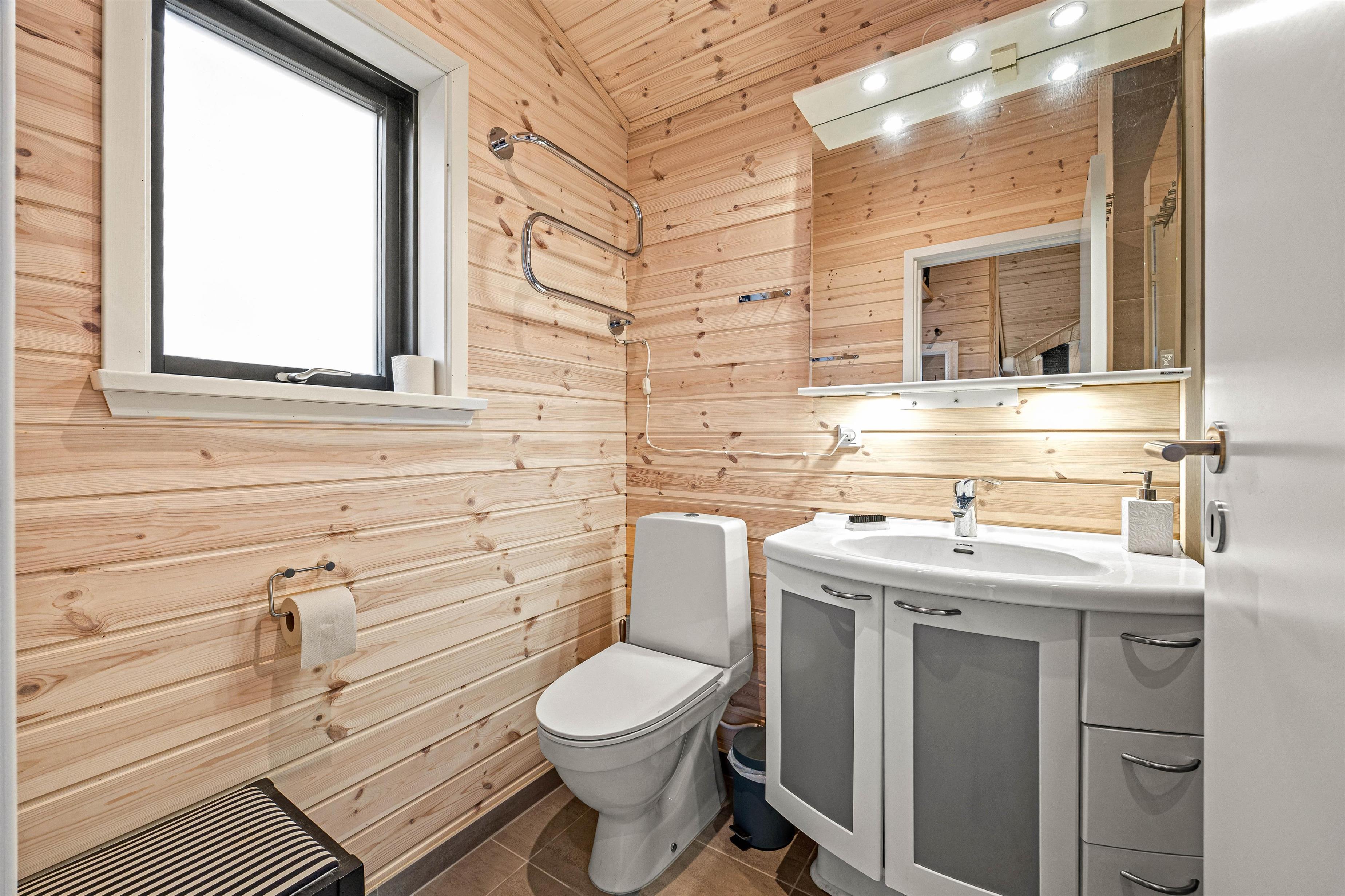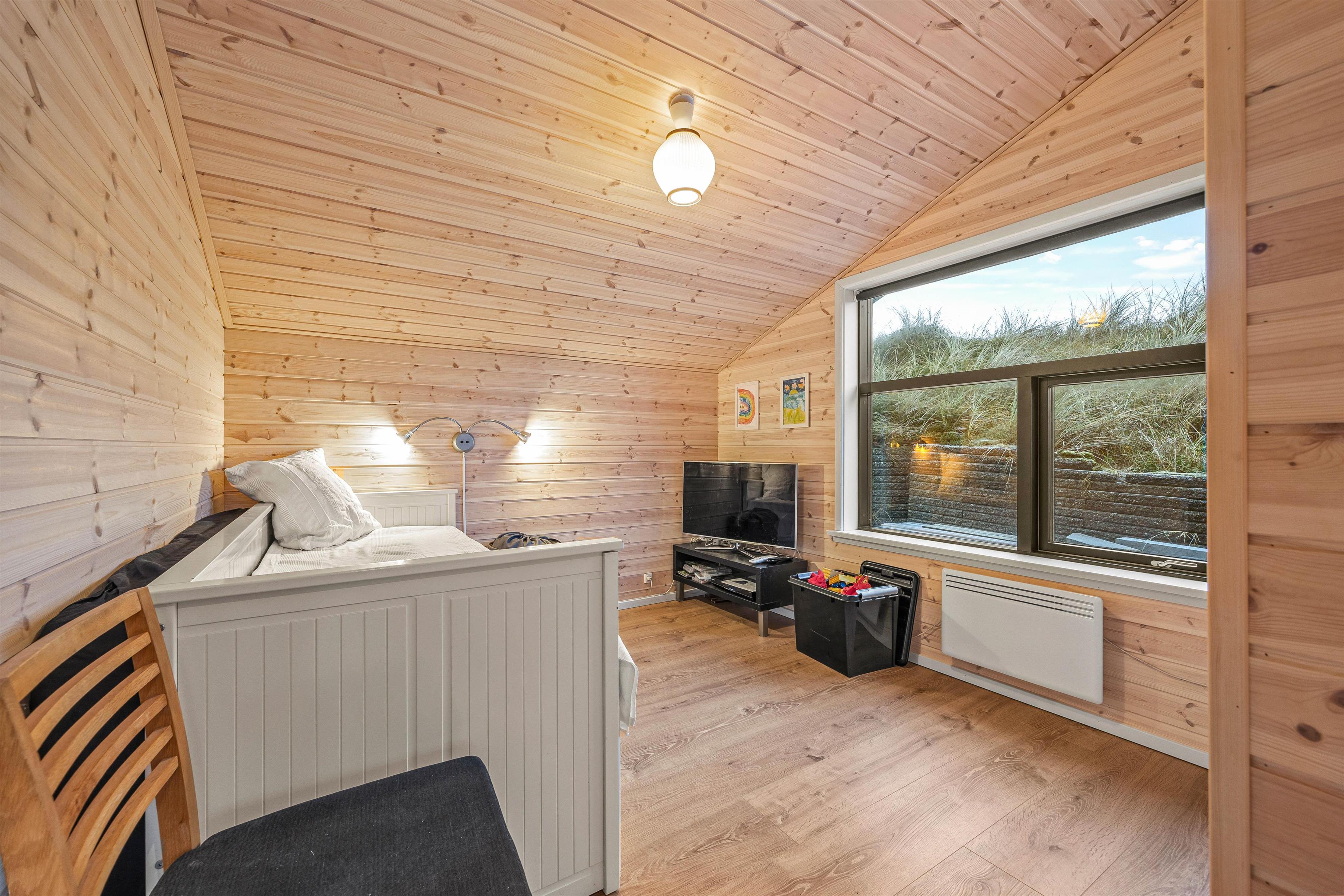 The holiday home has three bedrooms in total. One bedroom features a large double bed with TV, another has a single bed, and the final bedroom has an excellent children's bunk bed. The lower bunk is wider, providing space for two people to sleep. Both bathrooms are equipped with underfloor heating, ensuring no cold feet in the morning.