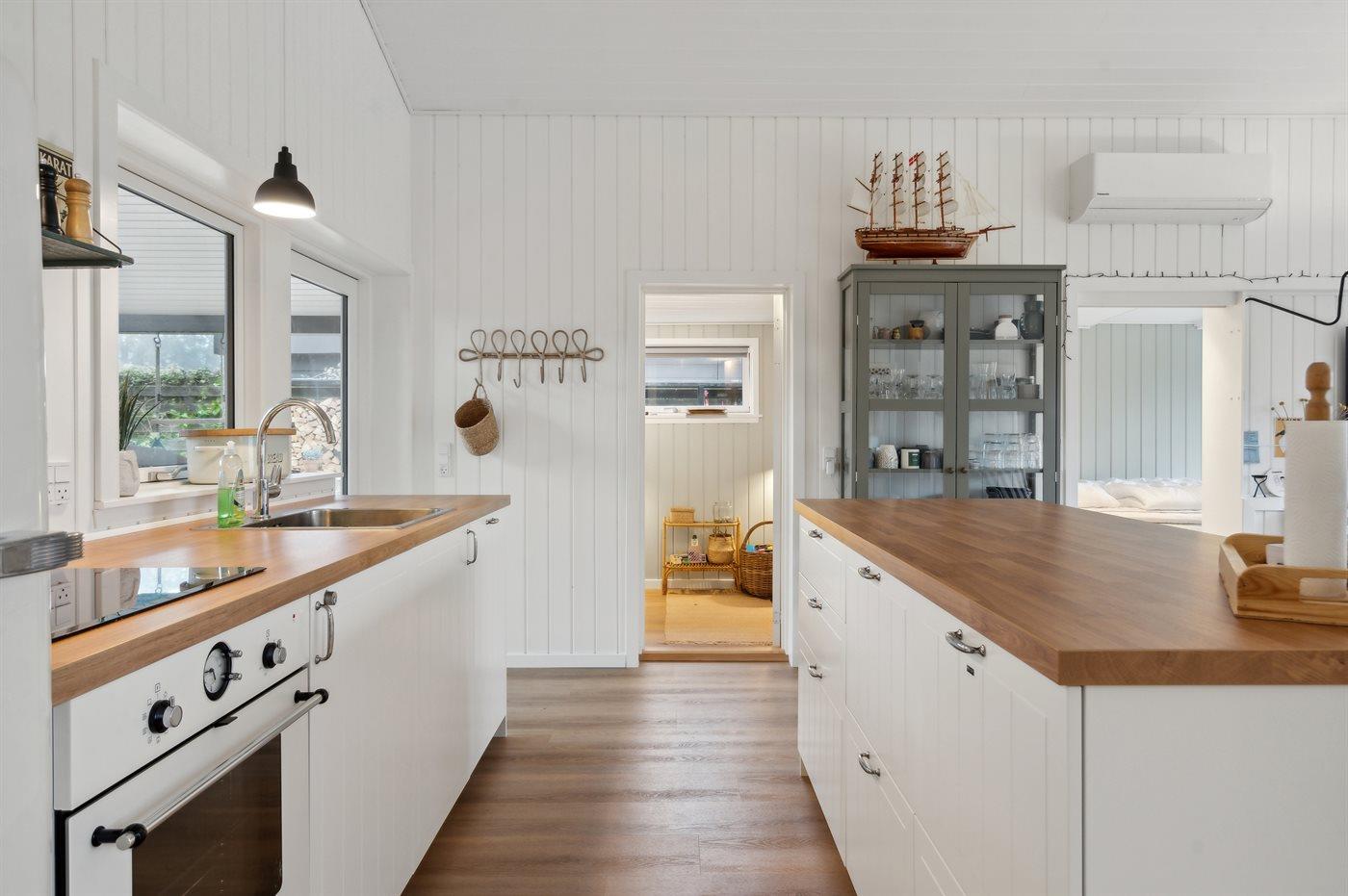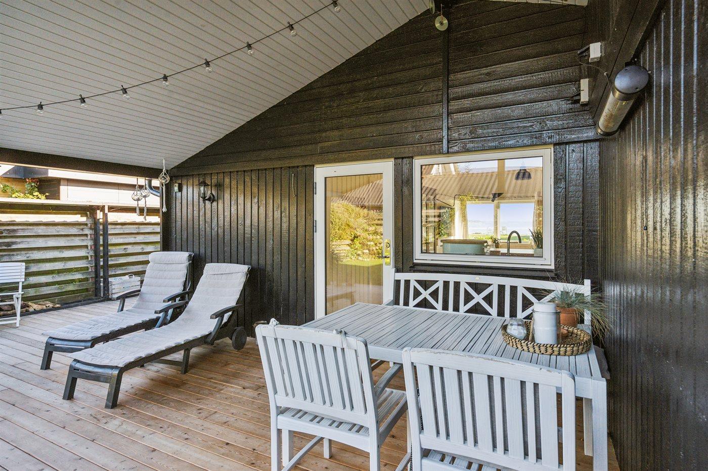 Fritidsbostaden ligger på en 300 m² stor anlagd trädgård. Avstånd till hav är 50 m. Det finns en badbrygga i närheten. Närmeste affär ligger på ett avstånd av 200 m. Det finns en golfbana på ett avstånd av 10000 m. Till fritidsbostaden hör terrass. Dessutom finns det övertäckt terrass. Det finns grill til förfogande. P-plats på tomten.