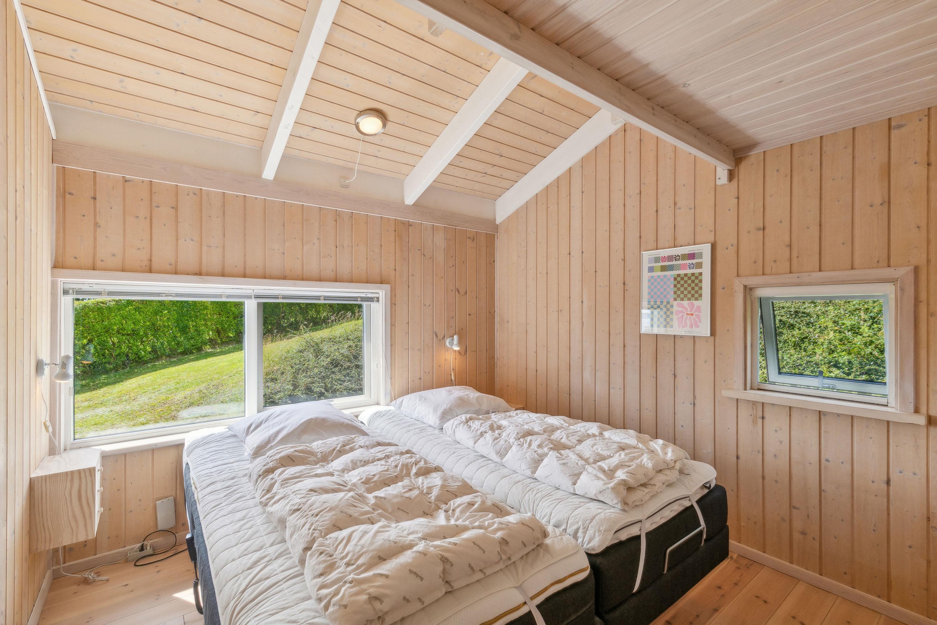 This highly maintained and well-appointed holiday home is located high up with a stunning panoramic view over Ebeltoft Vig and Mols Bjerge. From both the property and the house, you can enjoy breathtaking views. The spacious and beautifully furnished living room includes comfortable furniture, a fireplace, and a heat pump. From the living room, you can access the lovely terrace with outdoor furniture. The kitchen, which is connected to the living room, is well-equipped with an American fridge and dishwasher. The large bathroom features a shower, a spa bath, a washing machine, and access to a sauna. The house's beds are divided into three bedrooms; including a room with a double bed, a room with two single beds and a room with a bunk bed. For younger guests, there is a changing table and a high chair. The TV operates via Chromecast.