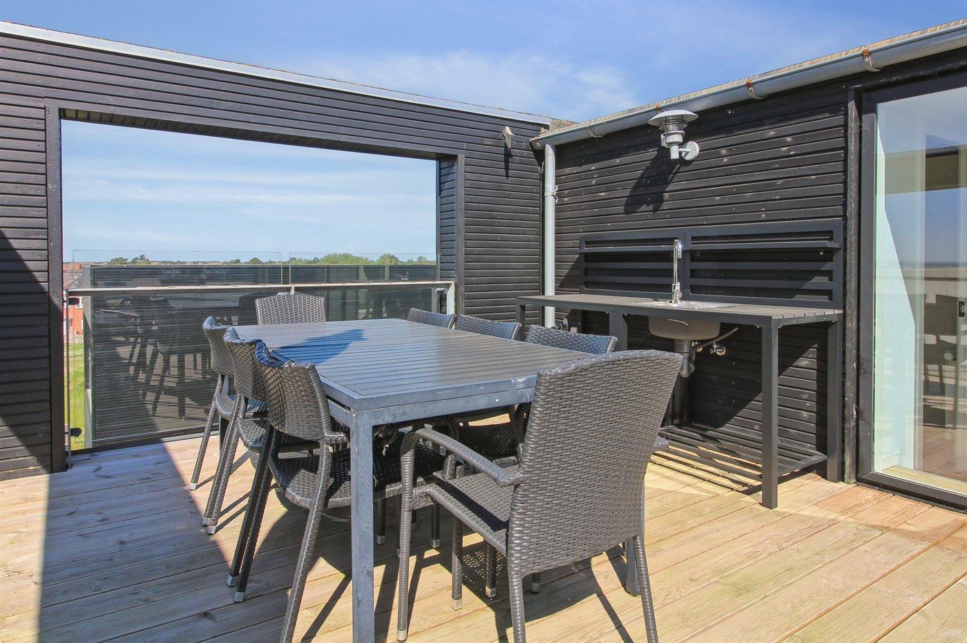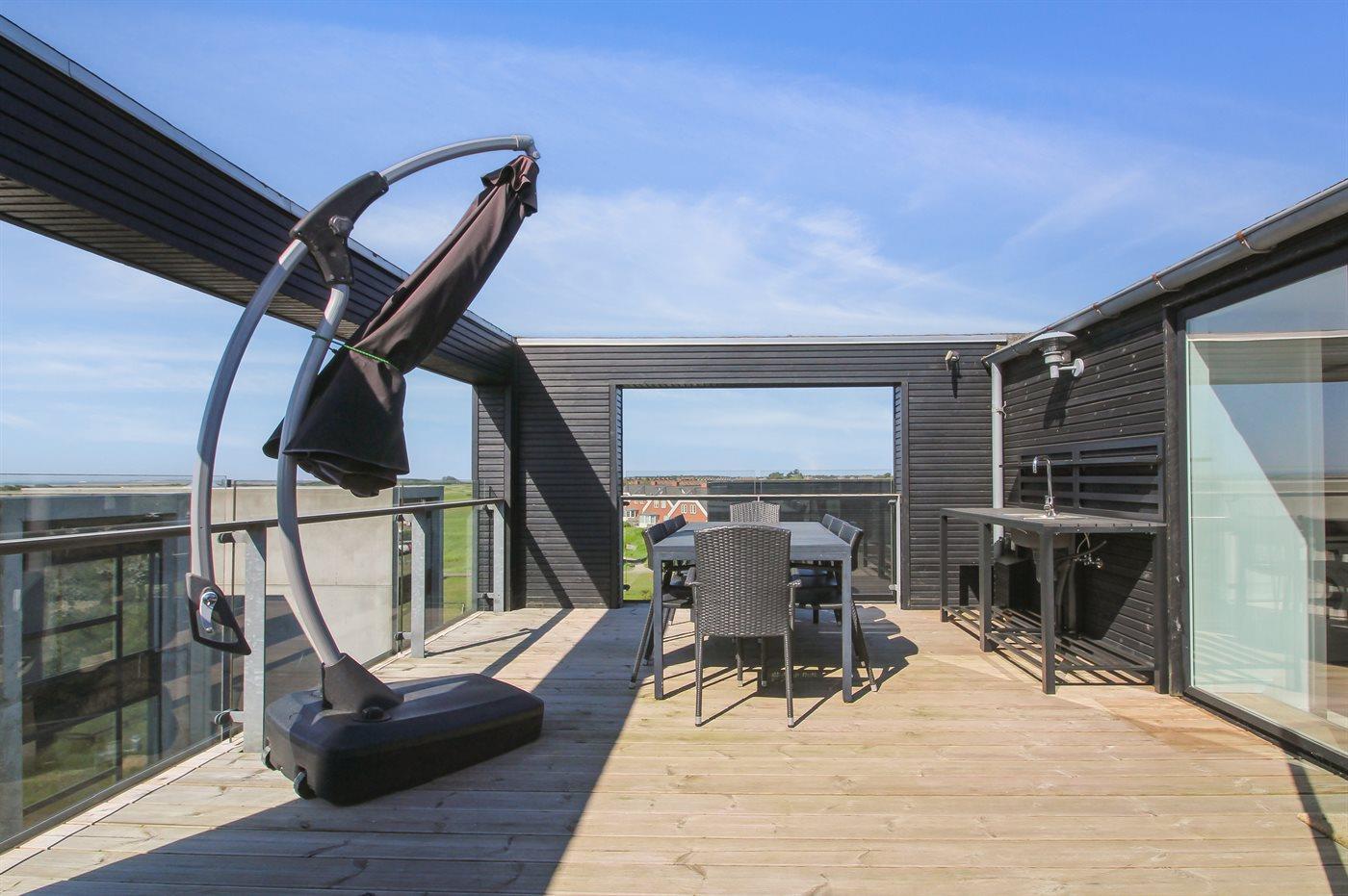 Fritidsbostaden ligger på en 150 m² stor naturtomt. Avstånd till hav är 2000 m.Avstånd till vadehavet 25 m. Närmeste affär ligger på ett avstånd av 200 m. Det finns en golfbana på ett avstånd av 400 m. Det finns grill til förfogande. Det finns uttag för att ladda elbil vid huset. Kontakt typ 2. Med 11 kW laddningseffekt. P-plats på tomten.