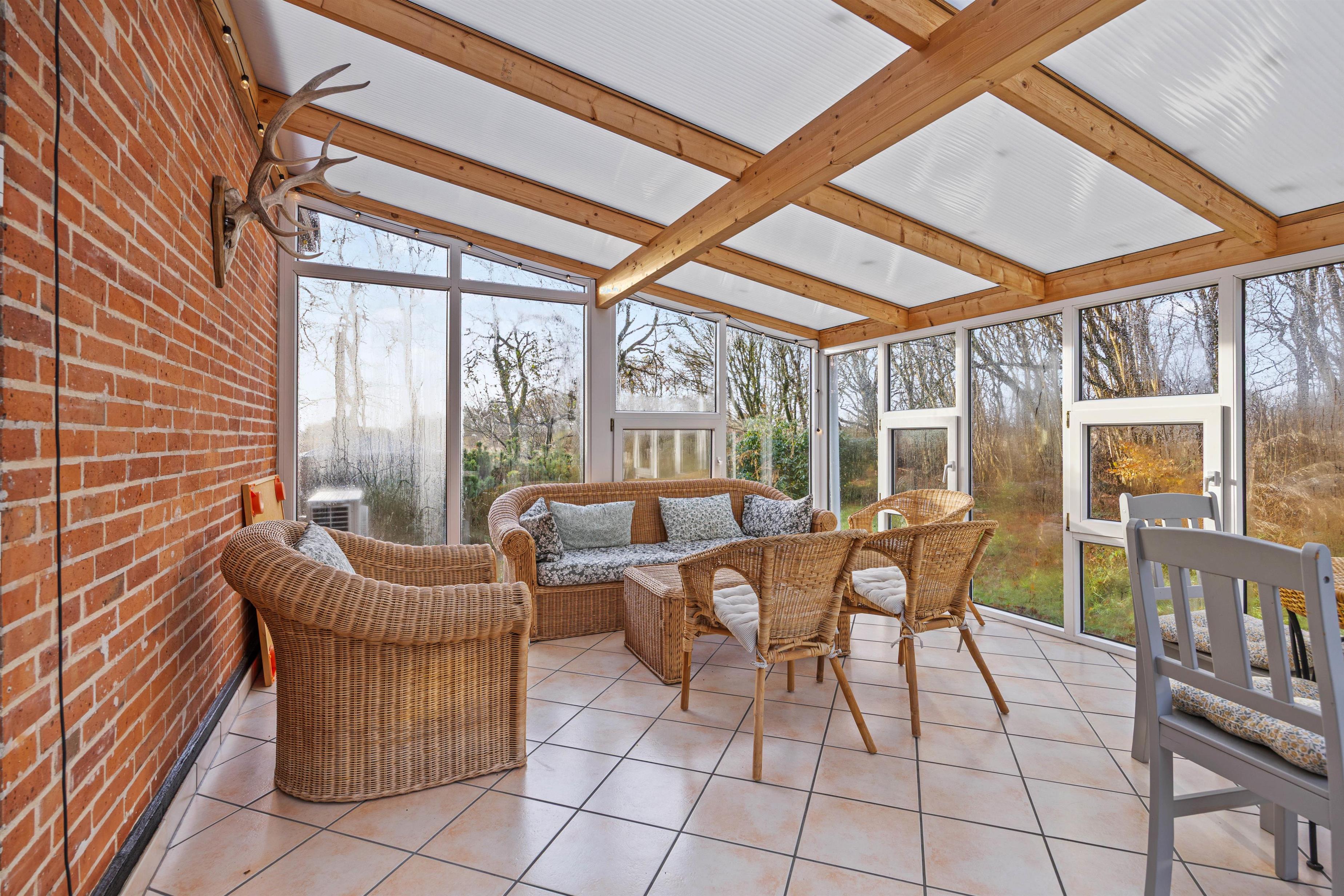 A special feature is the large conservatory, where even on cooler or stormy days you can sit as if outdoors whilst still enjoying the sunshine. From here, you have a fantastic view of the surroundings and can fully embrace life amidst the greenery and nature in any weather.