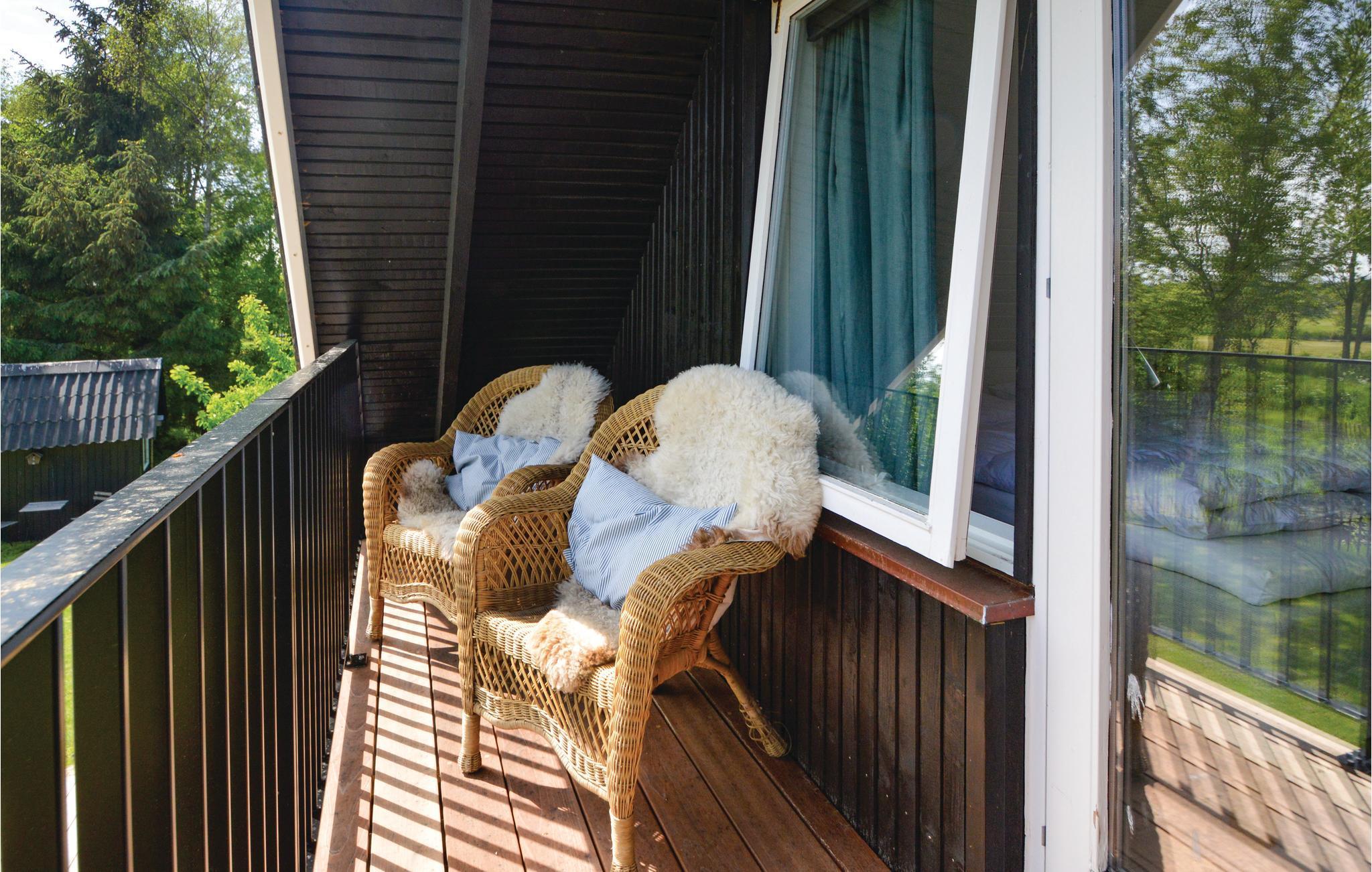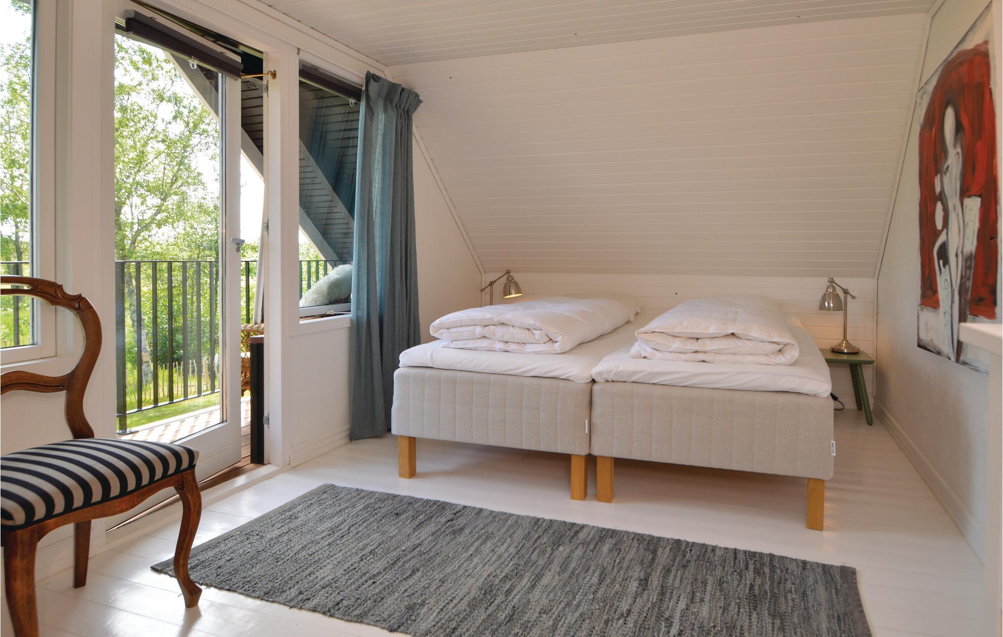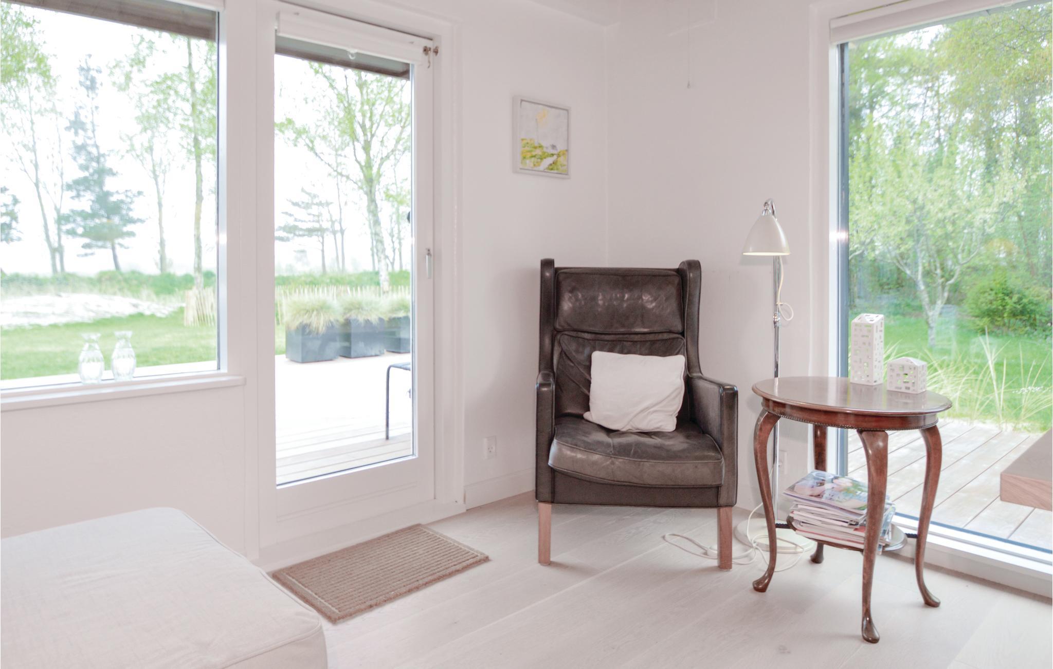 Du kommer definitivt att känna dig hemma i detta semesterhus, som utstrålar mysighet och omsorg om detaljer. Interiören är ljus och vänlig med moderna möbler som skickligt understryker semesterhusets skandinaviska charm. De stora fönsterpartierna i söderläge släpper in mycket ljus och samtidigt kan du observera naturen. Det finns två sovrum på 1:a våningen, varav det ena har en balkong med havsutsikt. Därifrån kan du också se den närliggande golfbanan. Det tredje sovrummet ligger i uthuset och har en dubbelsäng och ett handfat.