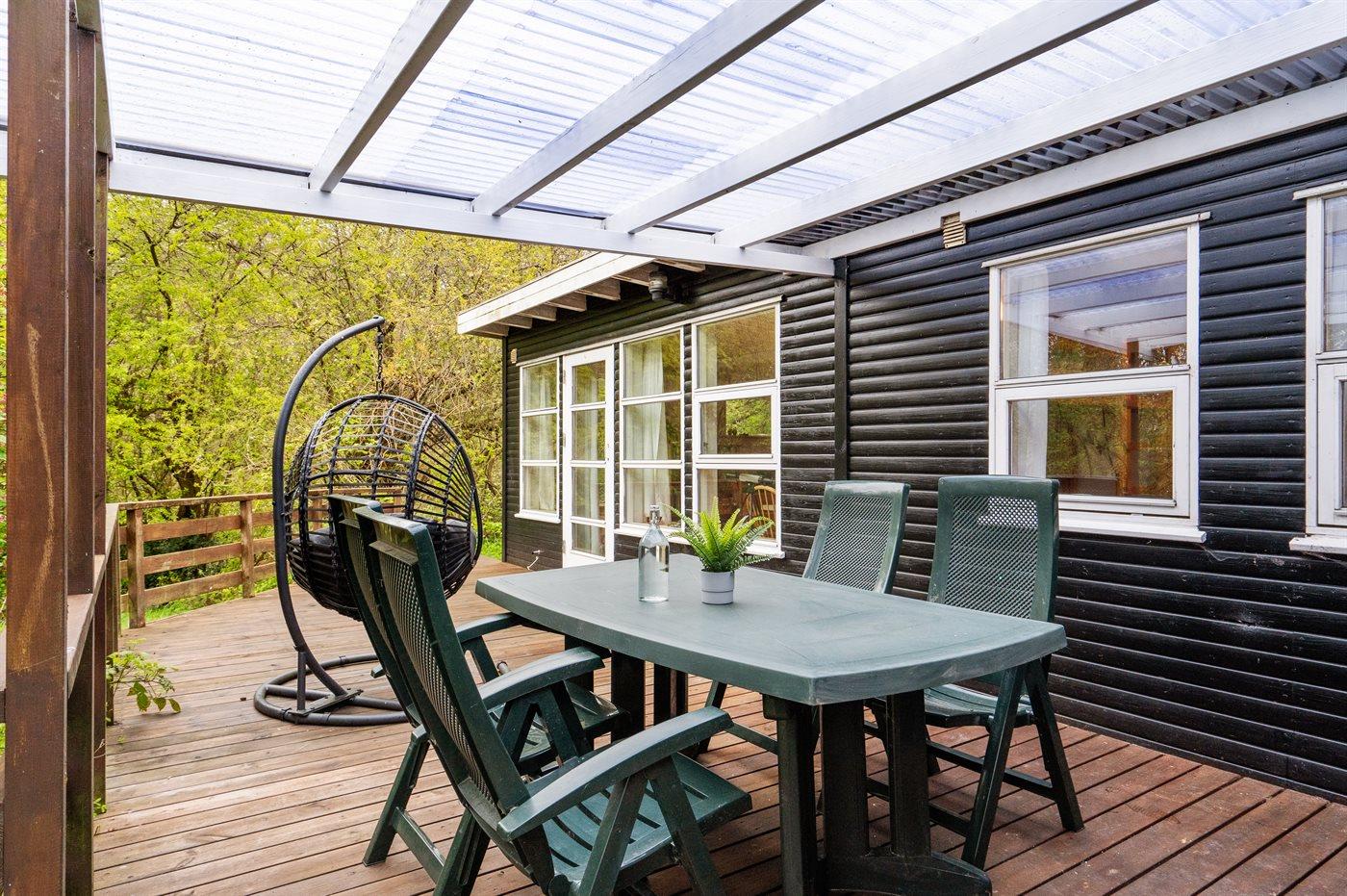 Fritidsbostaden ligger på en 2207 m² stor tomt i skog/odling. Avstånd till hav är 300 m. Närmeste affär ligger på ett avstånd av 3000 m. Till fritidsbostaden hör terrass. Dessutom finns det övertäckt terrass. Redskapsutrymmet. Trampolin. Det finns grill til förfogande. Det finns uttag för att ladda elbil vid huset. Kontakt typ 2. Med 11 kW laddningseffekt. P-plats på tomten.