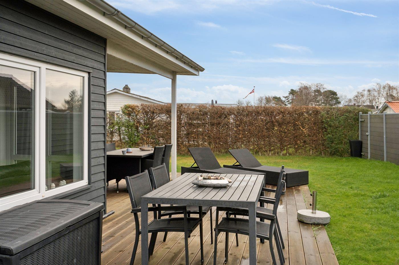 Fritidsbostaden ligger på en 552 m² stor anlagd trädgård. Tomten är inhägnad. Avstånd till hav är 275 m. Närmeste affär ligger på ett avstånd av 3000 m. Till fritidsbostaden hör terrass. Dessutom finns det övertäckt terrass. P-plats på tomten.