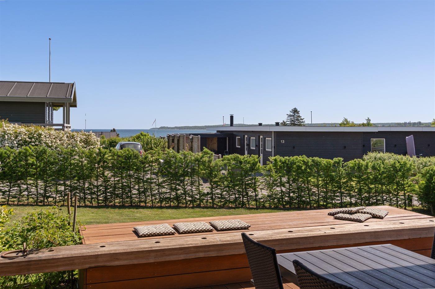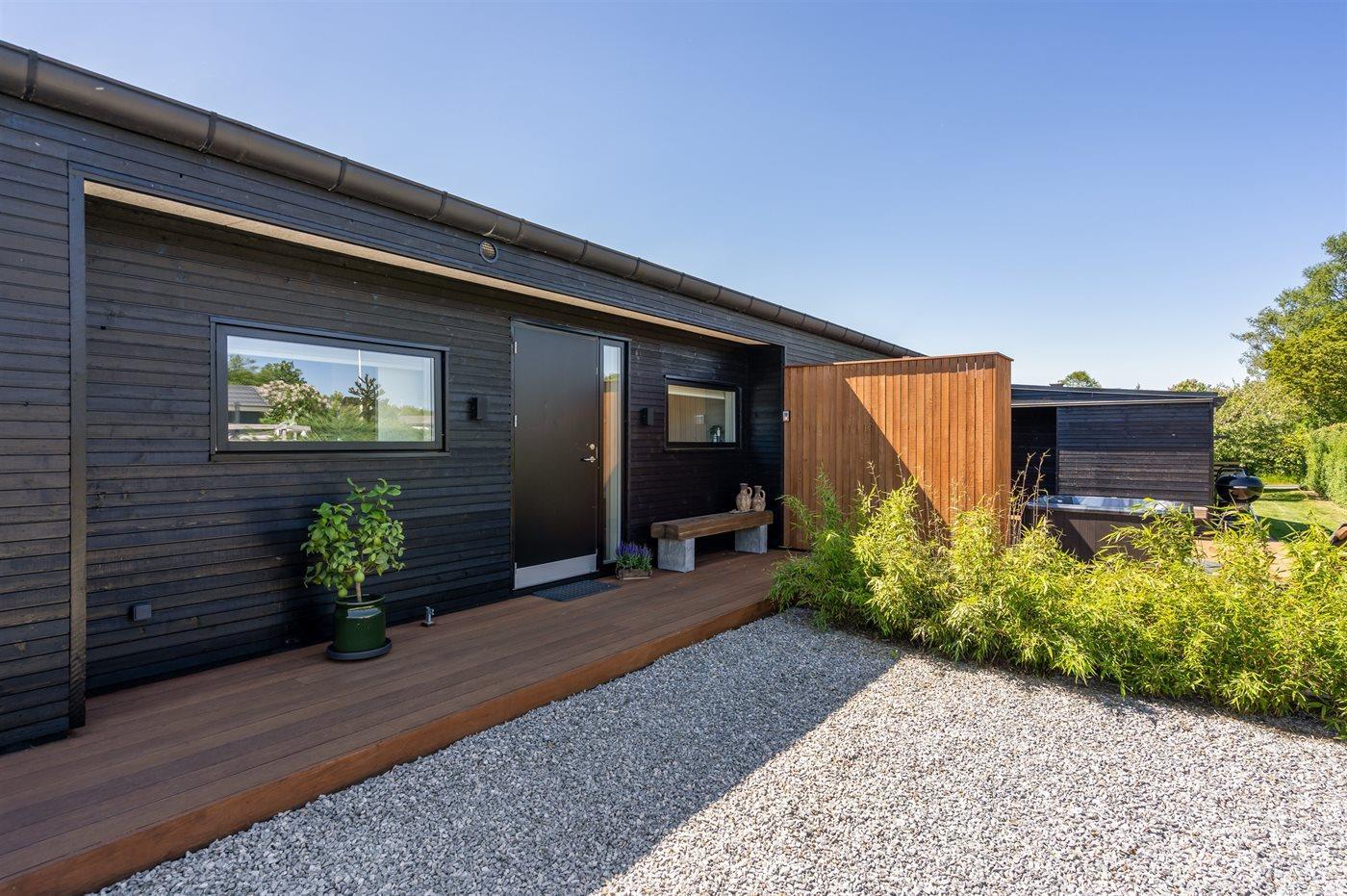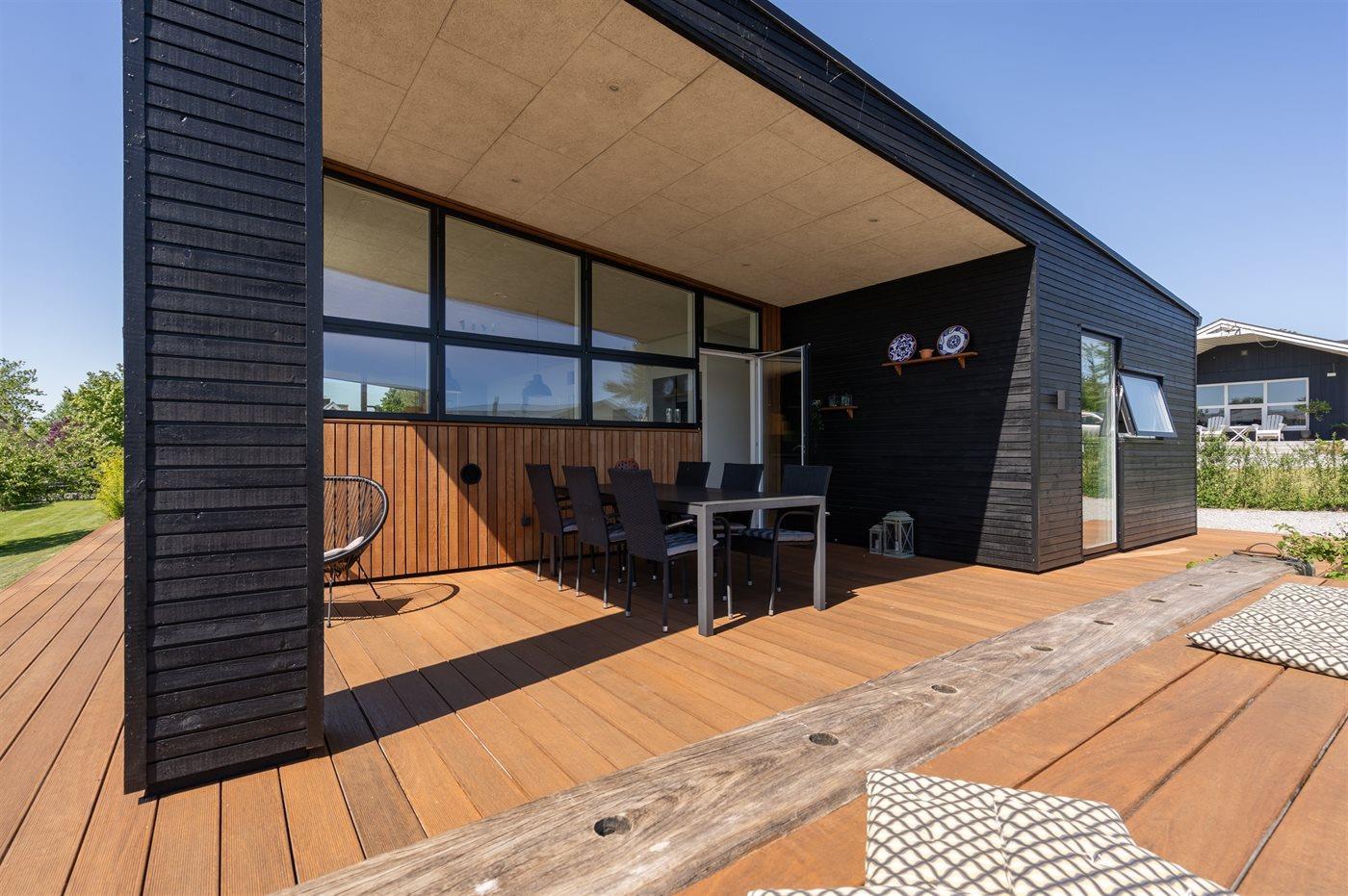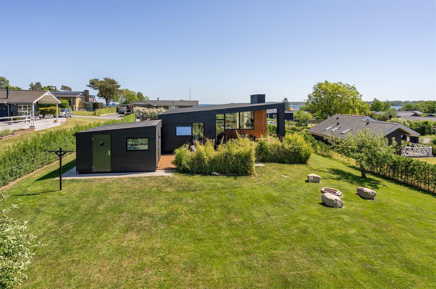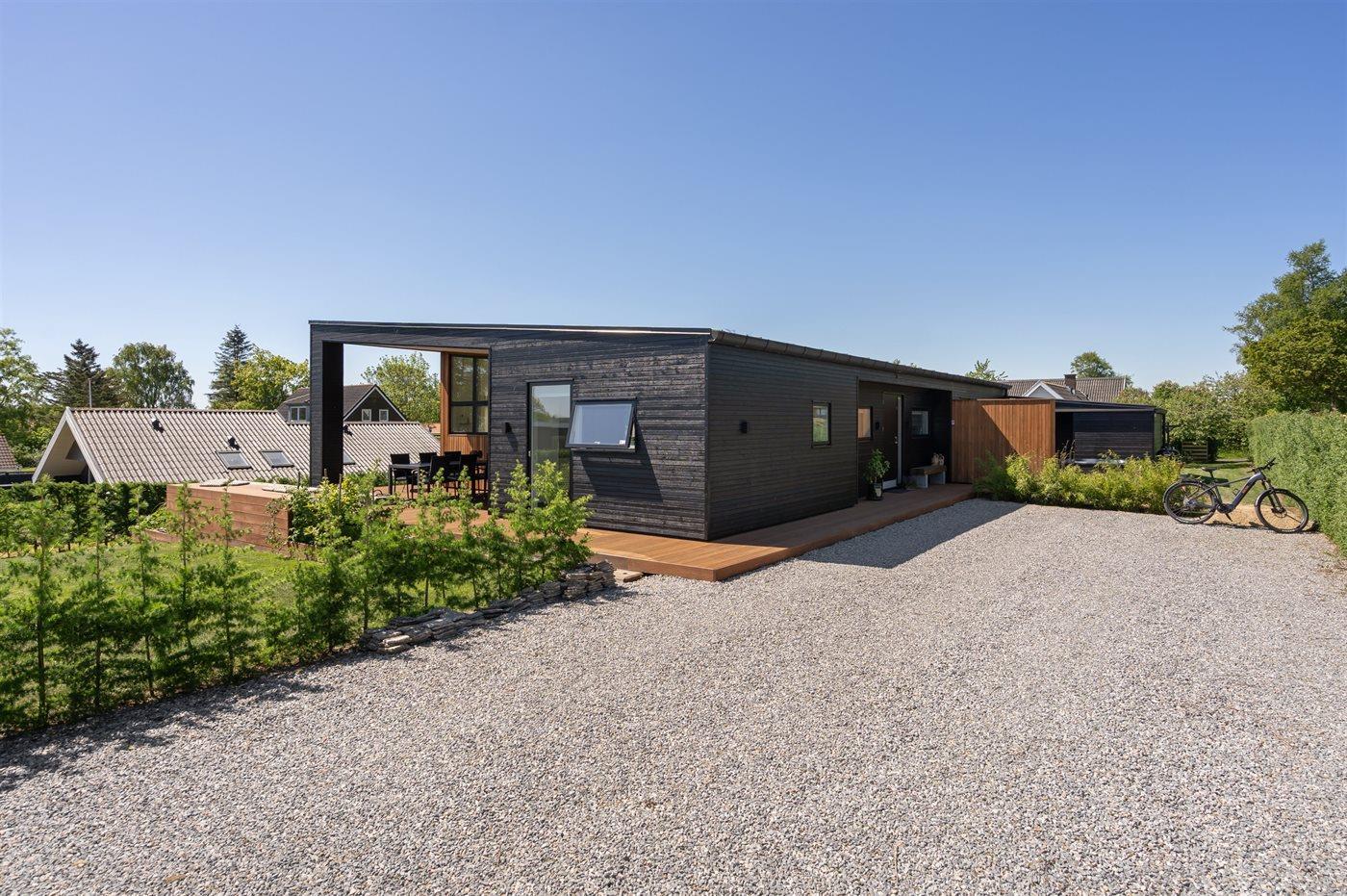 Fritidsbostaden ligger på en 1209 m² stor anlagd trädgård. Avstånd till hav är 300 m. Närmeste affär ligger på ett avstånd av 3000 m. Till fritidsbostaden hör terrass. Dessutom finns det övertäckt terrass. Öppen spis. Utomhus dusch. Det finns grill til förfogande. P-plats på tomten.