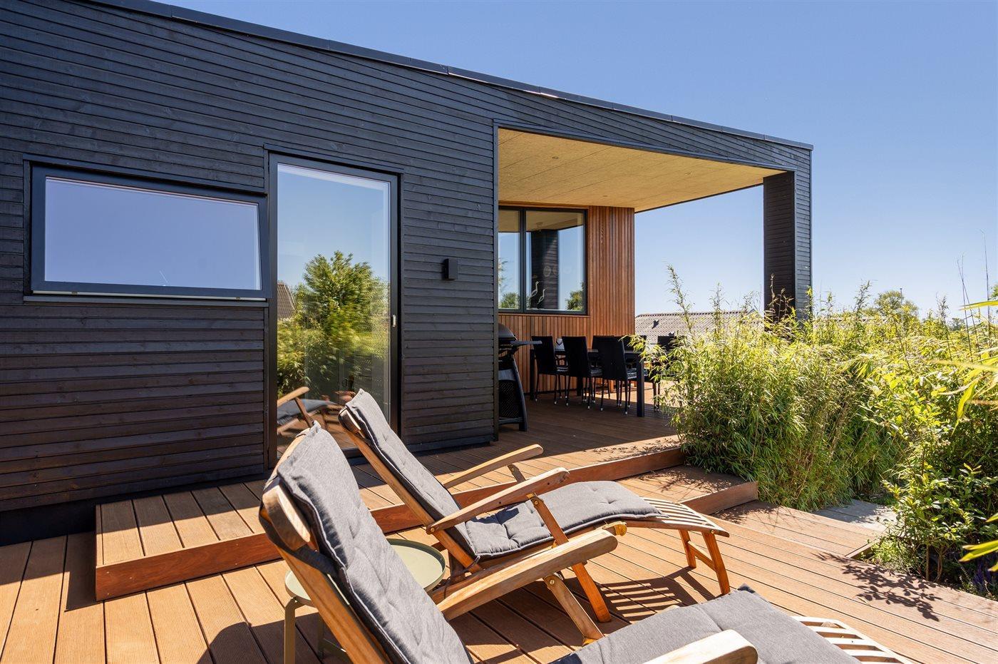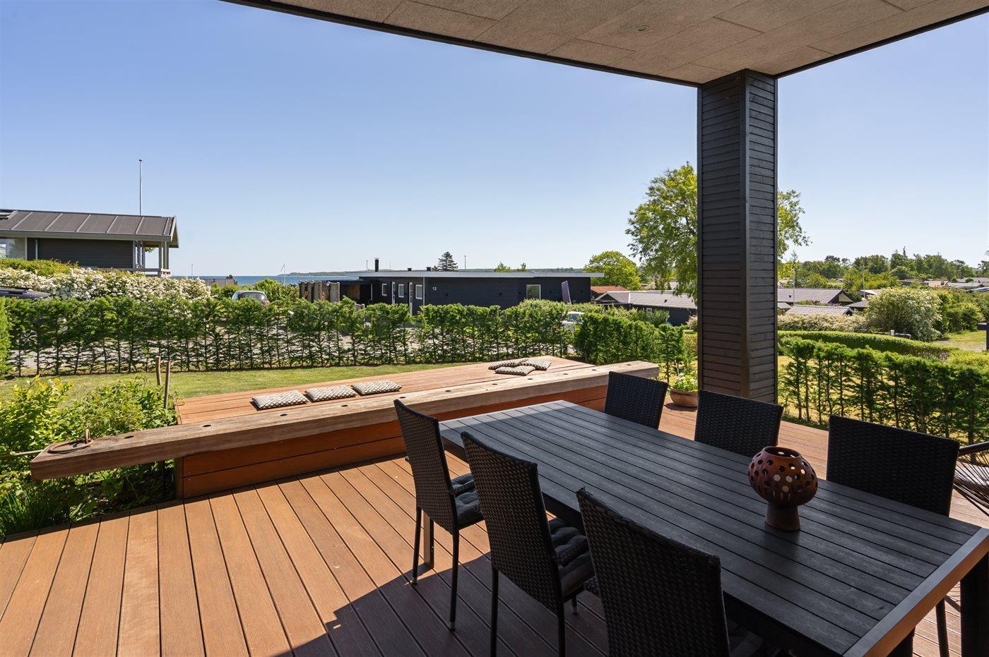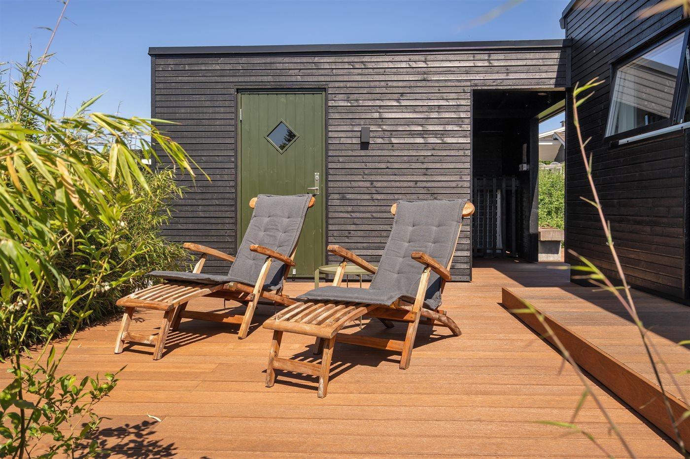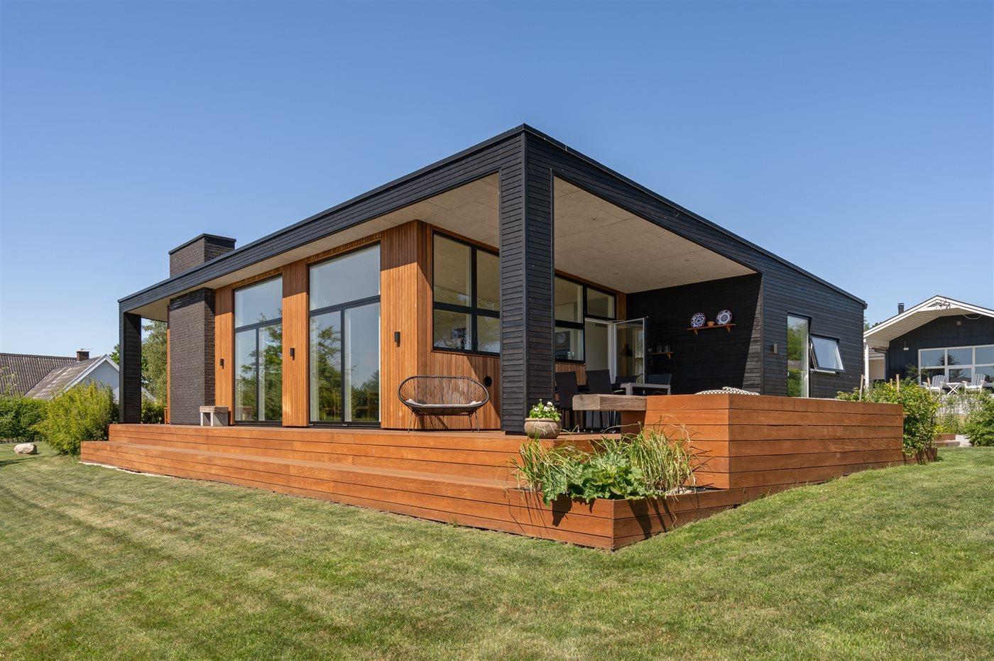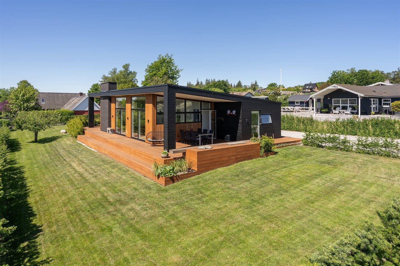 Fritidsbostaden ligger på en 1209 m² stor anlagd trädgård. Avstånd till hav är 300 m. Närmeste affär ligger på ett avstånd av 3000 m. Till fritidsbostaden hör terrass. Dessutom finns det övertäckt terrass. Öppen spis. Utomhus dusch. Det finns grill til förfogande. P-plats på tomten.