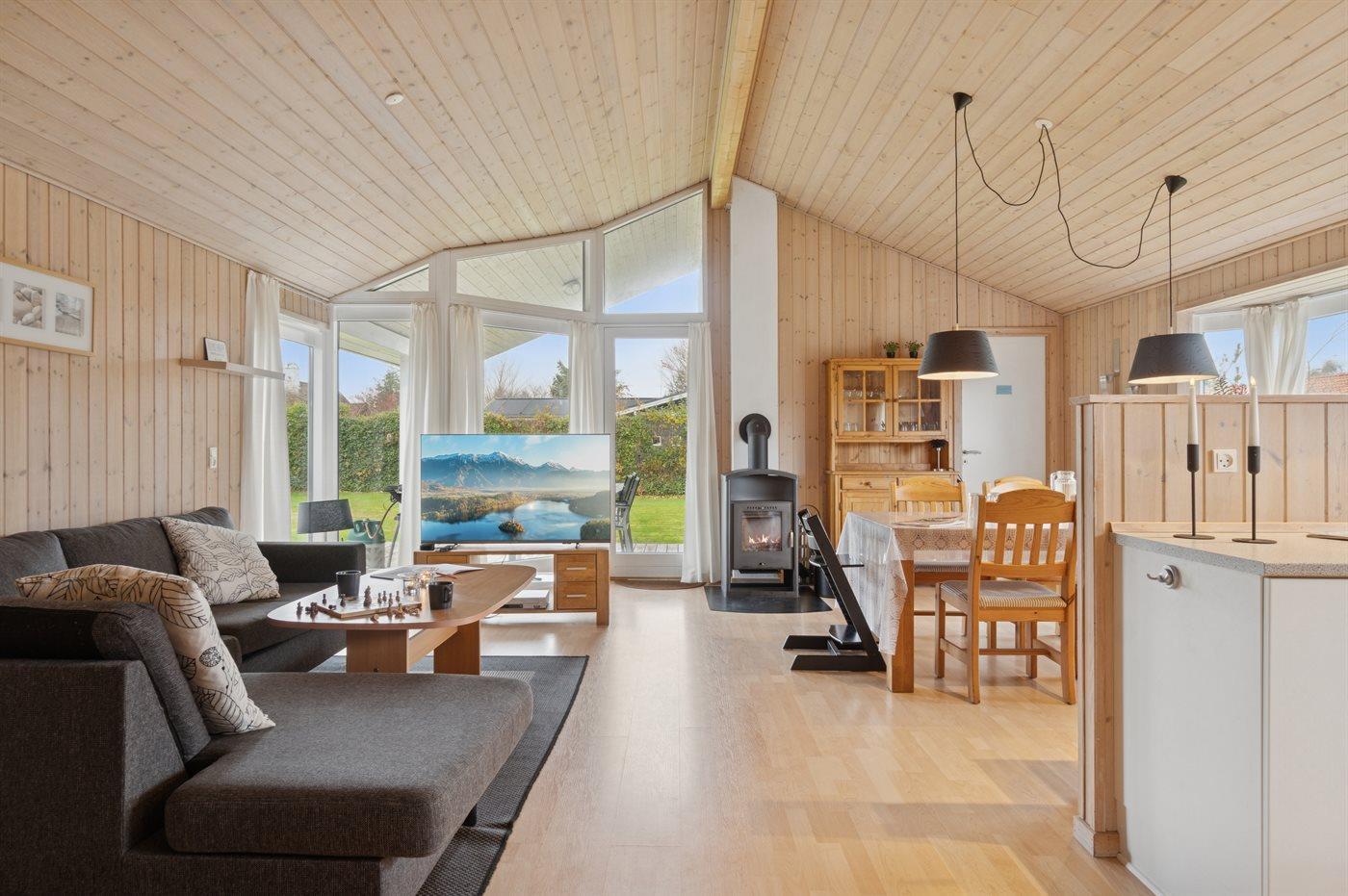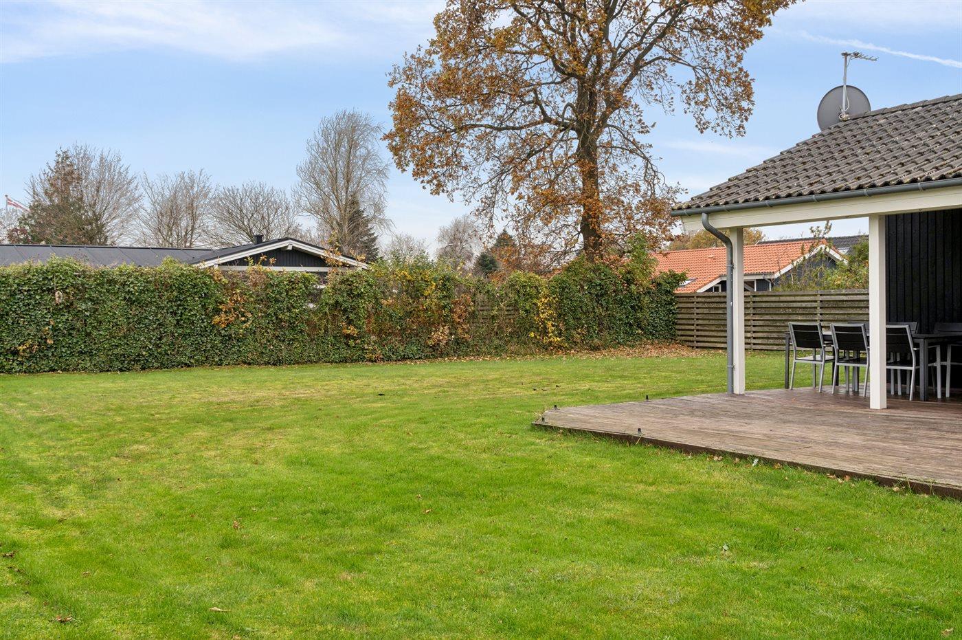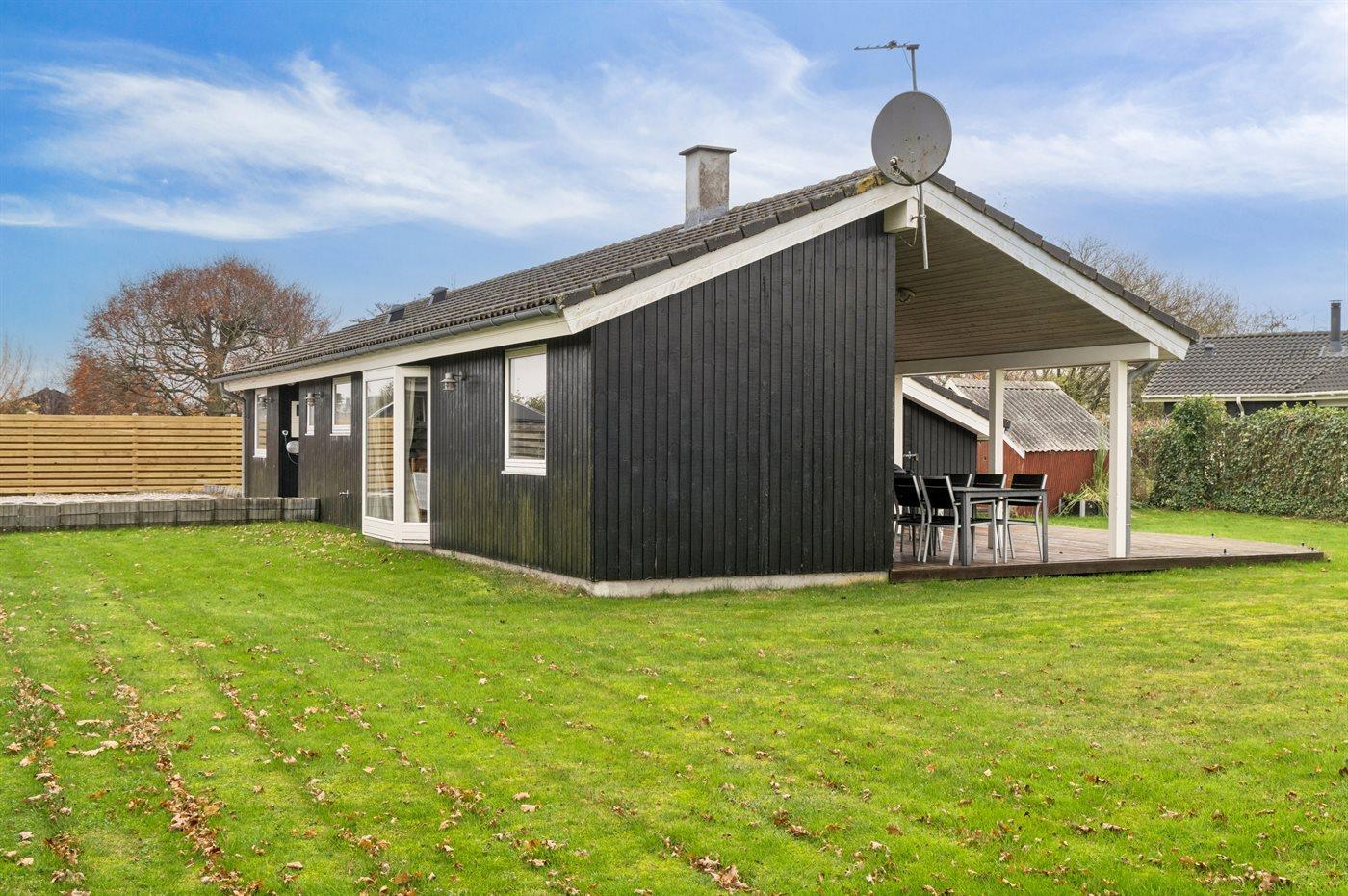 Fritidsbostaden ligger på en 775 m² stor anlagd trädgård. Avstånd till hav är 200 m. Närmeste affär ligger på ett avstånd av 3500 m. Till fritidsbostaden hör terrass. Dessutom finns det övertäckt terrass. Det finns grill til förfogande. Det finns uttag för att ladda elbil vid huset. Med 11 kW laddningseffekt. P-plats på tomten.