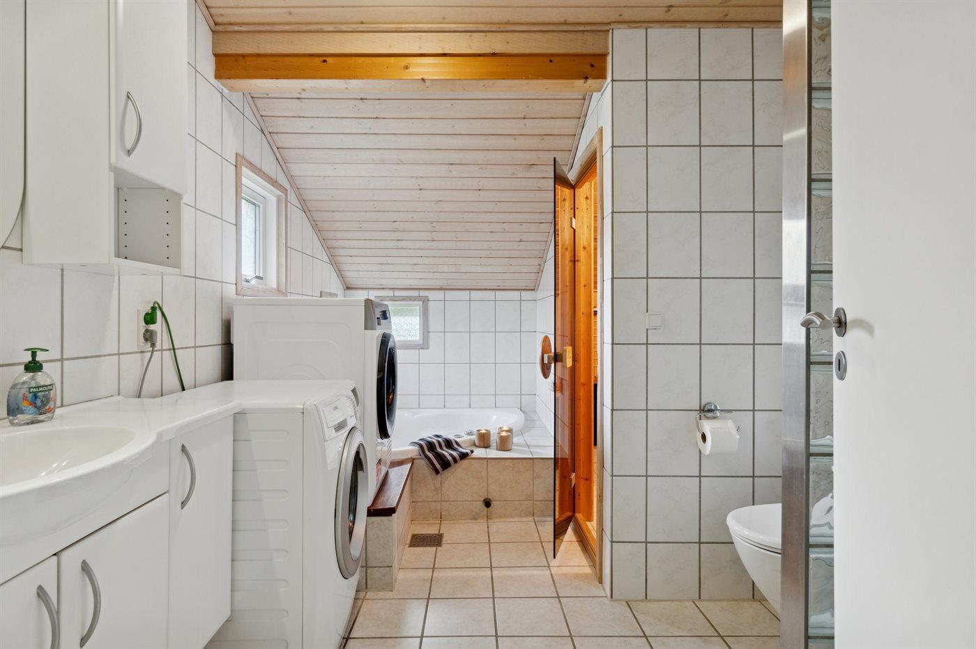 Det finns 2 badrum med duschkabin och 2 toaletter. Det finns golvvärme i 2 badrum. I bastun finns det möjlighet för avkoppling.