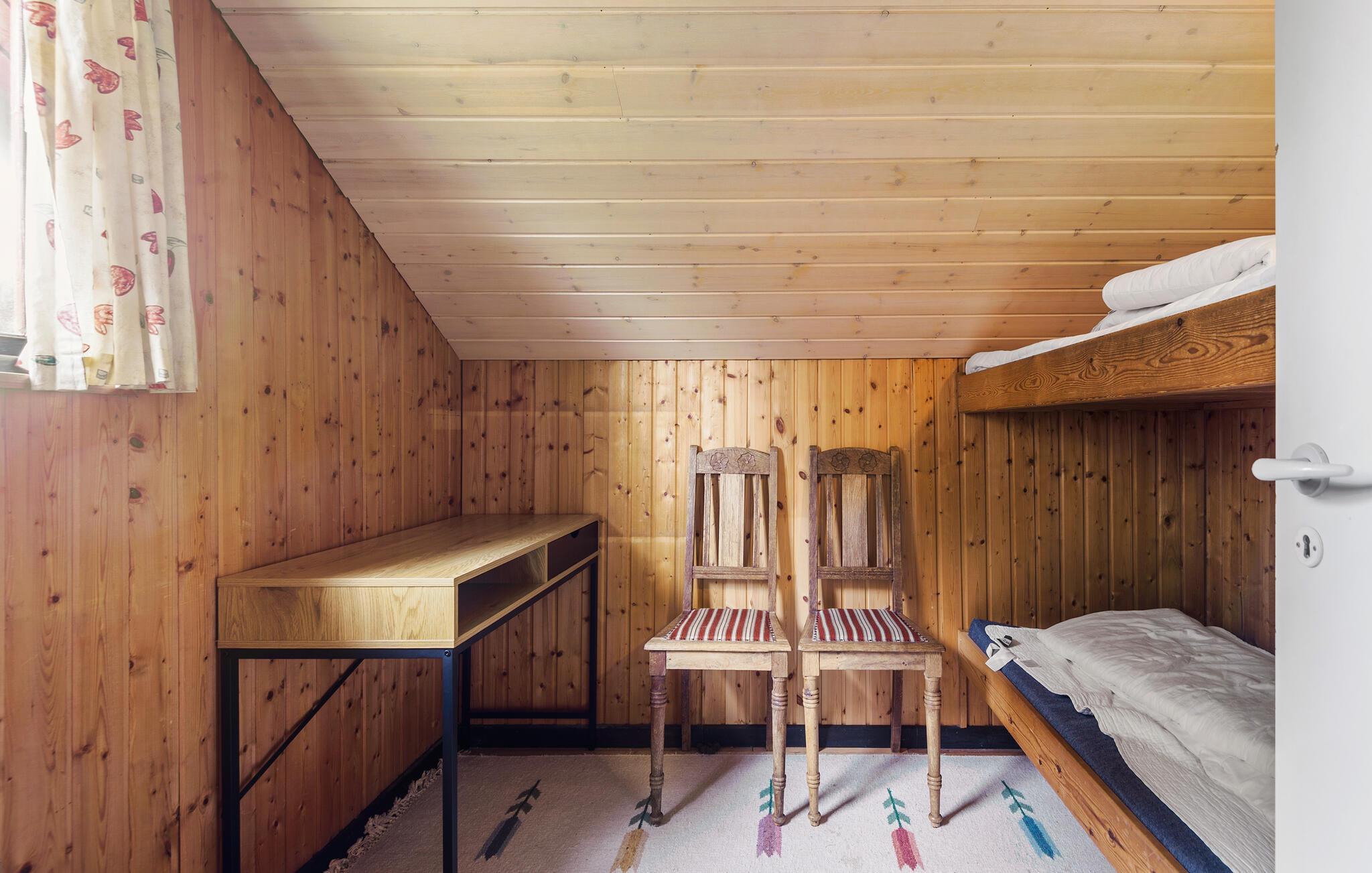 Inne i huset ger träatmosfären i vardagsrummet med öppen planlösning och en sprakande vedeldad spis mysig värme även under svalare kvällar. Tillbringa avkopplande timmar i den mysiga sittgruppen eller njut av måltiderna tillsammans vid matbordet medan du njuter av utsikten över naturen. Det välutrustade köket inbjuder dig att laga läckra måltider för hela familjen.