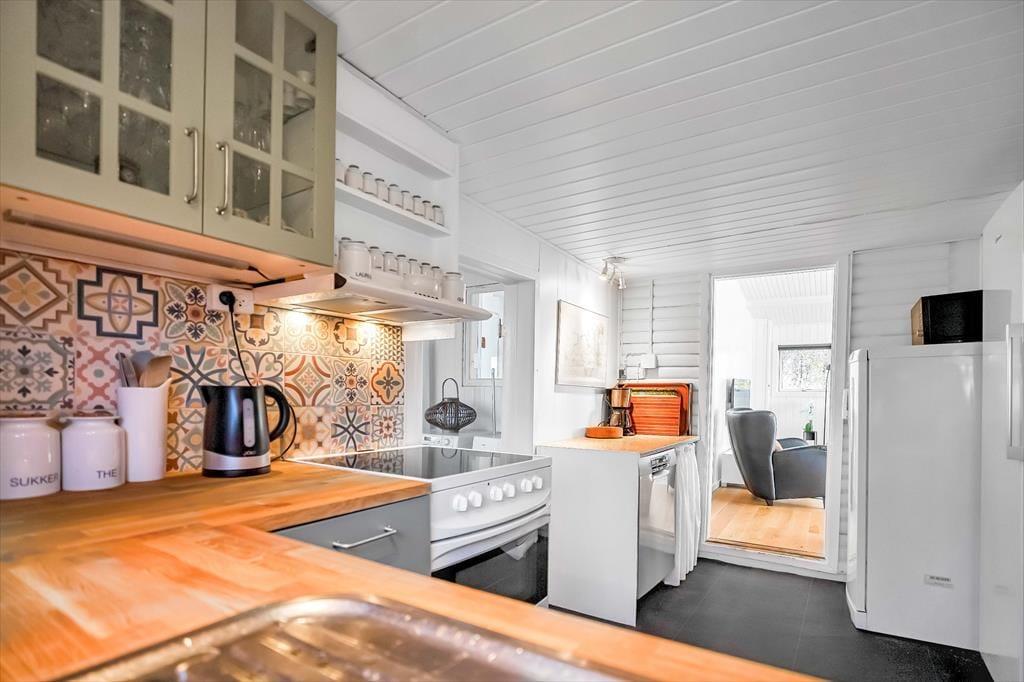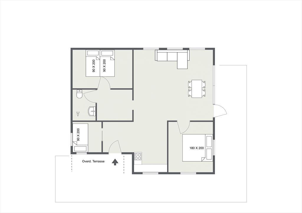 Dieses schöne Ferienhaus präsentiert sich hell und einladend und überzeugt mit einer gelungenen Raumaufteilung. Das Wohnzimmer bildet den Mittelpunkt des Hauses, in dem alle gemütlich am Esstisch zusammenkommen und den Blick in das weitläufige Grundstück genießen können. Kühle Sommerabende verbringst du entspannt vor dem Fernseher oder mit einem guten Buch auf dem Sofa, während das Knistern des Kaminofens für Ferienhausstimmung sorgt. Vom Wohnzimmer aus gelangst du direkt auf die große Holzterrasse.