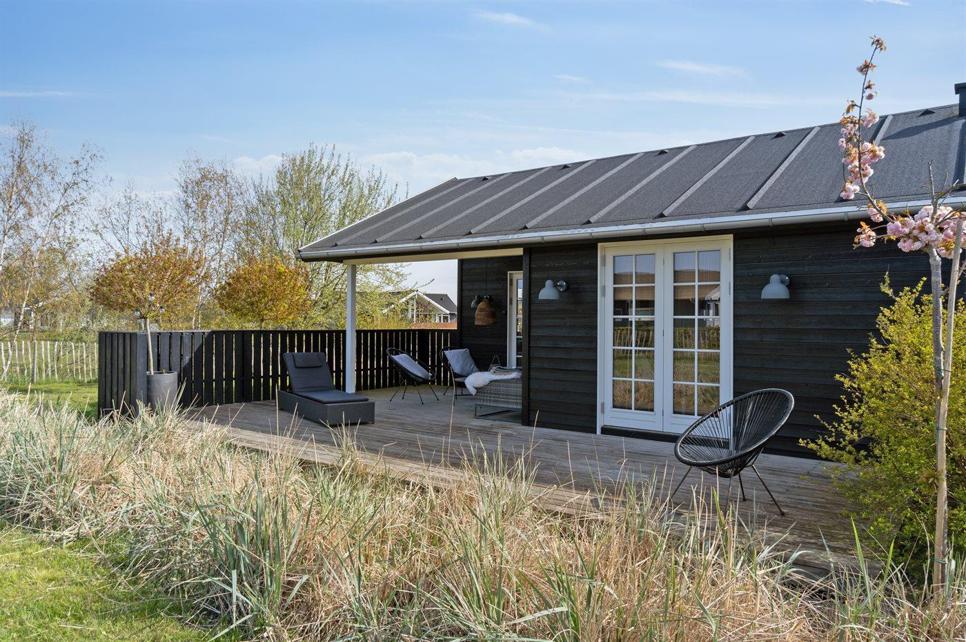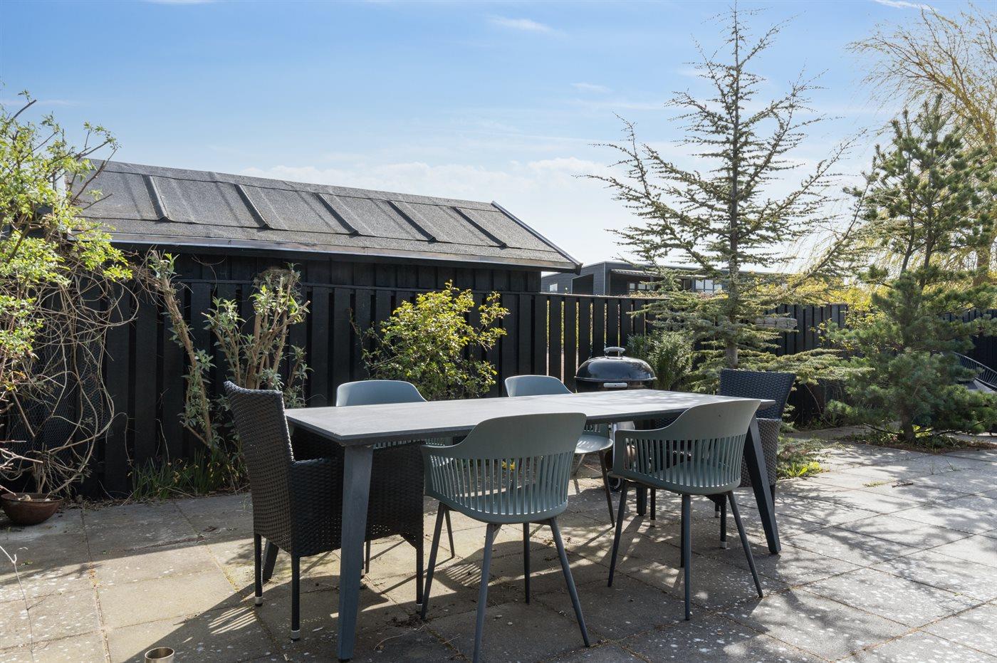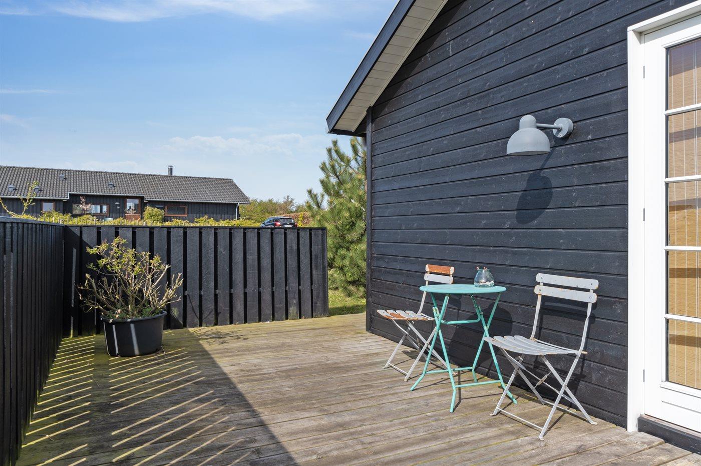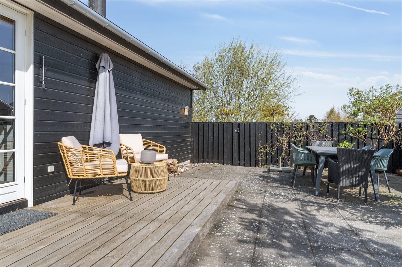 Fritidsbostaden ligger på en 966 m² stor anlagd trädgård. Närmeste affär ligger på ett avstånd av 2500 m. Till fritidsbostaden hör 70 m² terrass. Dessutom finns det 14 m² övertäckt terrass. Härav totalt 40 m² stängt terrass. Utomhus dusch. Det finns grill til förfogande. P-plats på tomten.