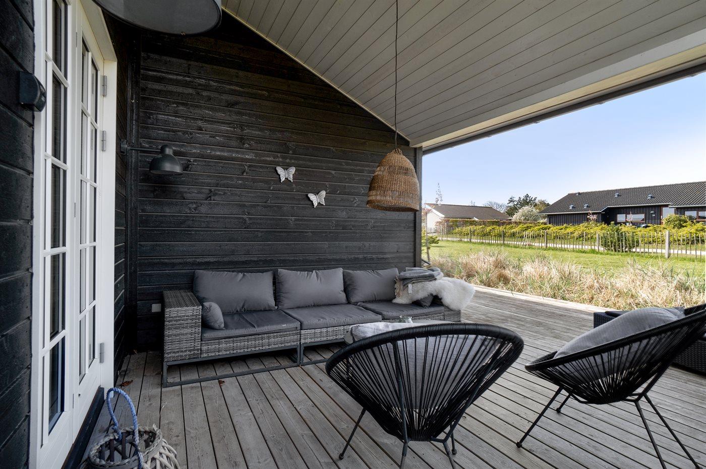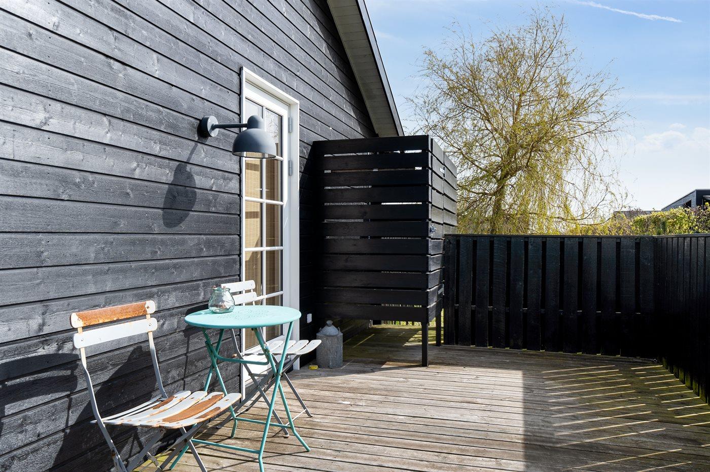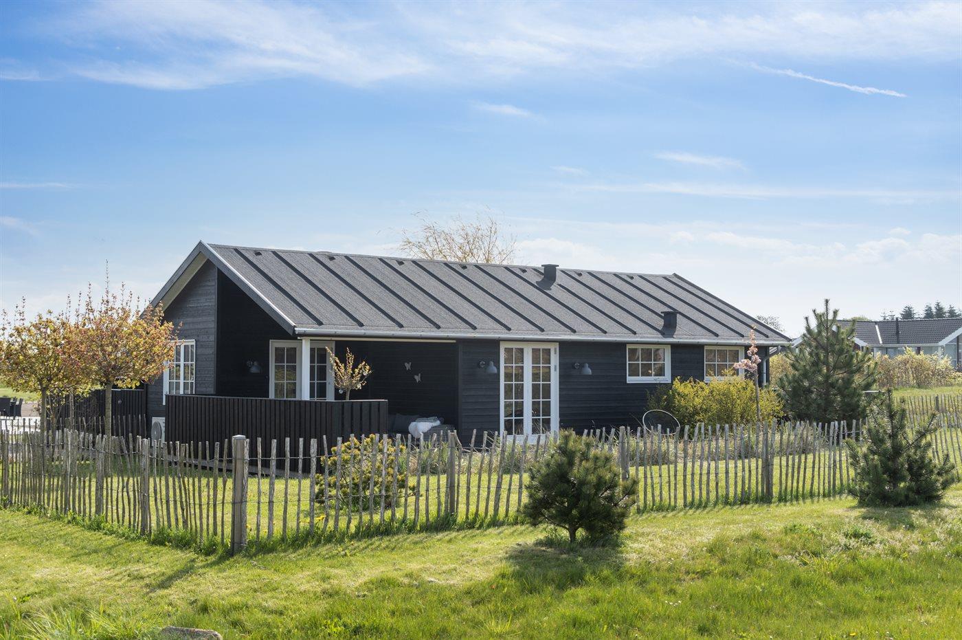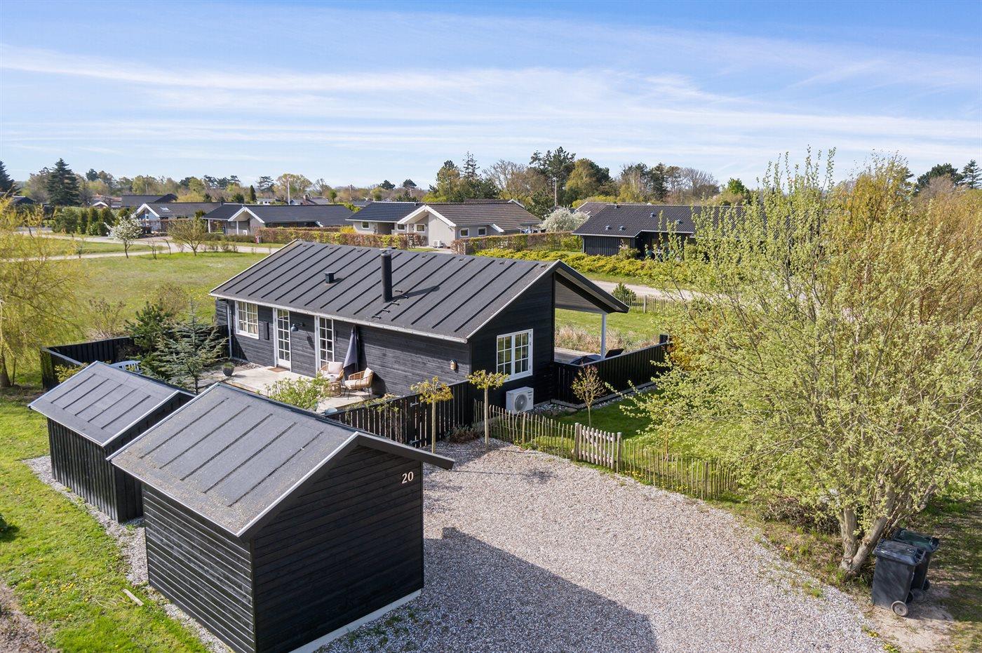 Fritidsbostaden ligger på en 966 m² stor anlagd trädgård. Närmeste affär ligger på ett avstånd av 2500 m. Till fritidsbostaden hör 70 m² terrass. Dessutom finns det 14 m² övertäckt terrass. Härav totalt 40 m² stängt terrass. Utomhus dusch. Det finns grill til förfogande. P-plats på tomten.