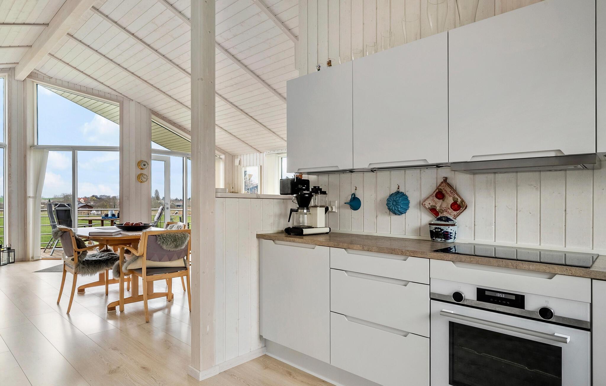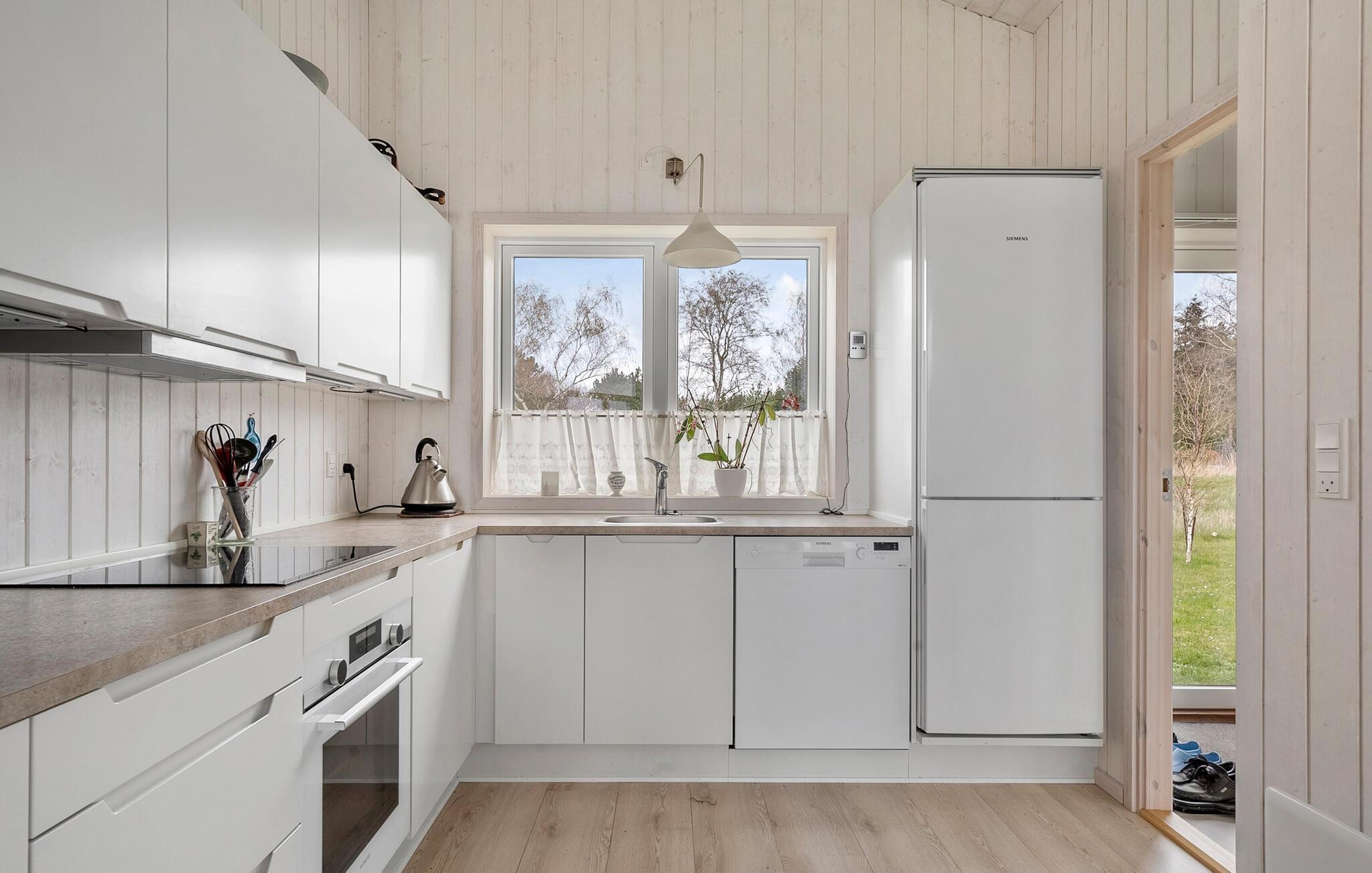 I ett lugnt läge inbjuder detta välskötta semesterhus dig att ta en avkopplande paus. Koppla av i det mysiga vardagsrummet med högt i tak, stora fönster och gott om naturligt ljus. Den tydliga, skandinaviska stilen skapar en trevlig atmosfär. Njut av måltiderna tillsammans vid matbordet och avsluta kvällen i soffan med en god bok eller ett stimulerande samtal. Ni kan laga mat tillsammans i det moderna köket med öppen planlösning.