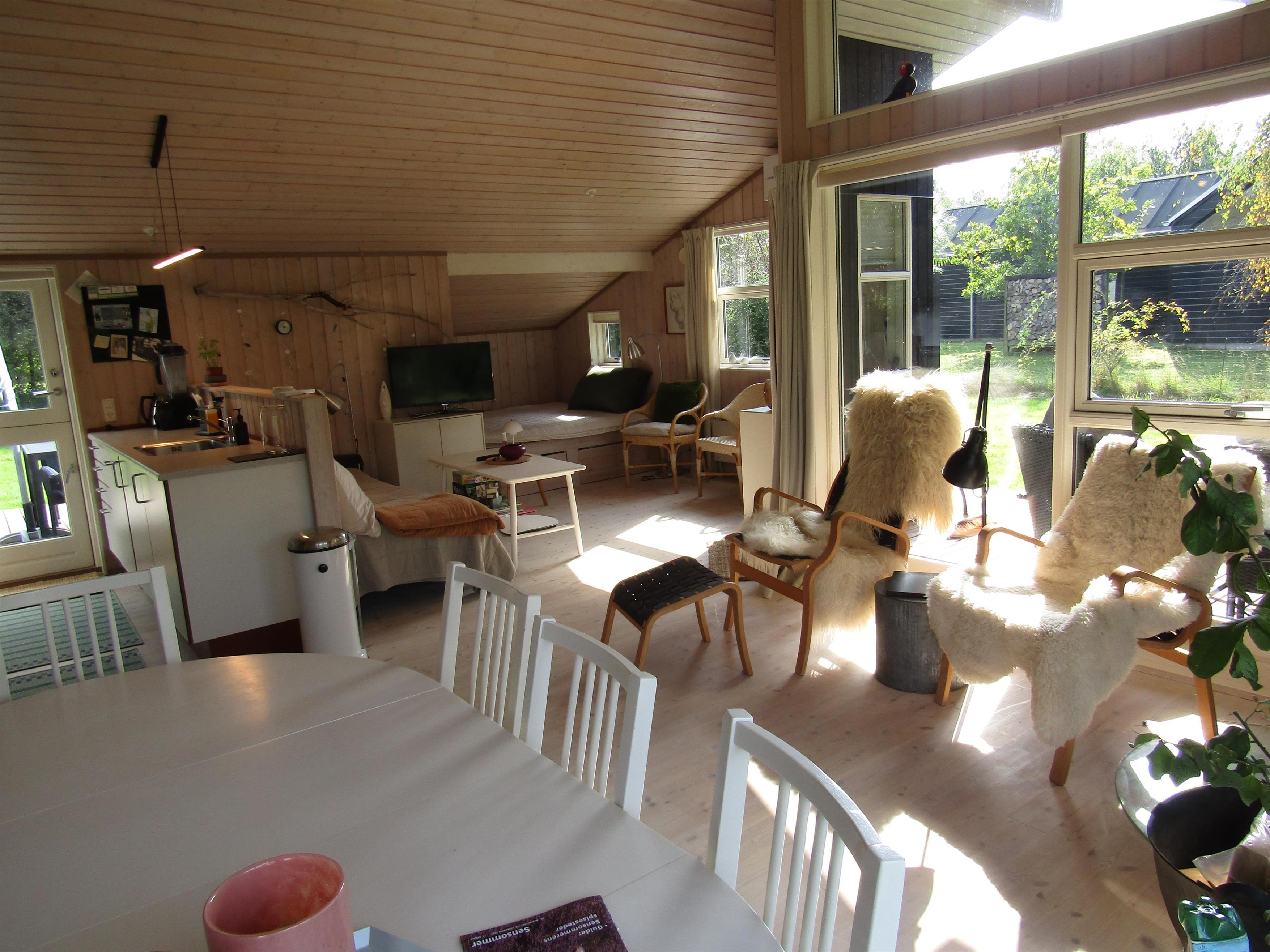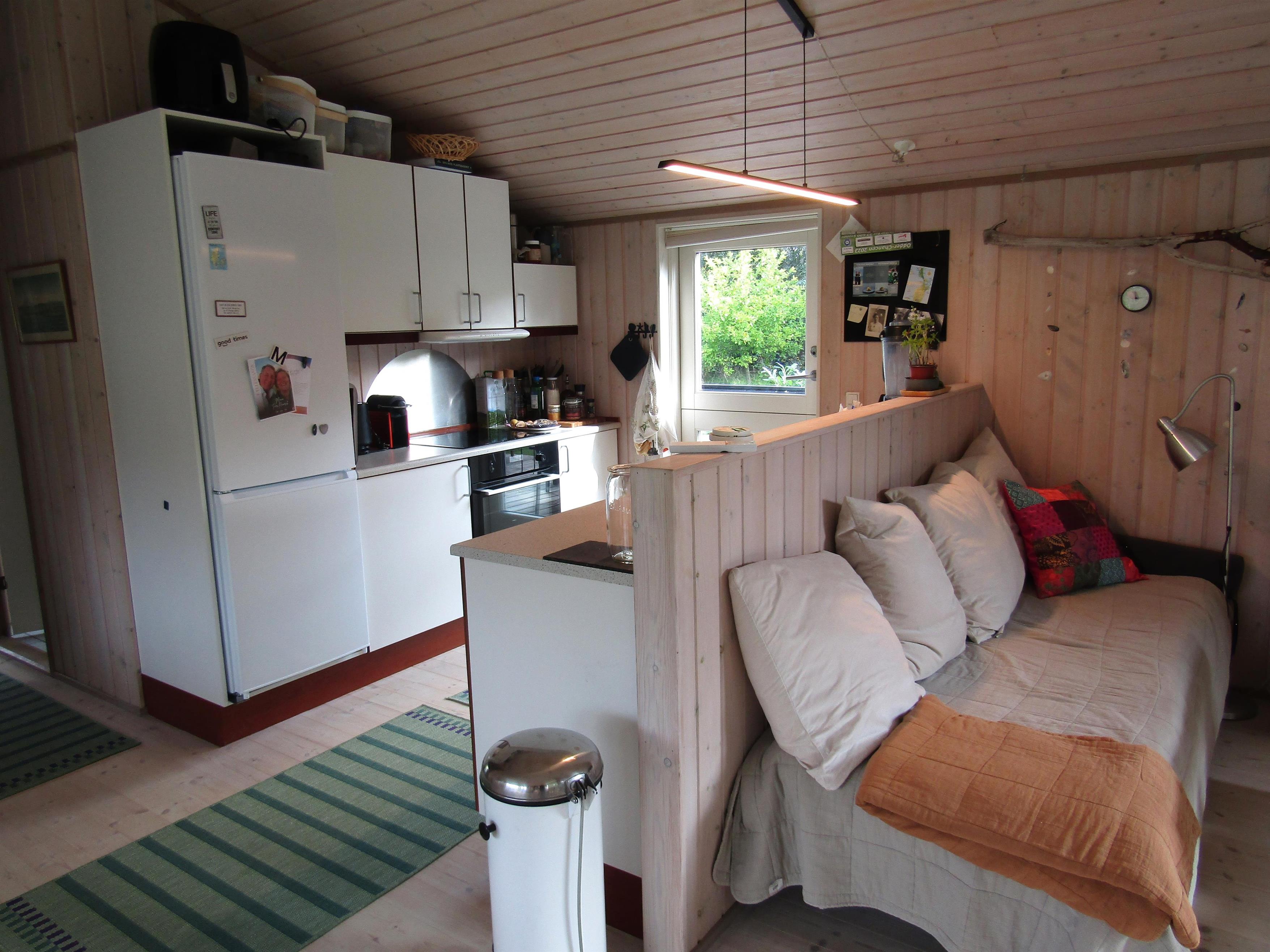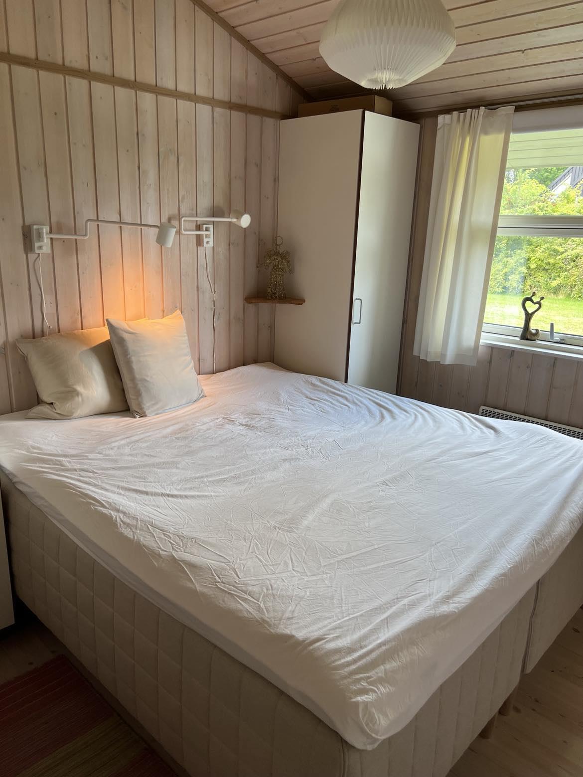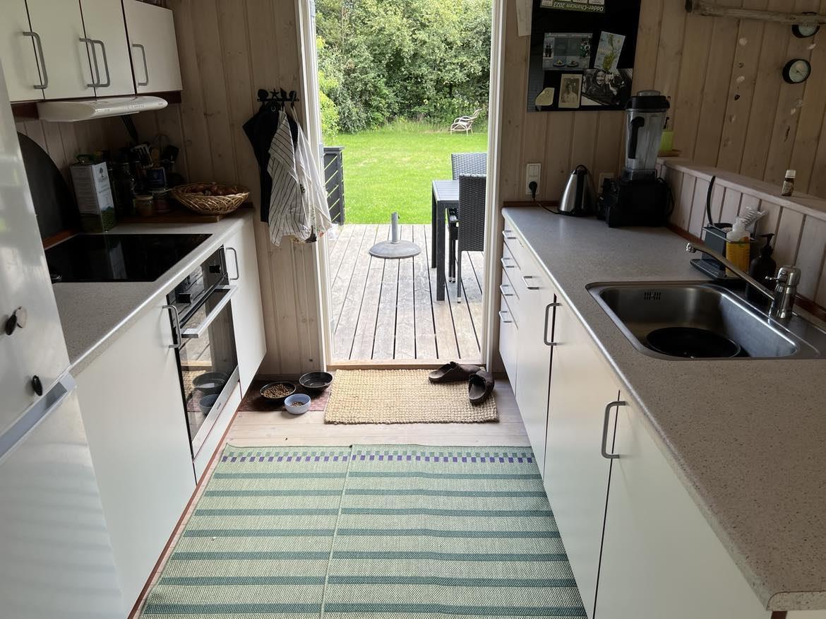 Here you will find a bright and inviting gathering place in the form of a spacious kitchen-living room, where large windows bring the garden right inside. In the living room you will find a cosy dining area and a comfortable sofa corner where you can relax after the day's adventures. On cool days, the wood-burning stove provides both warmth and a lovely atmosphere – the perfect setting for a relaxed evening. The holiday home is wood-panelled inside and has three good bedrooms: one with a double bed, one with two single beds and one with a single bed. In addition, the living room offers a lovely alcove, ideal as extra sleeping space, a reading corner or a cosy place for the children to play.