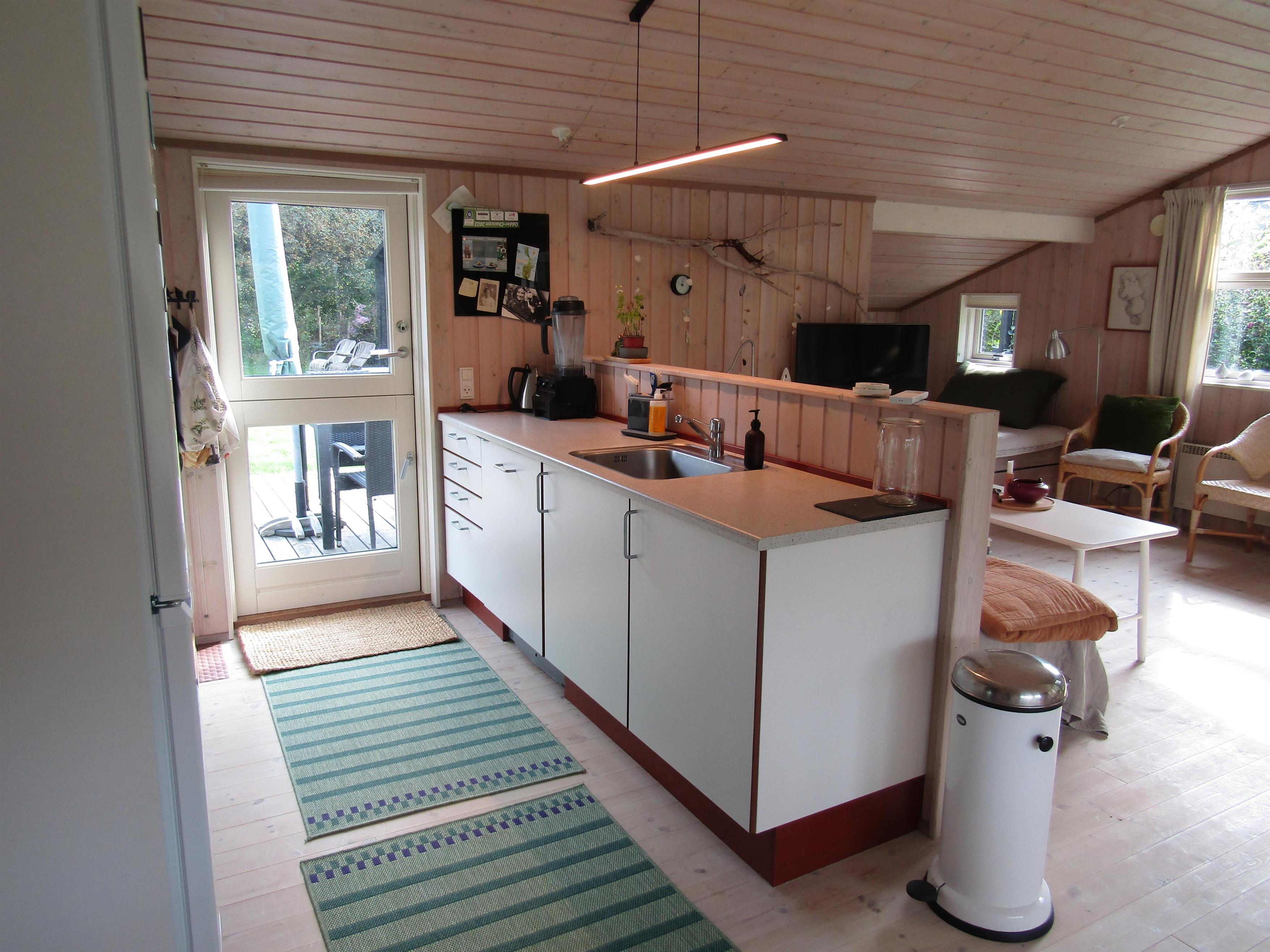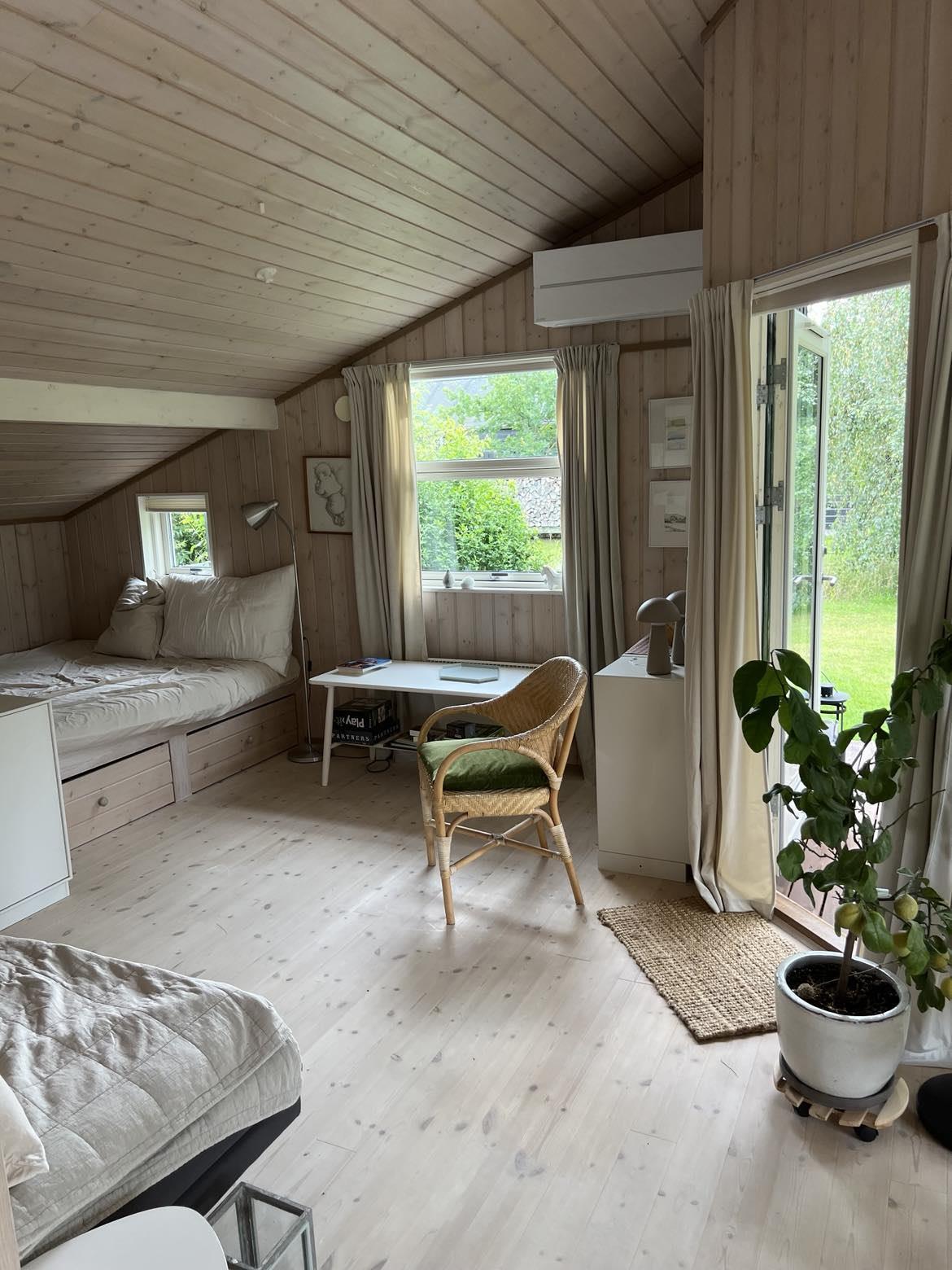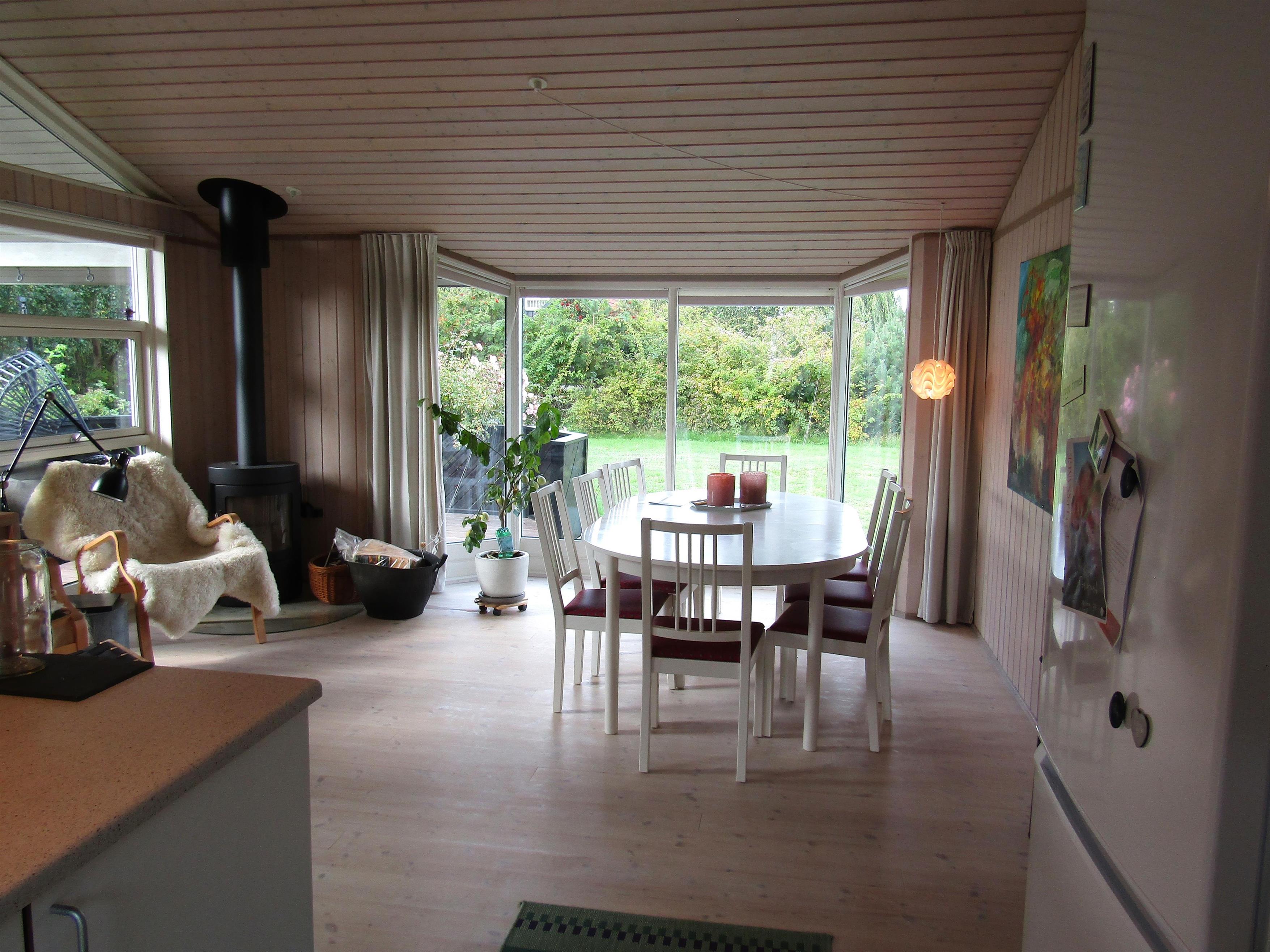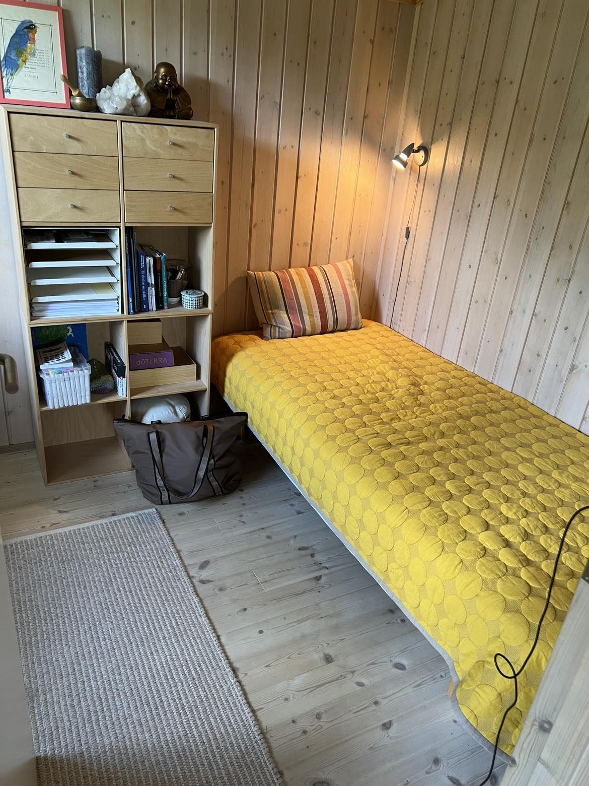 Here you will find a bright and inviting gathering place in the form of a spacious kitchen-living room, where large windows bring the garden right inside. In the living room you will find a cosy dining area and a comfortable sofa corner where you can relax after the day's adventures. On cool days, the wood-burning stove provides both warmth and a lovely atmosphere – the perfect setting for a relaxed evening. The holiday home is wood-panelled inside and has three good bedrooms: one with a double bed, one with two single beds and one with a single bed. In addition, the living room offers a lovely alcove, ideal as extra sleeping space, a reading corner or a cosy place for the children to play.