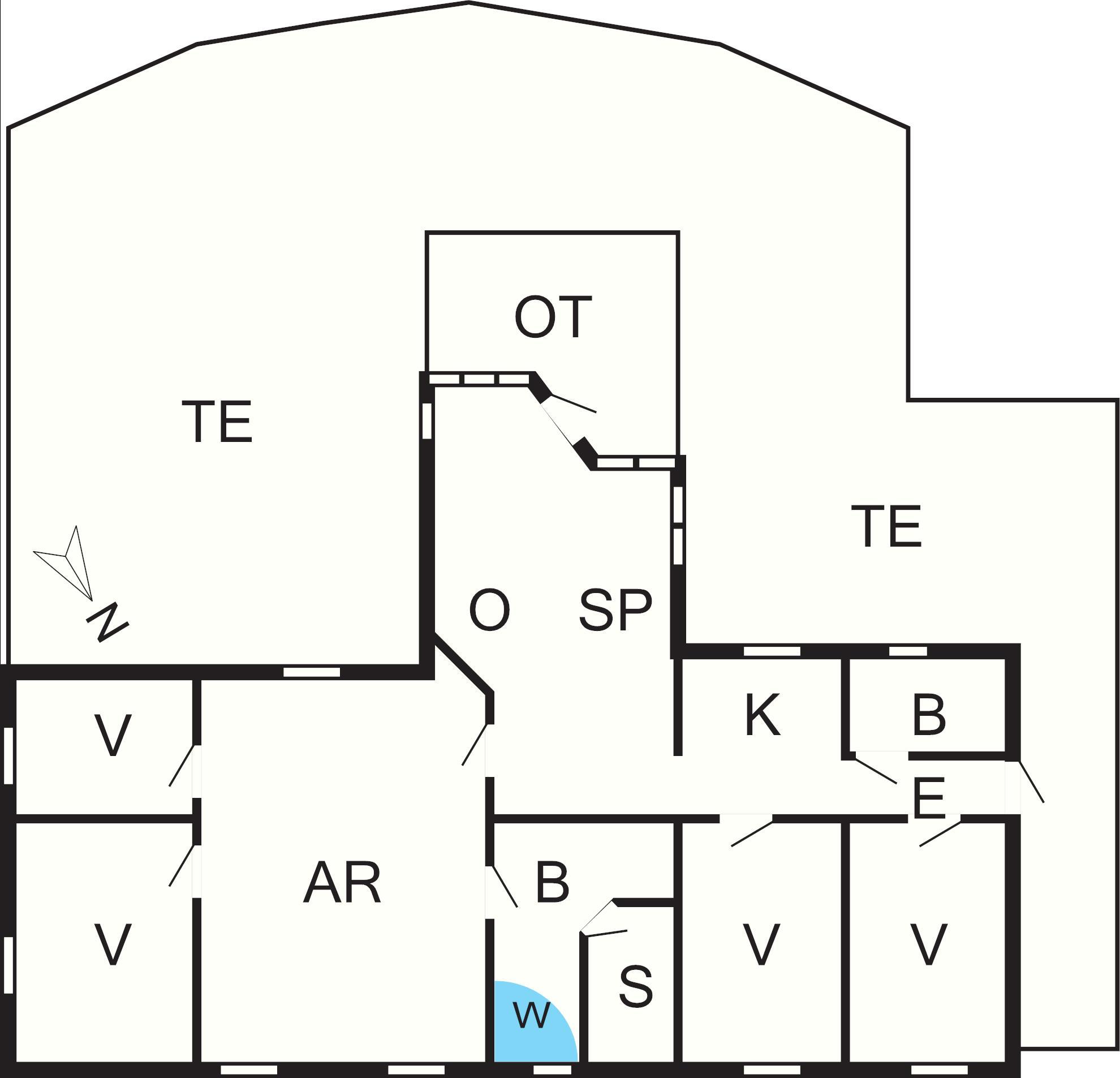 Soveområderne er fordelt på to soveværelser med hver to enkeltsenge, to mere med dobbeltseng og en hems med to senge. Ekstra TV i et af værelserne. Der er to gode badeværelser med gulvvarme og bruseniche. Den ene er desuden udstyret med et smukt spabad til 2 personer og direkte adgang til saunaen. Vaskemaskine og tørretumbler til rådighed i det lille badeværelse.