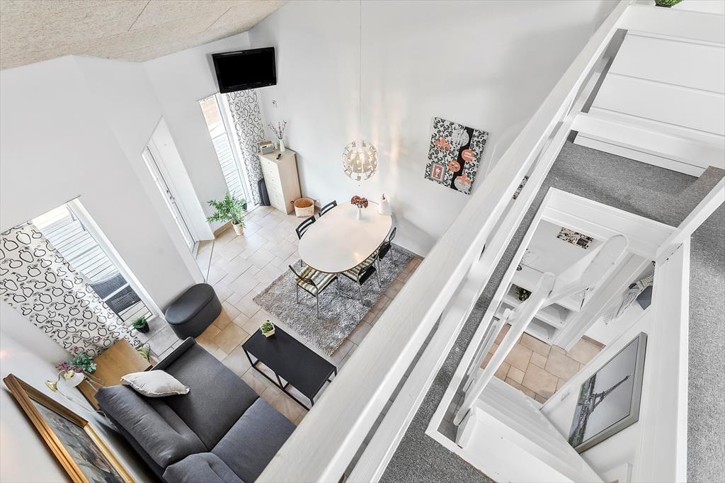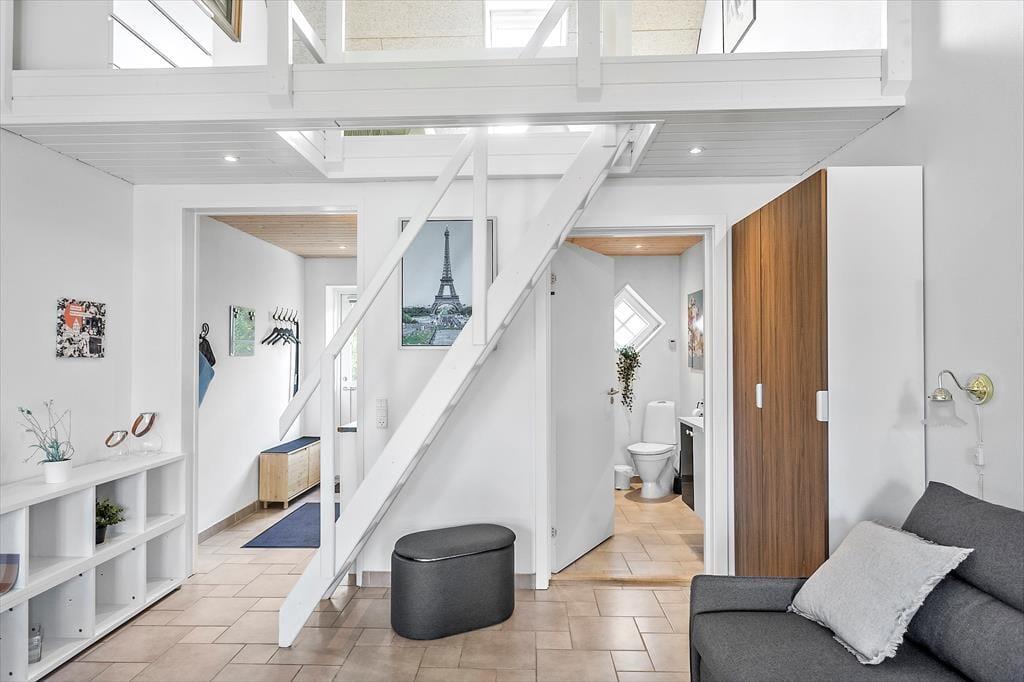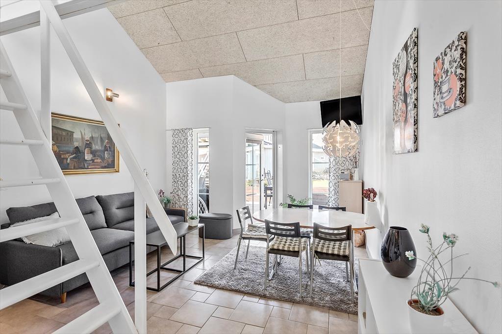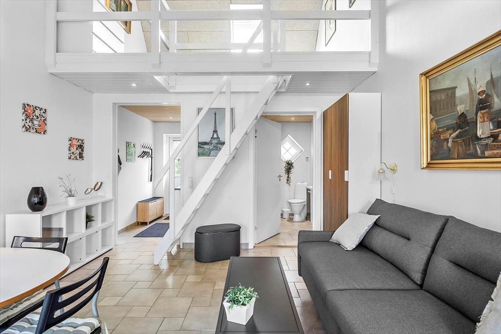Die Ferienwohnung verfügt über eine Küche, in der sich die Dinge befinden, die Sie während Ihres Urlaubs benötigen. Darüber hinaus gibt es ein Wohnzimmer mit Essbereich und Zugang zur Terrasse der Ferienwohnung. Vom Wohnzimmer aus gelangt man in das Badezimmer der Wohnung, wo sich eine Toilette und eine Dusche befinden. Vom Wohnzimmer führt eine Treppe hinauf zum Schlafzimmer der Wohnung, wo sich ein Doppelbett und ein Einzelbett befinden. Im Wohnzimmer befindet sich ein Doppelschlafsofa, auf dem sich die letzten Schlafplätze befinden.