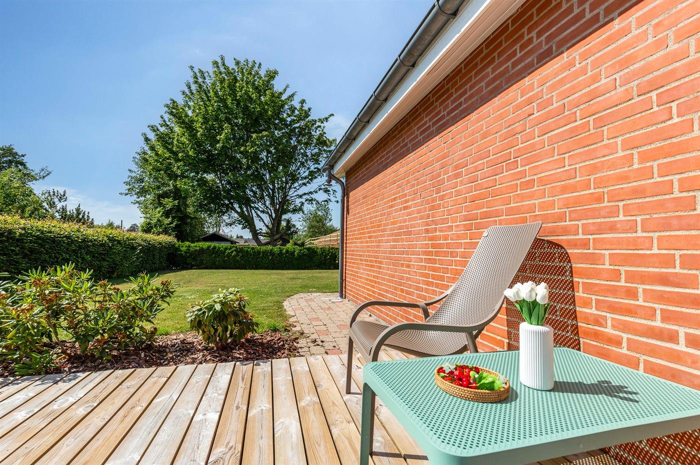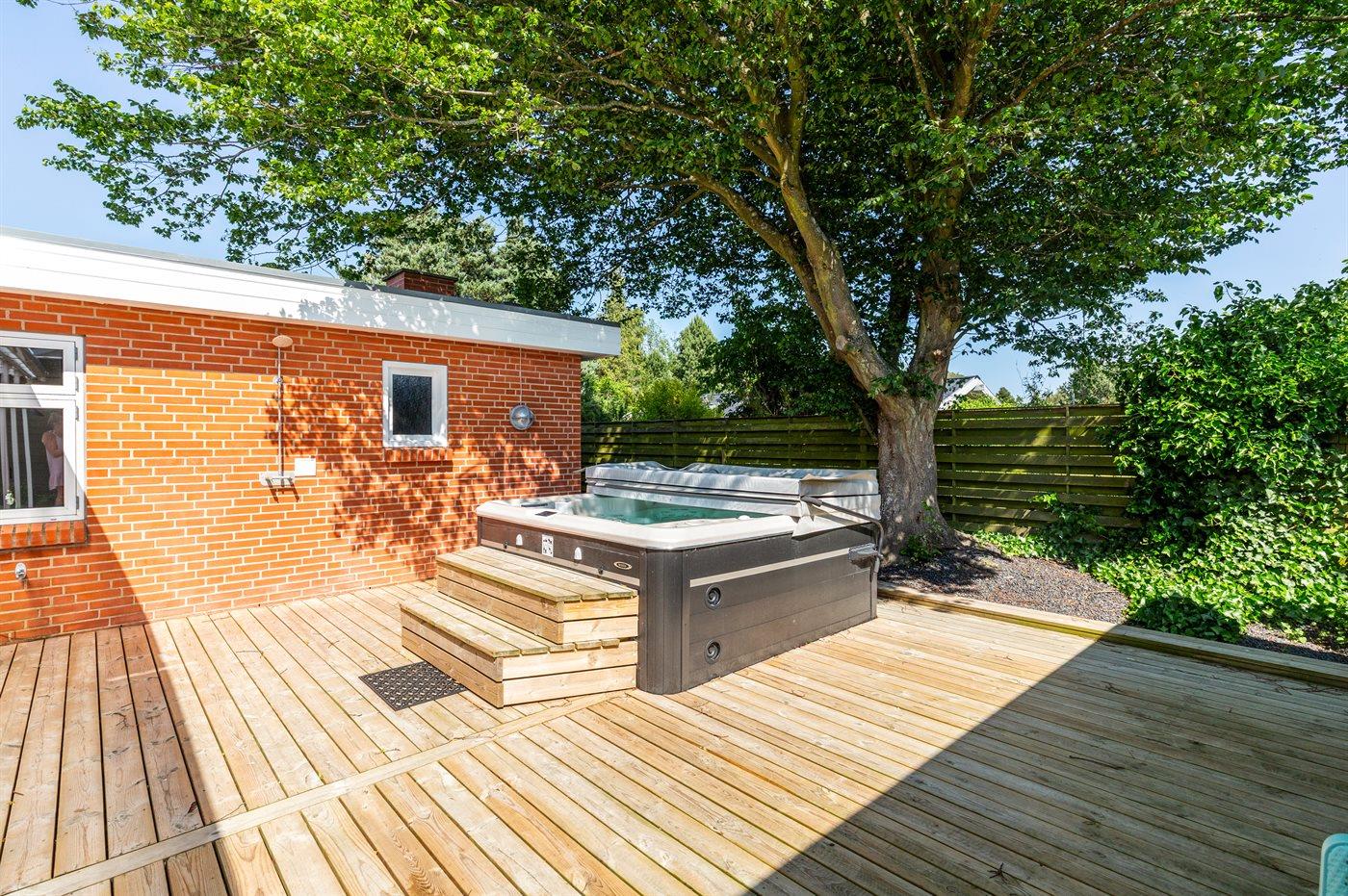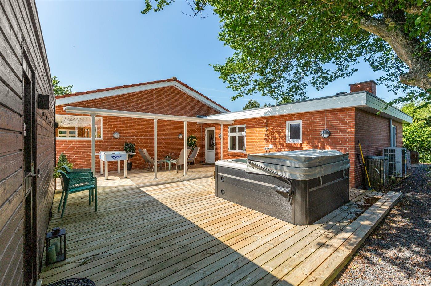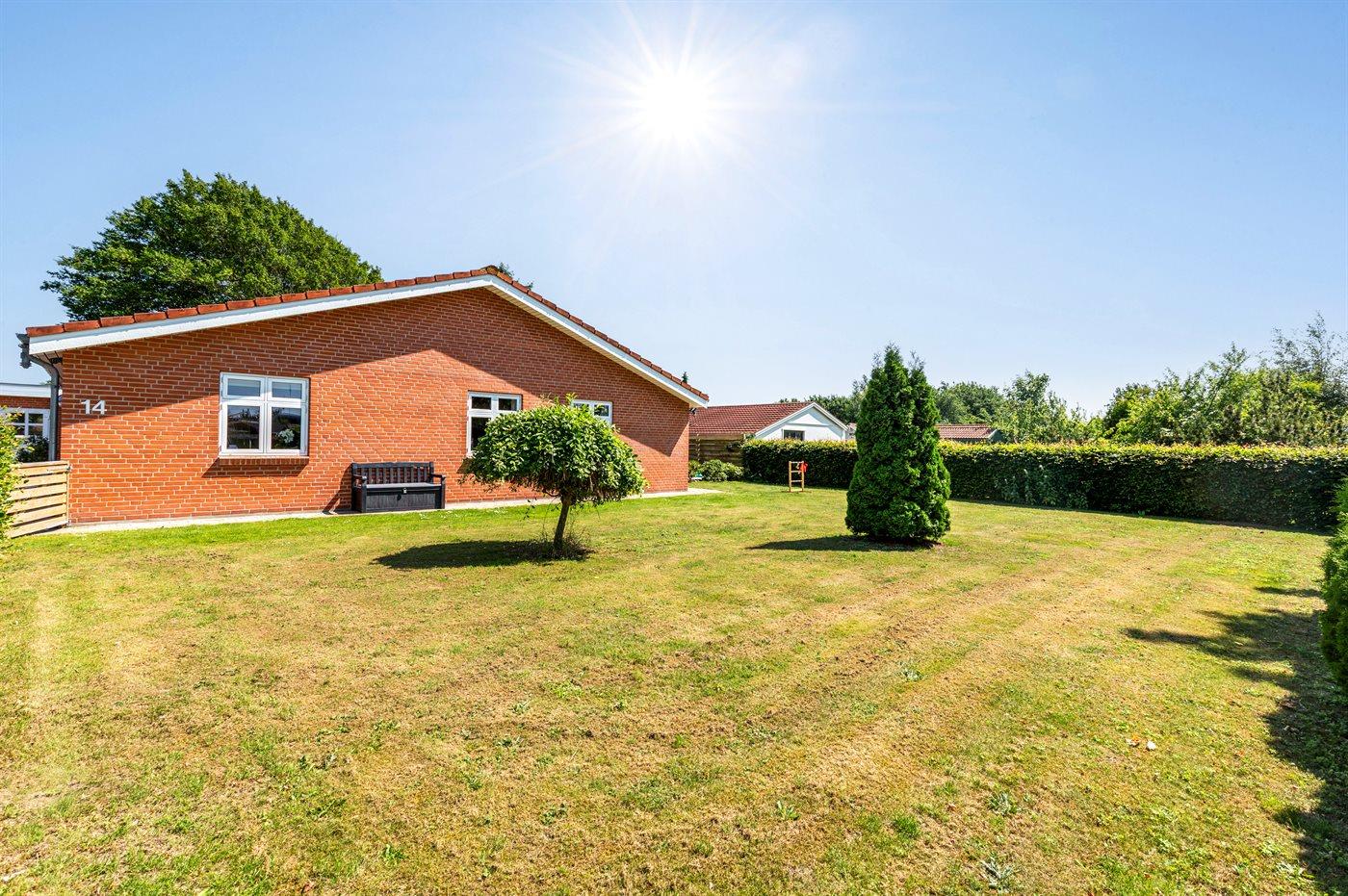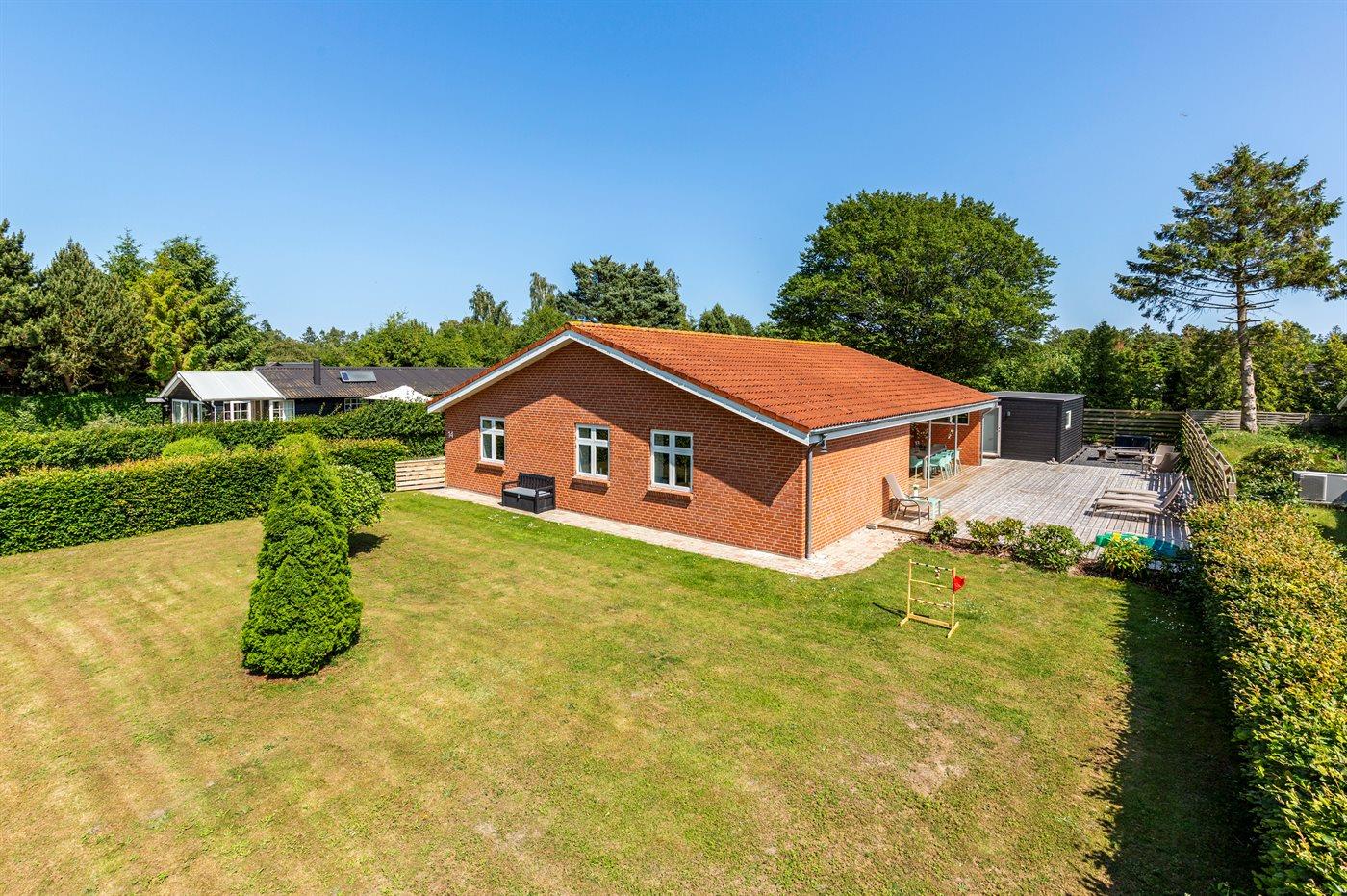 Fritidsbostaden ligger på en 946 m² stor anlagd trädgård. Tomten är inhägnad. Avstånd till hav är 540 m. Närmeste affär ligger på ett avstånd av 240 m. Till fritidsbostaden hör terrass. Dessutom finns det övertäckt terrass. Sandlåda. Öppen spis. Utomhus sauna. Utomhus dusch. Det finns grill til förfogande. Det finns uttag för att ladda elbil vid huset. Kontakt typ 2. Med 11 kW laddningseffekt. P-plats på tomten.