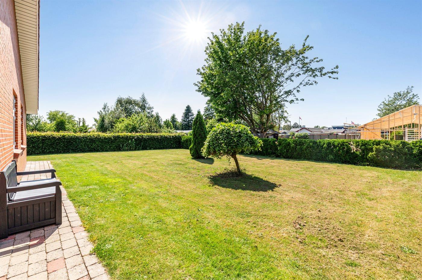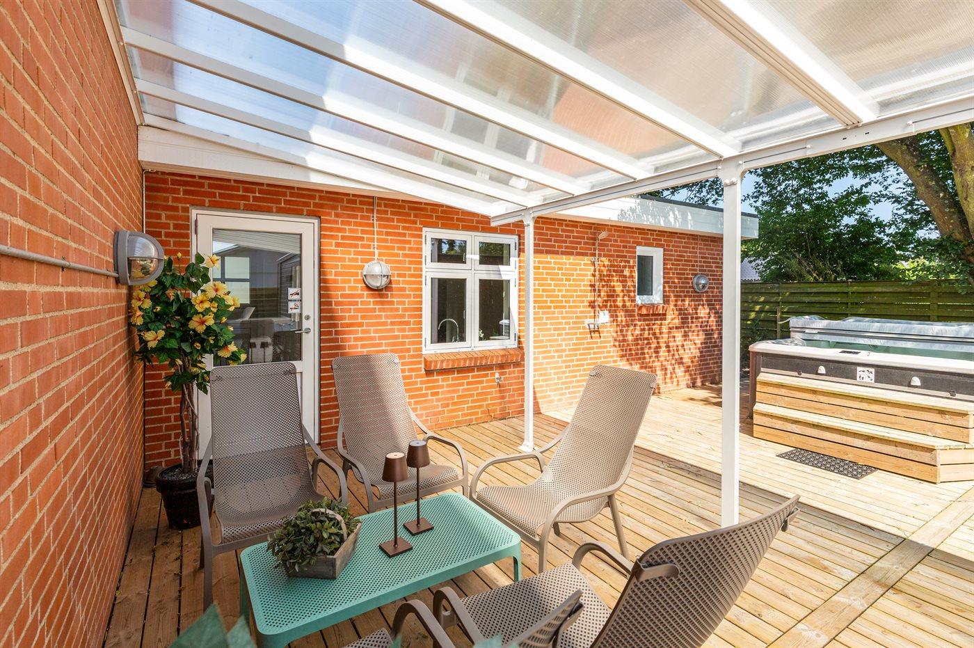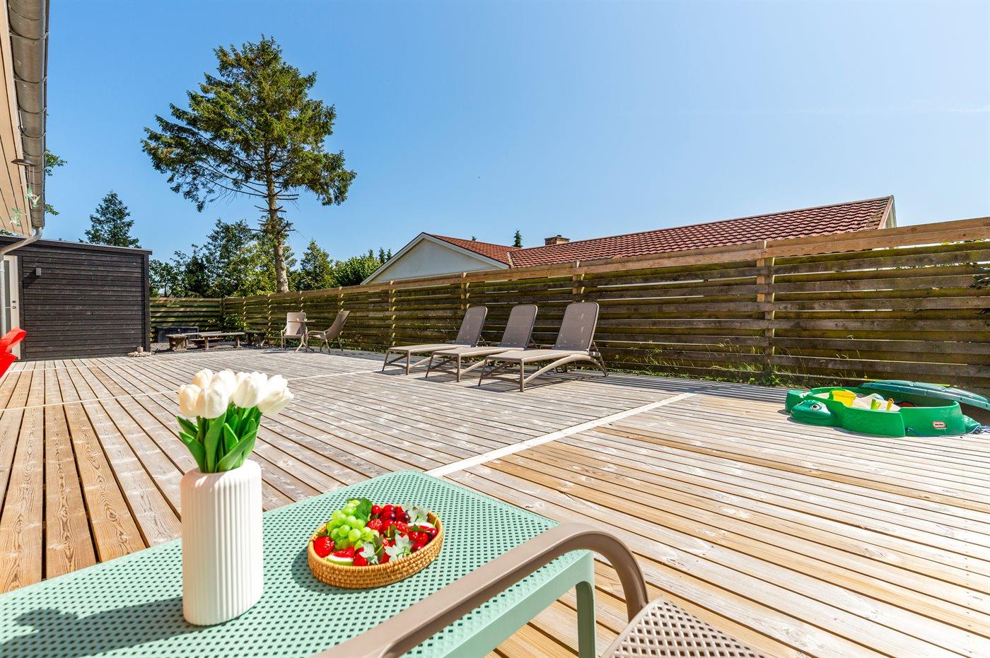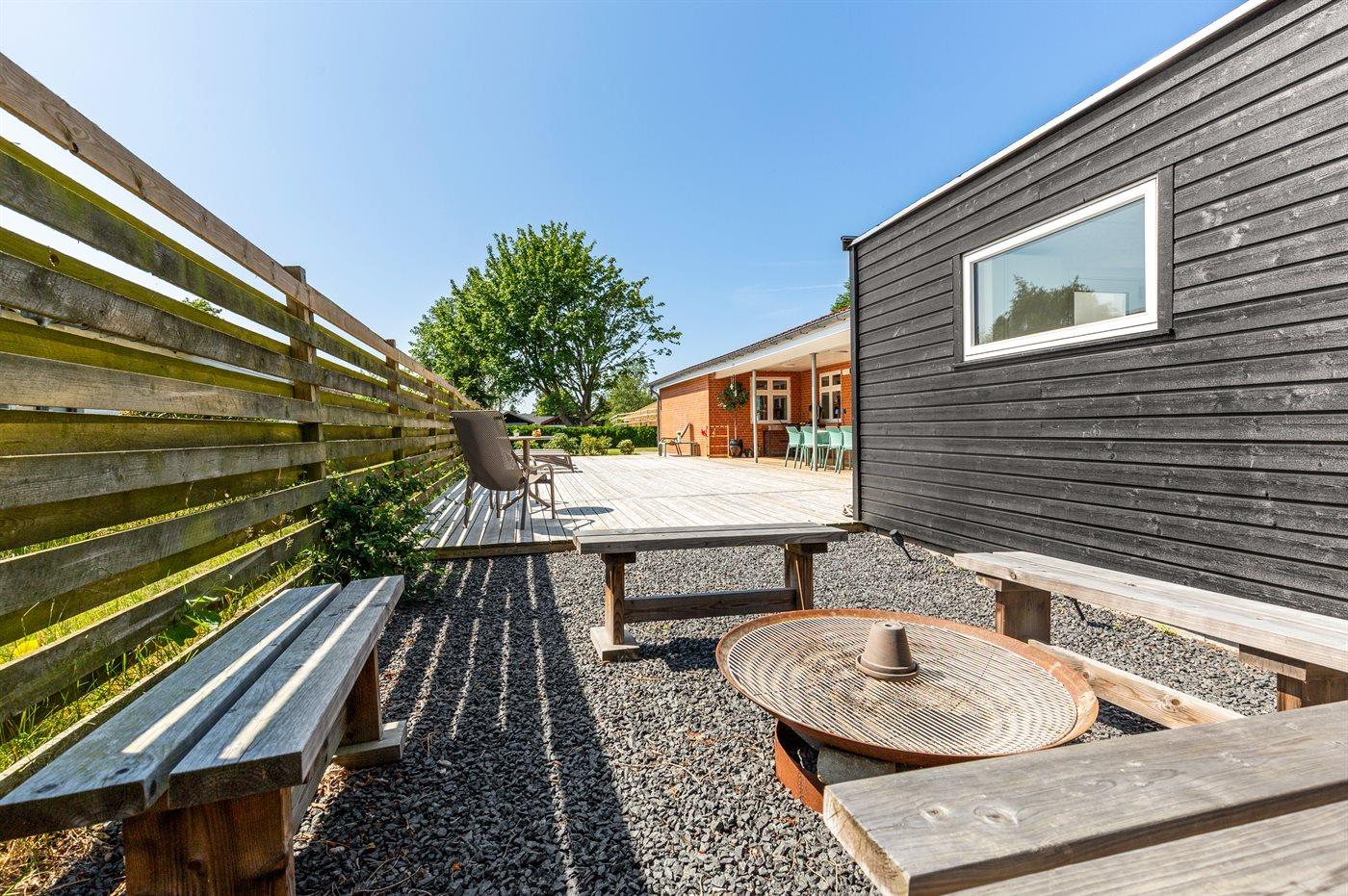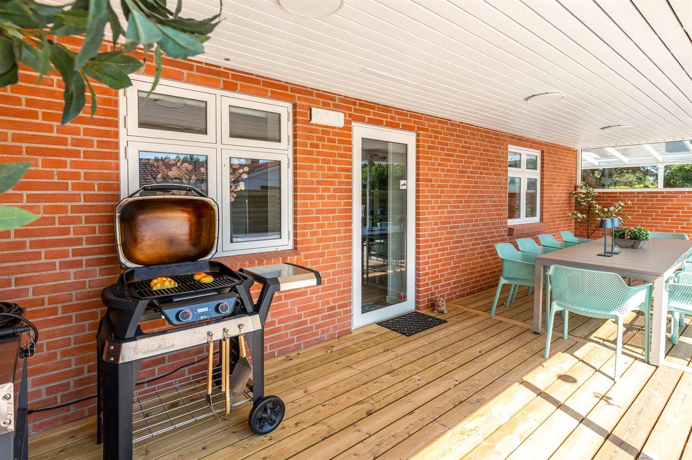Fritidsbostaden ligger på en 946 m² stor anlagd trädgård. Tomten är inhägnad. Avstånd till hav är 540 m. Närmeste affär ligger på ett avstånd av 240 m. Till fritidsbostaden hör terrass. Dessutom finns det övertäckt terrass. Sandlåda. Öppen spis. Utomhus sauna. Utomhus dusch. Det finns grill til förfogande. Det finns uttag för att ladda elbil vid huset. Kontakt typ 2. Med 11 kW laddningseffekt. P-plats på tomten.