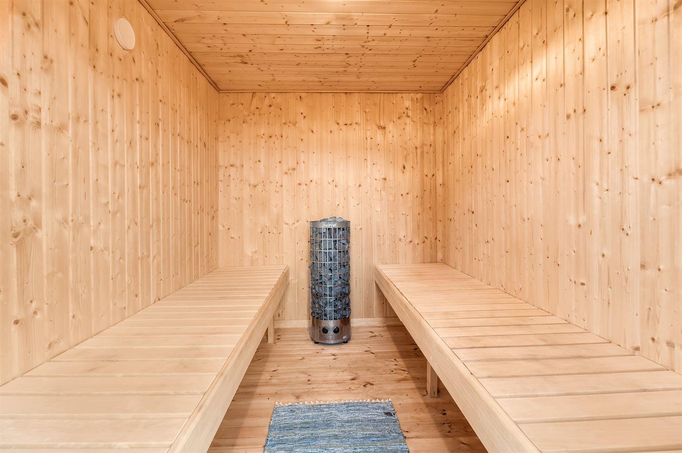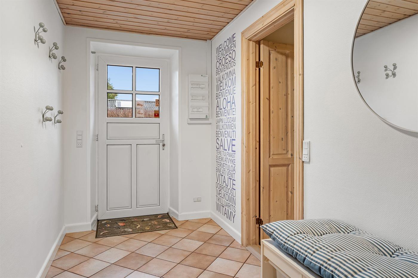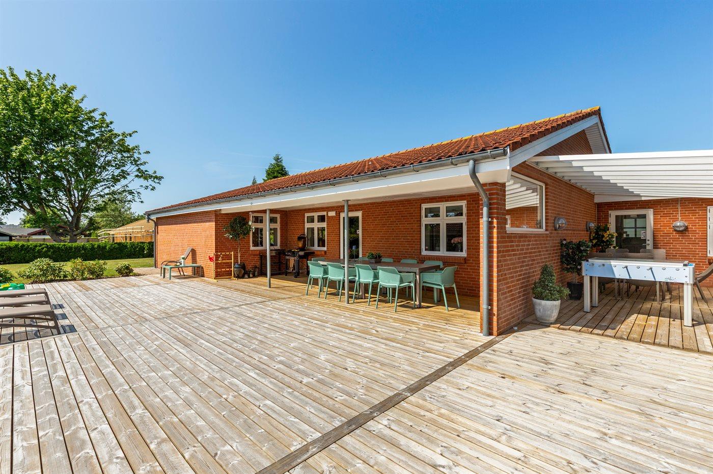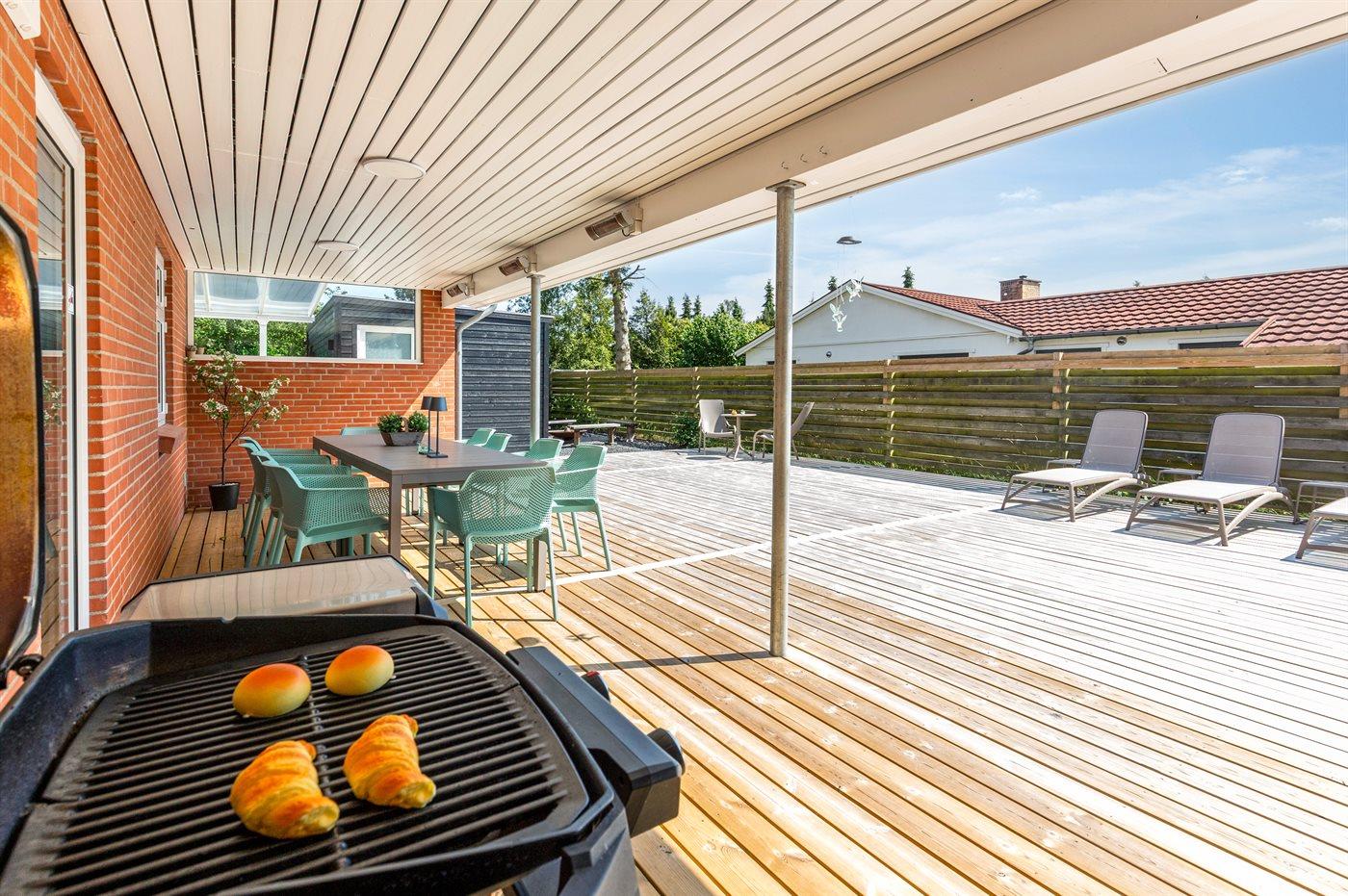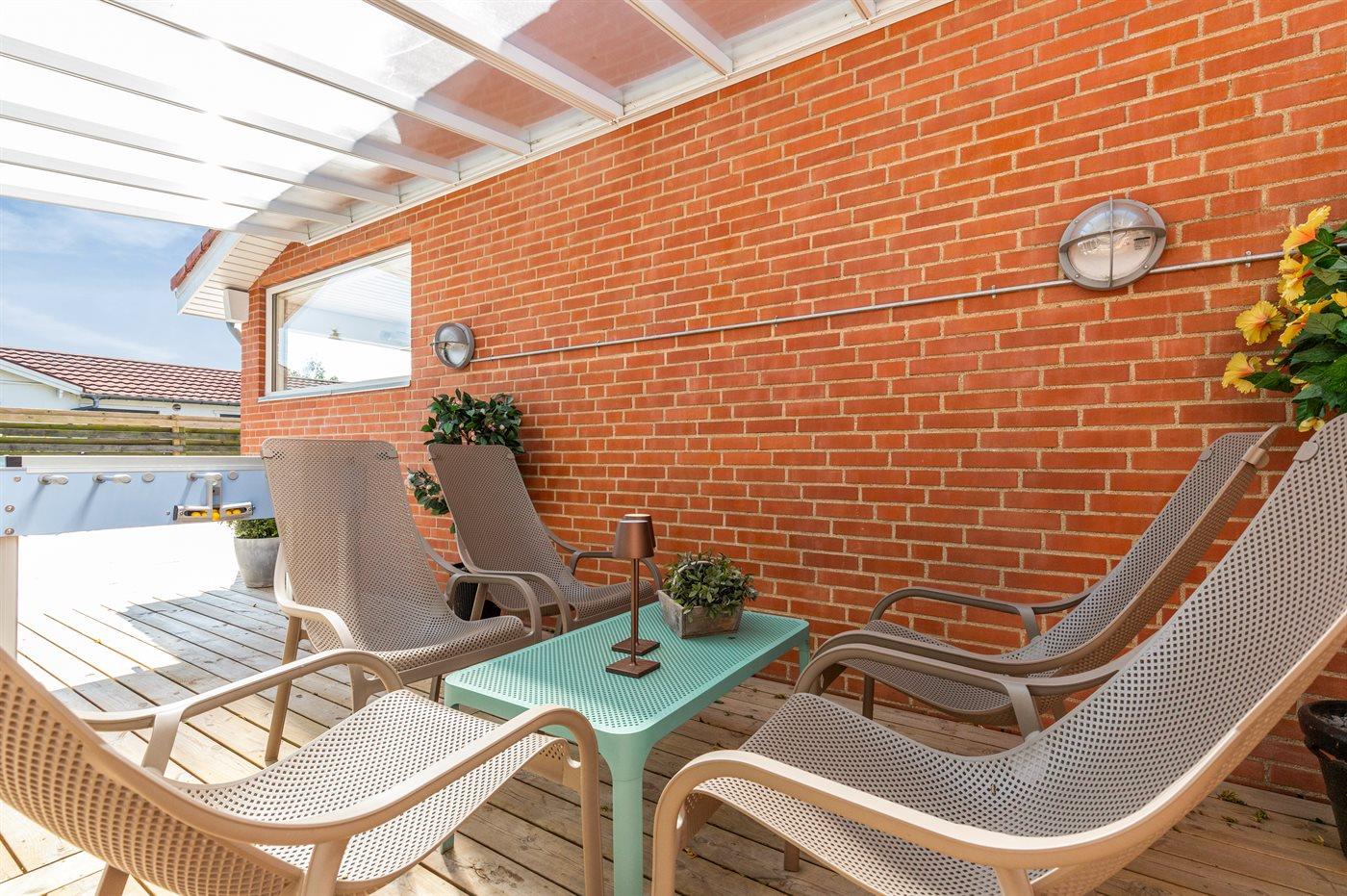 Fritidsbostaden ligger på en 946 m² stor anlagd trädgård. Tomten är inhägnad. Avstånd till hav är 540 m. Närmeste affär ligger på ett avstånd av 240 m. Till fritidsbostaden hör terrass. Dessutom finns det övertäckt terrass. Sandlåda. Öppen spis. Utomhus sauna. Utomhus dusch. Det finns grill til förfogande. Det finns uttag för att ladda elbil vid huset. Kontakt typ 2. Med 11 kW laddningseffekt. P-plats på tomten.