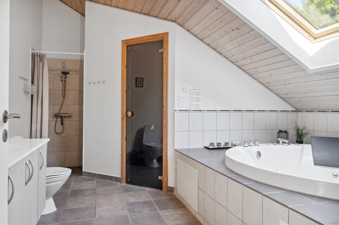 Det finns 2 badrum med duschkabin och 2 toaletter. Det finns golvvärme i 1 badrum. I bastun finns det möjlighet för avkoppling.