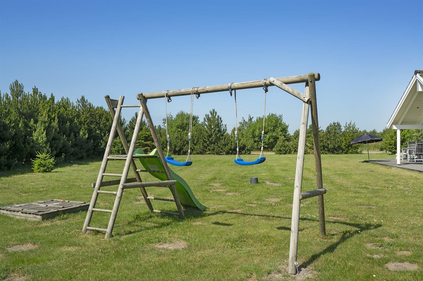 Fritidsbostaden ligger på en 1401 m² stor anlagd trädgård. Avstånd till hav är 1100 m. Närmeste affär ligger på ett avstånd av 900 m. Det finns en golfbana på ett avstånd av 1000 m. Till fritidsbostaden hör 90 m² terrass. Dessutom finns det 10 m² övertäckt terrass. Gunga. Sandlåda. Det finns uttag för att ladda elbil vid huset. P-plats på tomten.