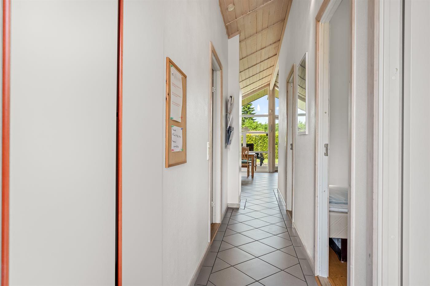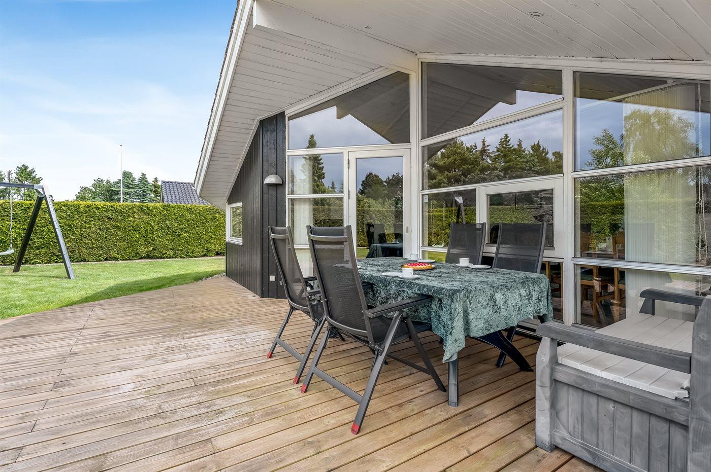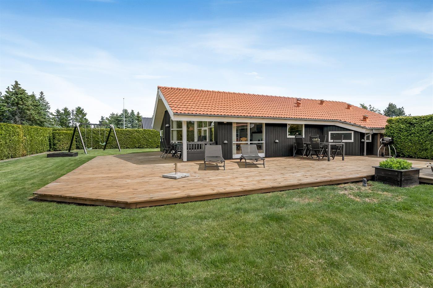 Fritidsbostaden ligger på en 701 m² stor anlagd trädgård. Avstånd till hav är 1000 m. Närmeste affär ligger på ett avstånd av 850 m. Det finns en golfbana på ett avstånd av 2500 m. Till fritidsbostaden hör 22 m² terrass. Dessutom finns det 14 m² övertäckt terrass. Gunga. Sandlåda. Det finns grill til förfogande. P-plats på tomten.