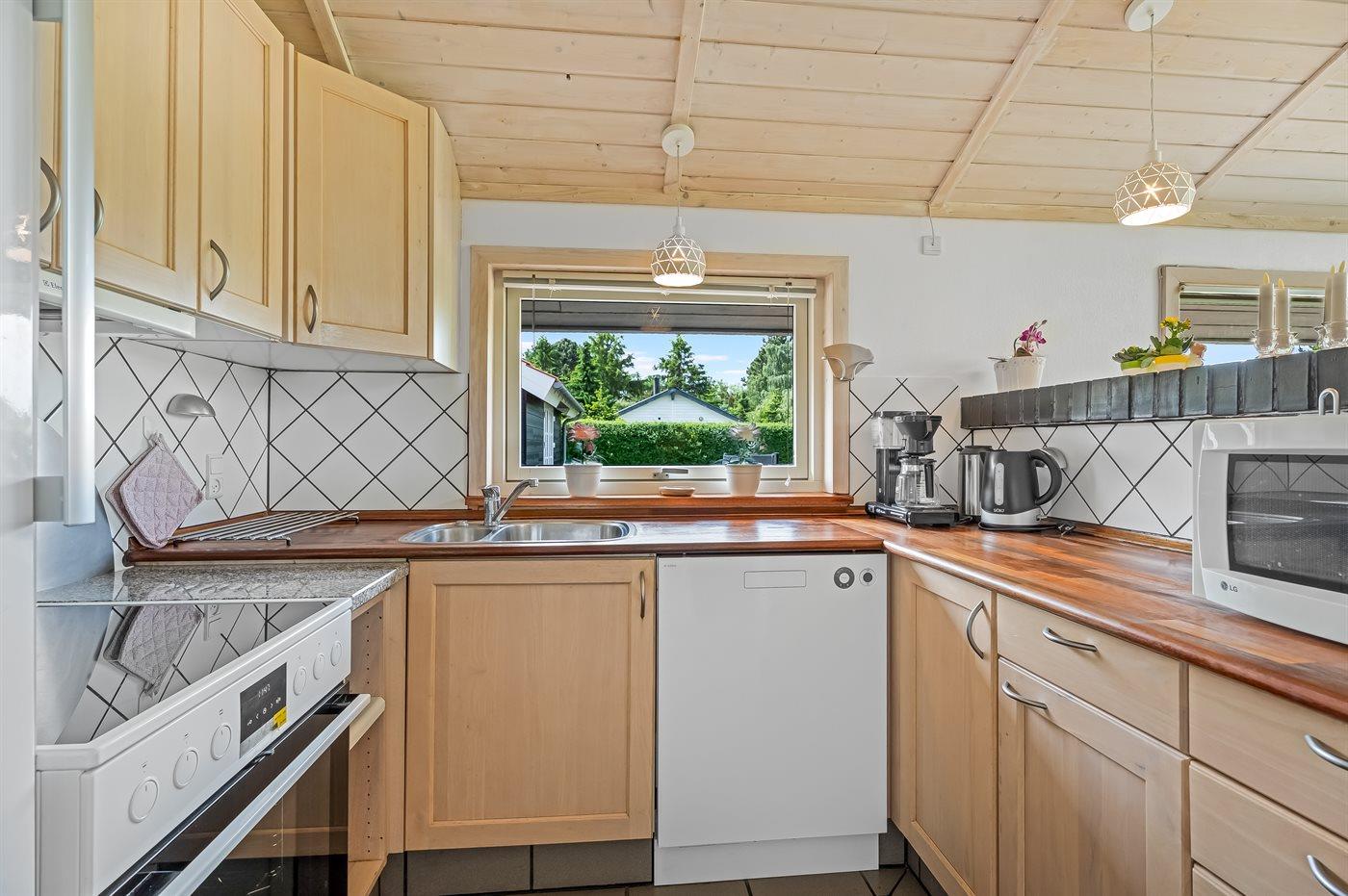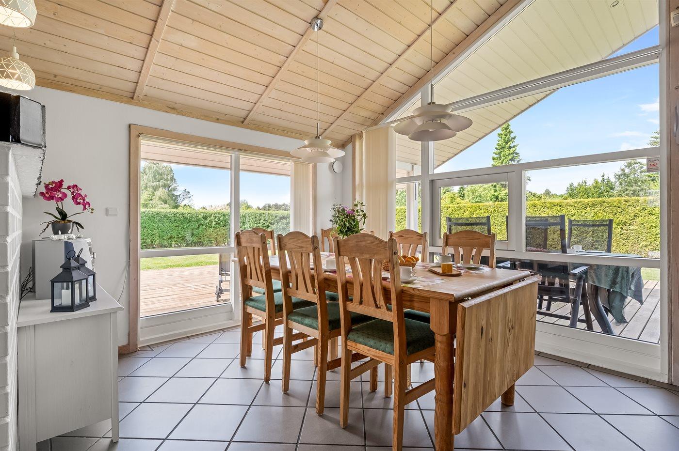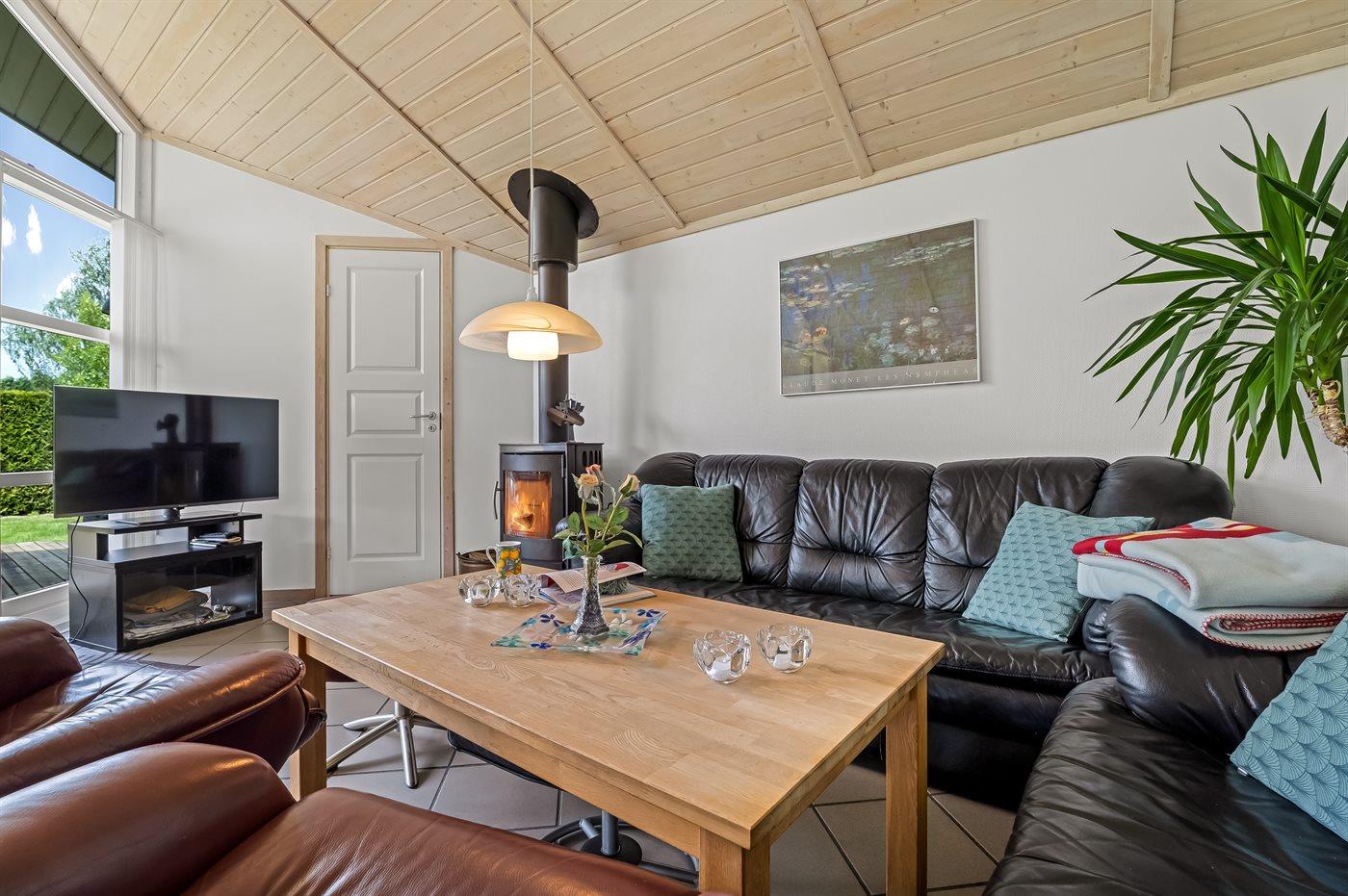 Fritidsbostaden ligger på en 701 m² stor anlagd trädgård. Avstånd till hav är 1000 m. Närmeste affär ligger på ett avstånd av 850 m. Det finns en golfbana på ett avstånd av 2500 m. Till fritidsbostaden hör 22 m² terrass. Dessutom finns det 14 m² övertäckt terrass. Gunga. Sandlåda. Det finns grill til förfogande. P-plats på tomten.