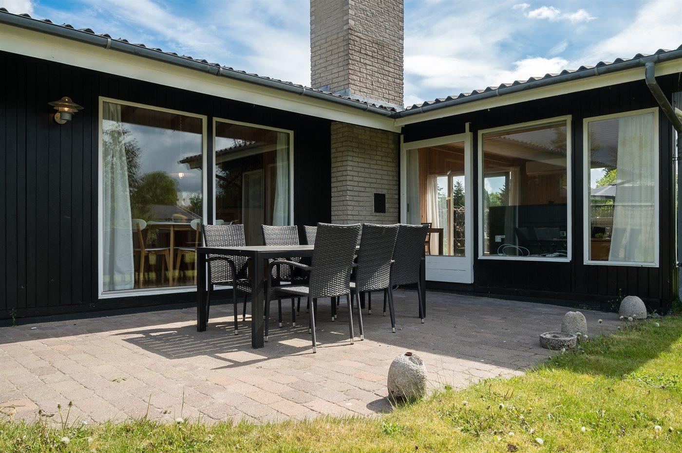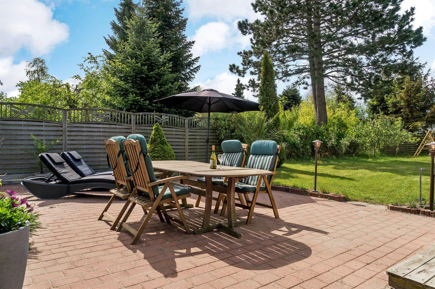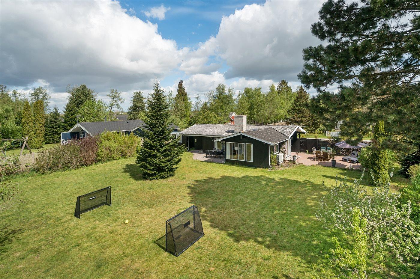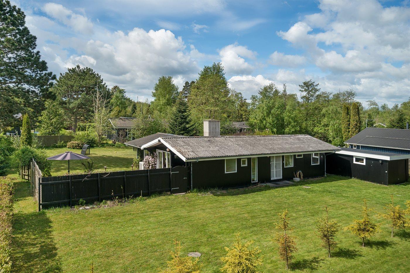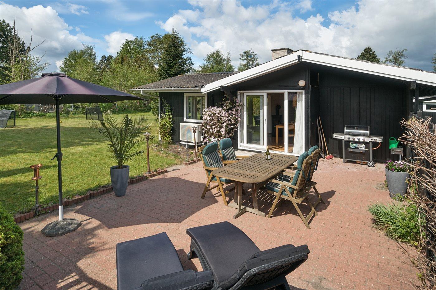 Fritidsbostaden ligger på en 1206 m² stor anlagd trädgård. Tomten är inhägnad. Avstånd till hav är 600 m. Närmeste affär ligger på ett avstånd av 300 m. Det finns en golfbana på ett avstånd av 1500 m. Till fritidsbostaden hör 70 m² terrass. Gunga. Fotbollsmål. Det finns grill til förfogande. Det finns uttag för att ladda elbil vid huset. P-plats på tomten.