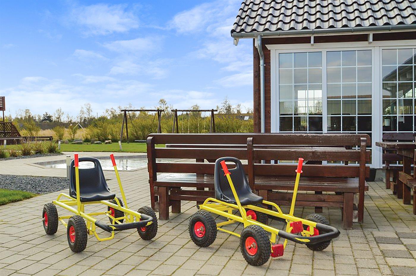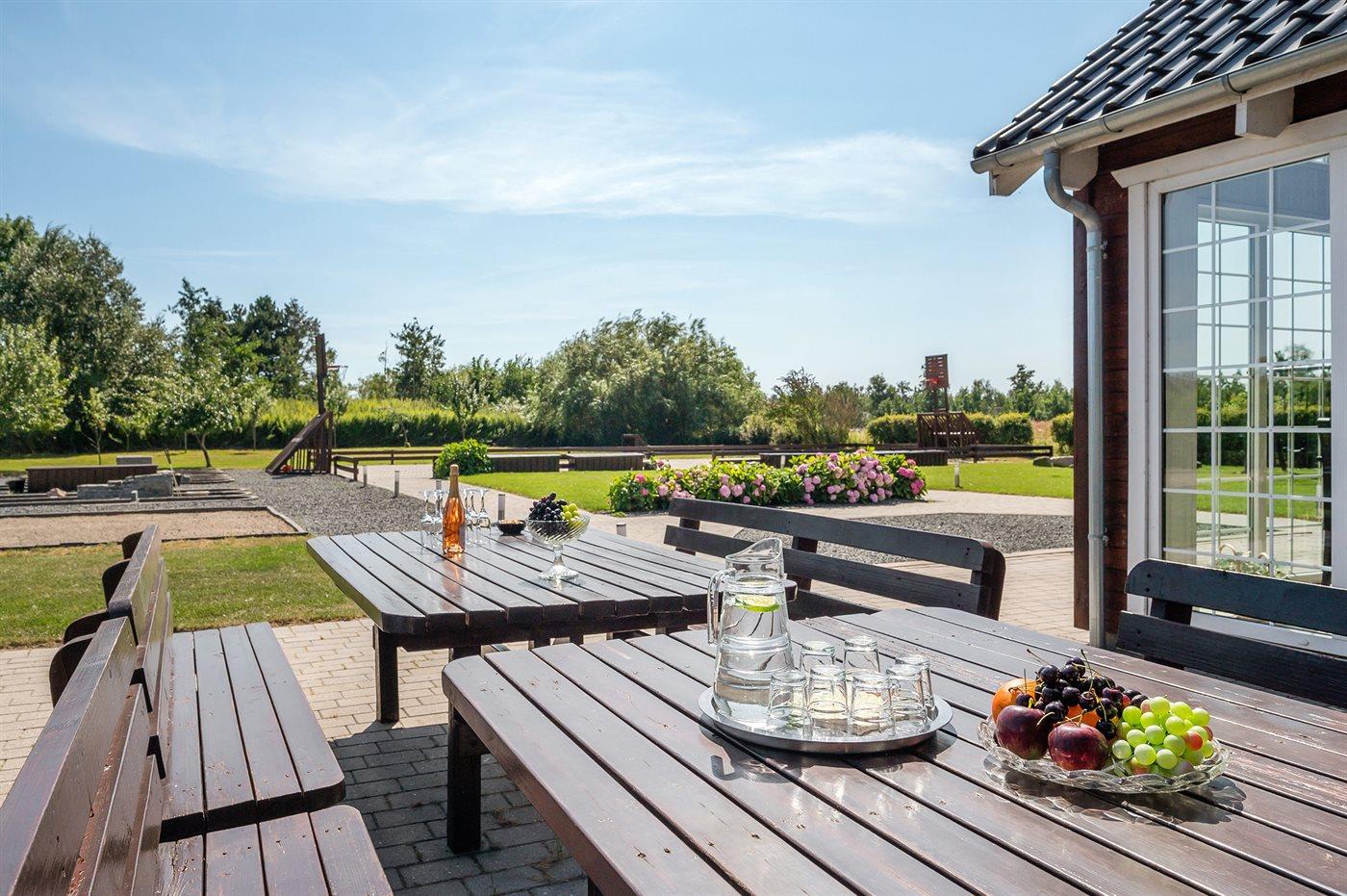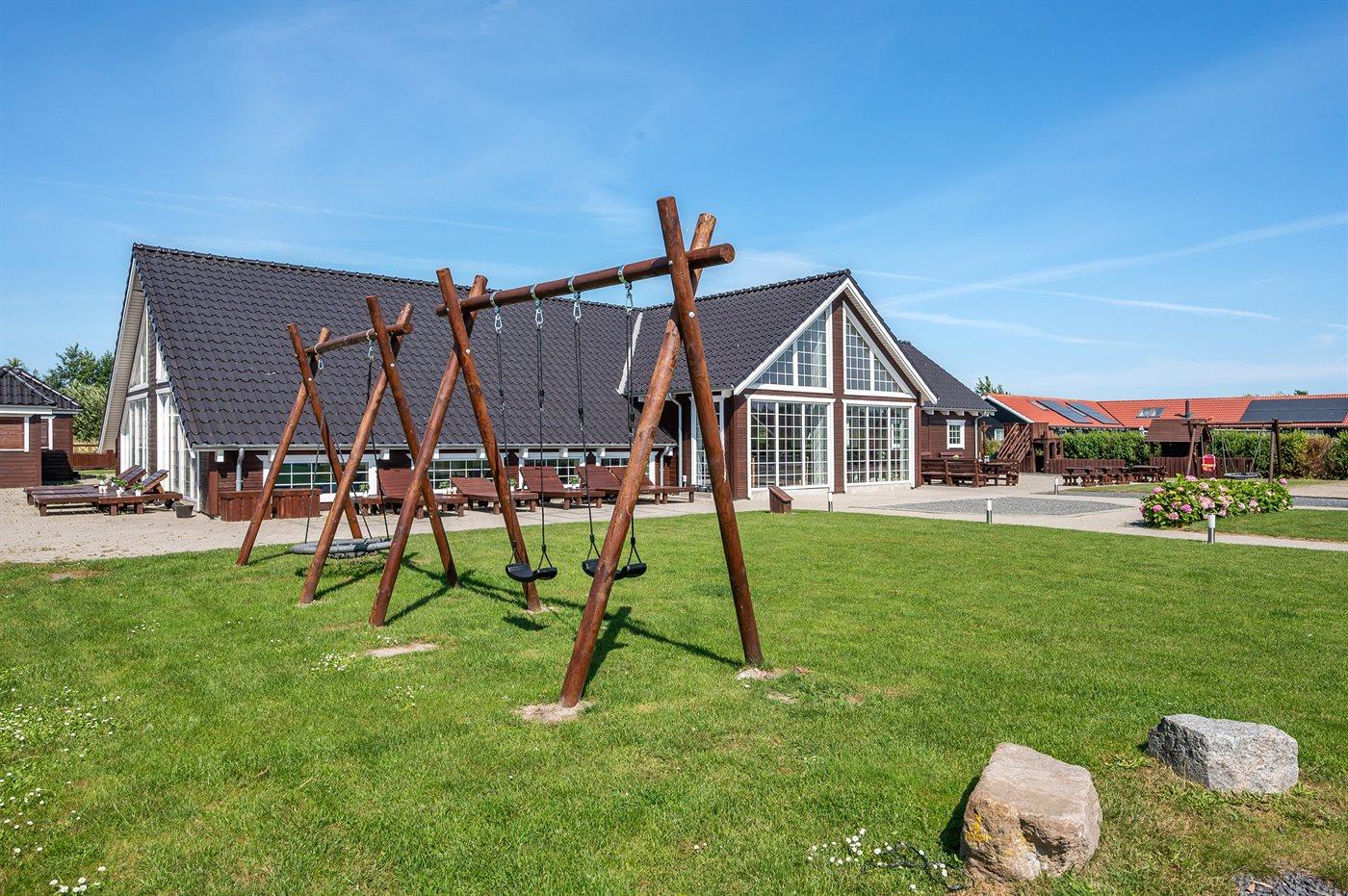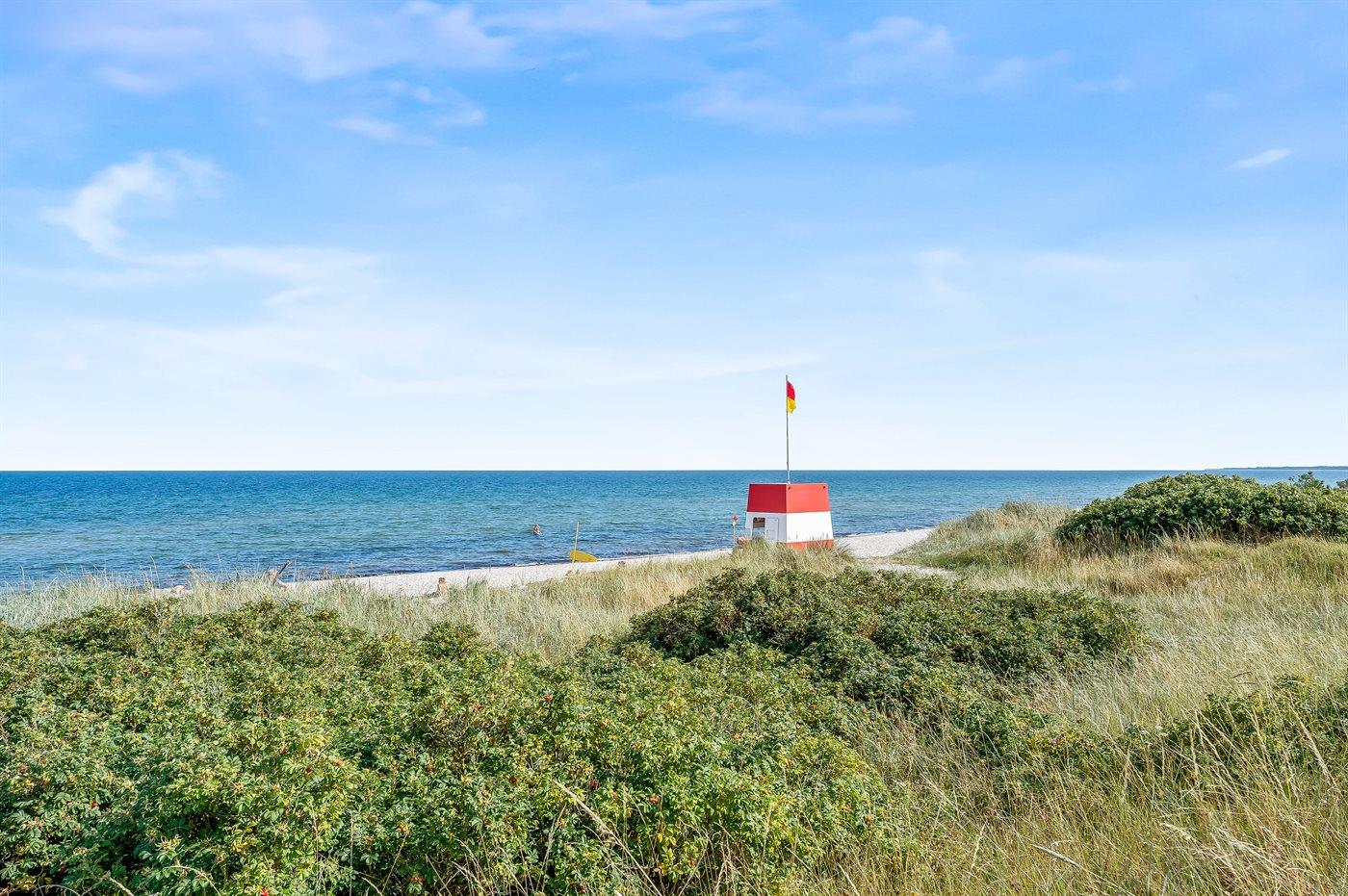 Fritidsbostaden ligger på en 2408 m² stor anlagd trädgård. Avstånd till hav är 900 m. Närmeste affär ligger på ett avstånd av 800 m. Till fritidsbostaden hör 500 m² terrass. Gunga. Sandlåda. Lekstuga. Lektorn. Rutschkana. Petanque. 18 hål minigolfbana. Fotbollsmål. Öppen spis. Det finns grill til förfogande. Det finns 2 uttag för att ladda elbiler vid huset. Kontakt typ ABB/typ 2 – 11 kW og 16 amp. P-plats på tomten.