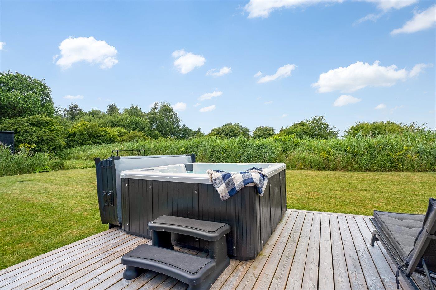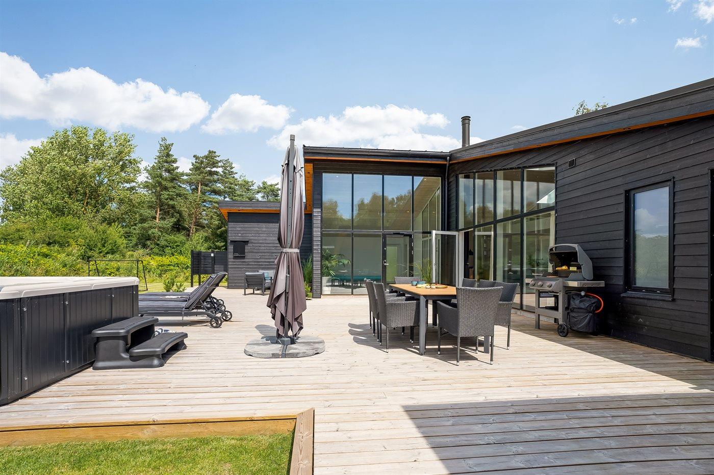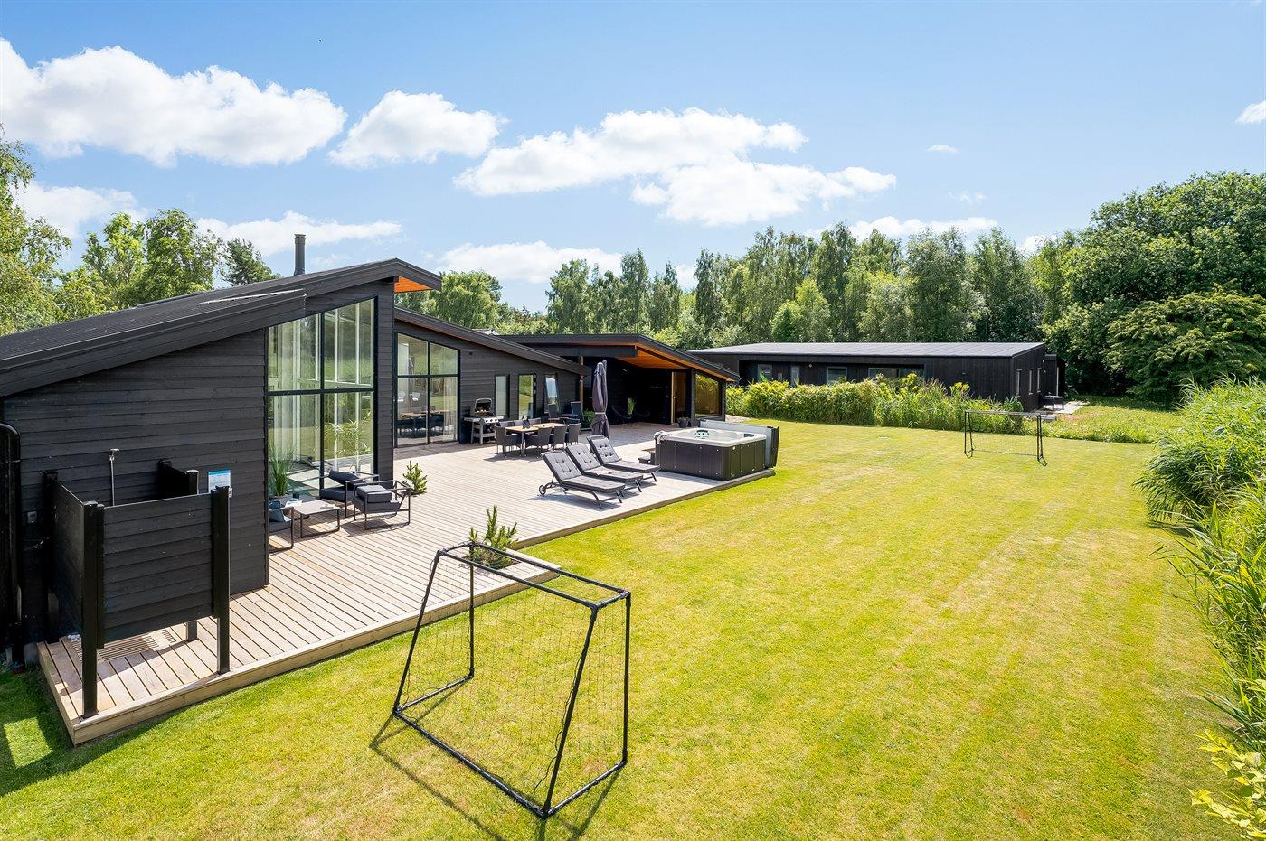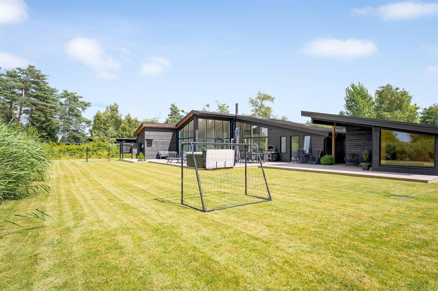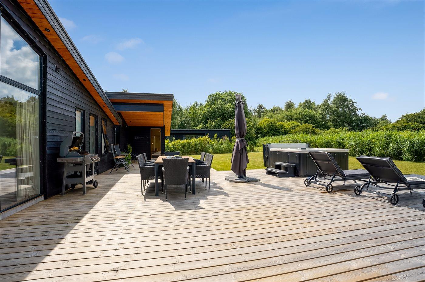 Fritidsbostaden ligger på en 940 m² stor anlagd trädgård. Avstånd till hav är 900 m. Närmeste affär ligger på ett avstånd av 400 m. Det finns en golfbana på ett avstånd av 2000 m. Till fritidsbostaden hör terrass. Dessutom finns det övertäckt terrass. Fotbollsmål. Avstånd till en lekplats er 1000 m. Utomhus sauna. Utomhus dusch. Det finns grill til förfogande. Det finns carport till förfogande. Det finns uttag för att ladda elbil vid huset. CEE kontakt. Med 11 kW laddningseffekt. P-plats på tomten.